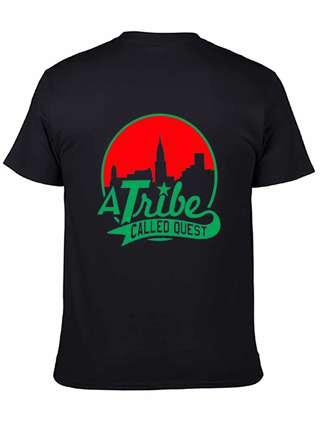 Show your love for legendary hip-hop with this A Tribe Called Quest t-shirt. This stylish black tee features a vibrant, eye-catching design of the group's logo in green, set against a red backdrop with a city silhouette. Made from a comfortable fabric, this shirt is perfect for everyday wear or for showing off your music taste at concerts, parties, or casual hangouts. The classic crew neck and short sleeves offer a relaxed fit for ultimate comfort. A must-have addition to any true hip-hop fan's wardrobe.