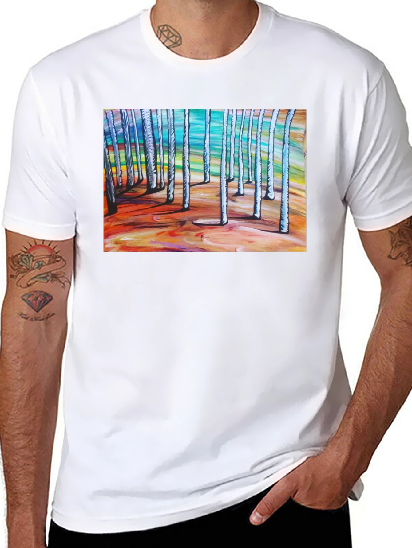 Show off your artistic side with this eye-catching black t-shirt featuring an abstract forest graphic. The vibrant design showcases a colorful landscape of birch-like trees in a unique, painterly style. Made from comfortable, breathable cotton, this tee is perfect for everyday wear. The striking design is sure to turn heads and spark conversation. Dress it up with a blazer for a casual-chic look or keep it casual with jeans and sneakers. A must-have for art lovers and anyone who wants to add a pop of color to their wardrobe. Available in various sizes.