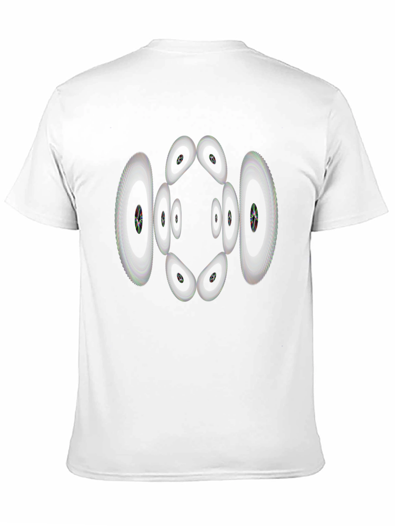 This stylish black t-shirt features an eye-catching, abstract geometric design. The intricate pattern, resembling a series of interconnected, distorted lenses or gears, creates a visually dynamic and modern look. The design is printed on what appears to be a soft, comfortable cotton blend fabric, perfect for everyday wear. The shirt has a classic crew neck and short sleeves, making it a versatile addition to any wardrobe. Ideal for those who appreciate unique and contemporary graphic tees, this shirt is sure to make a statement. Pair it with jeans or shorts for a casual yet fashionable outfit. Enjoy a comfortable fit with standout style!