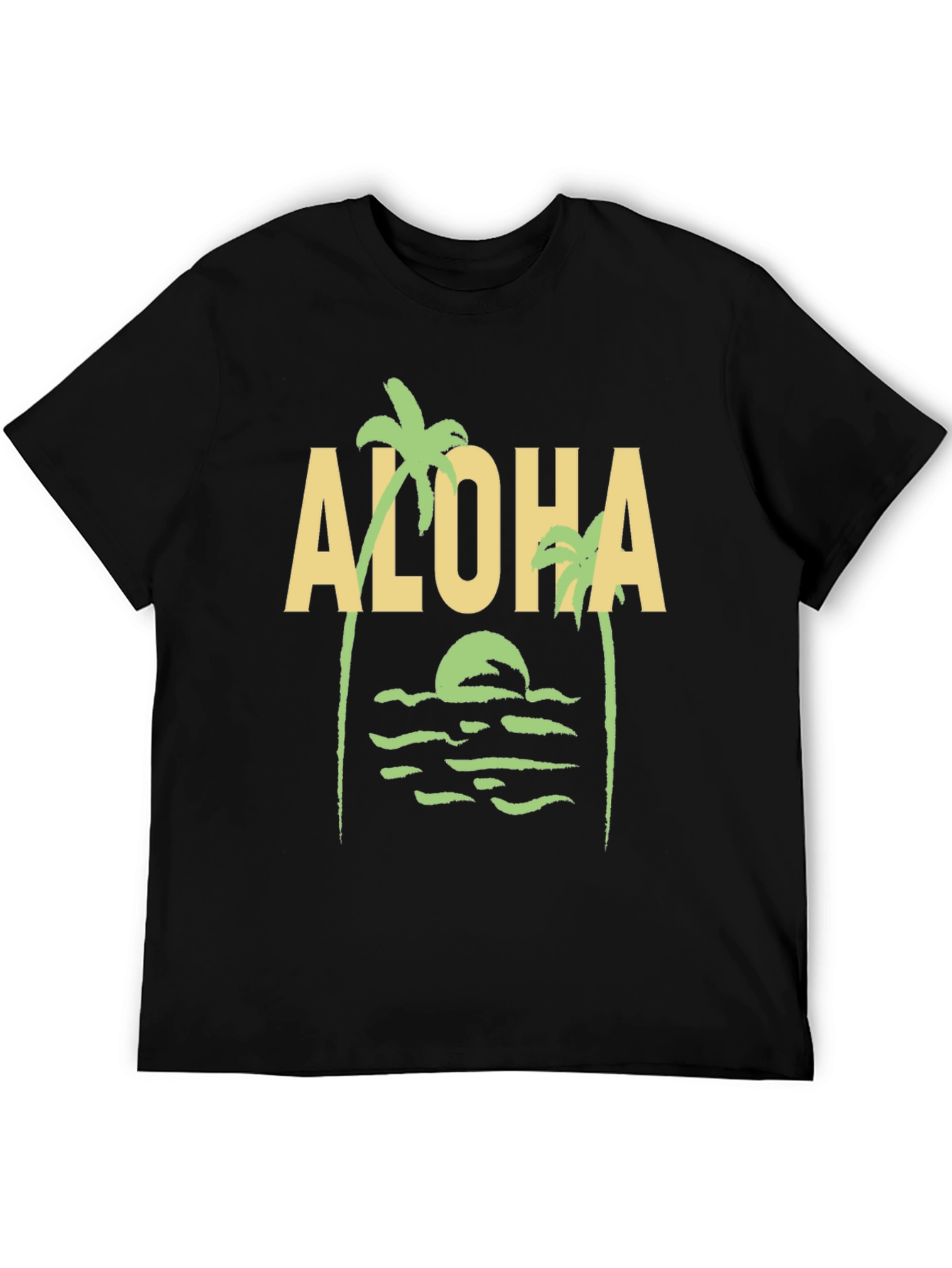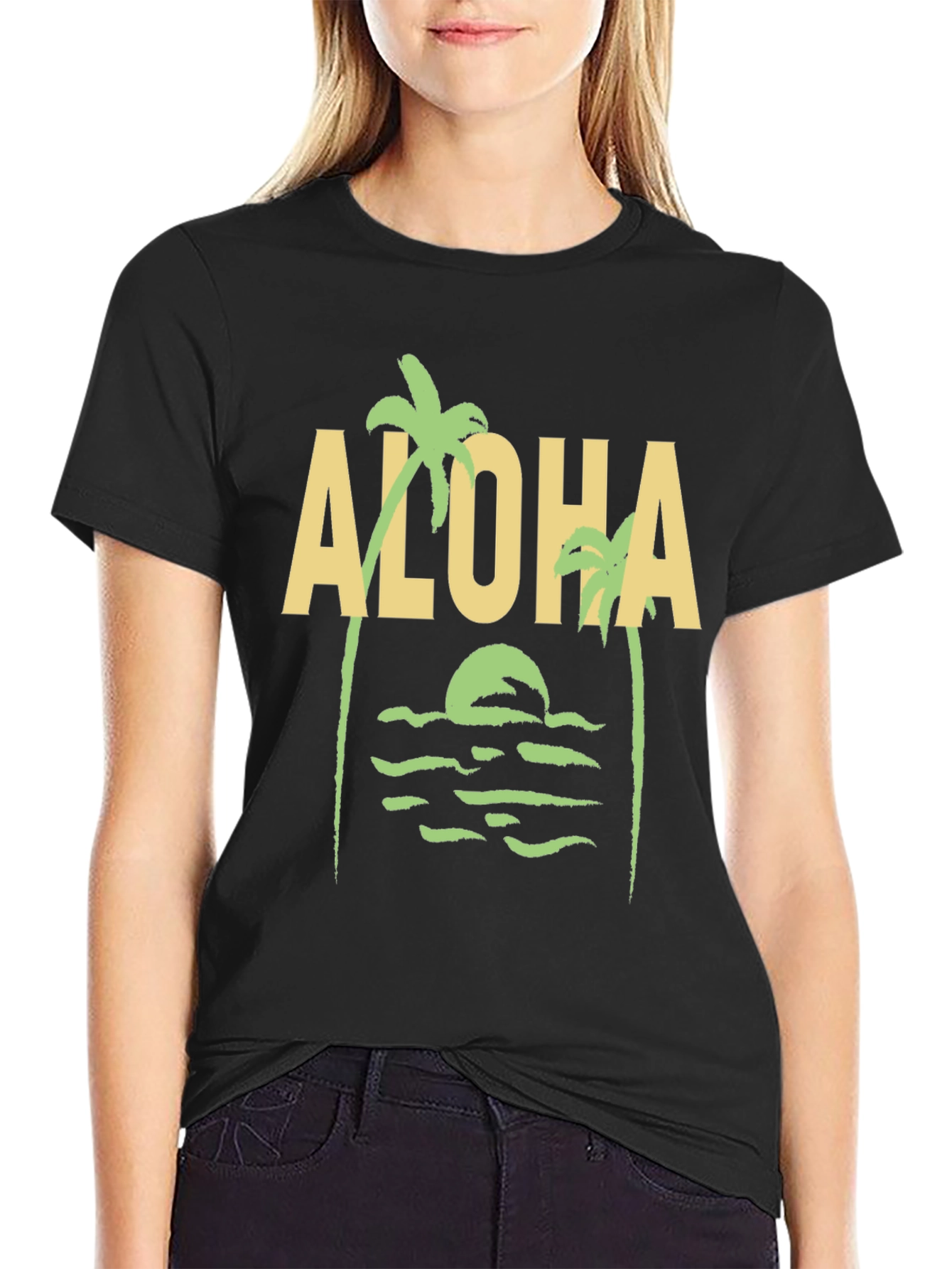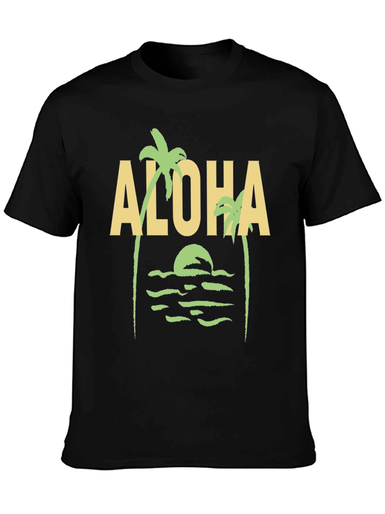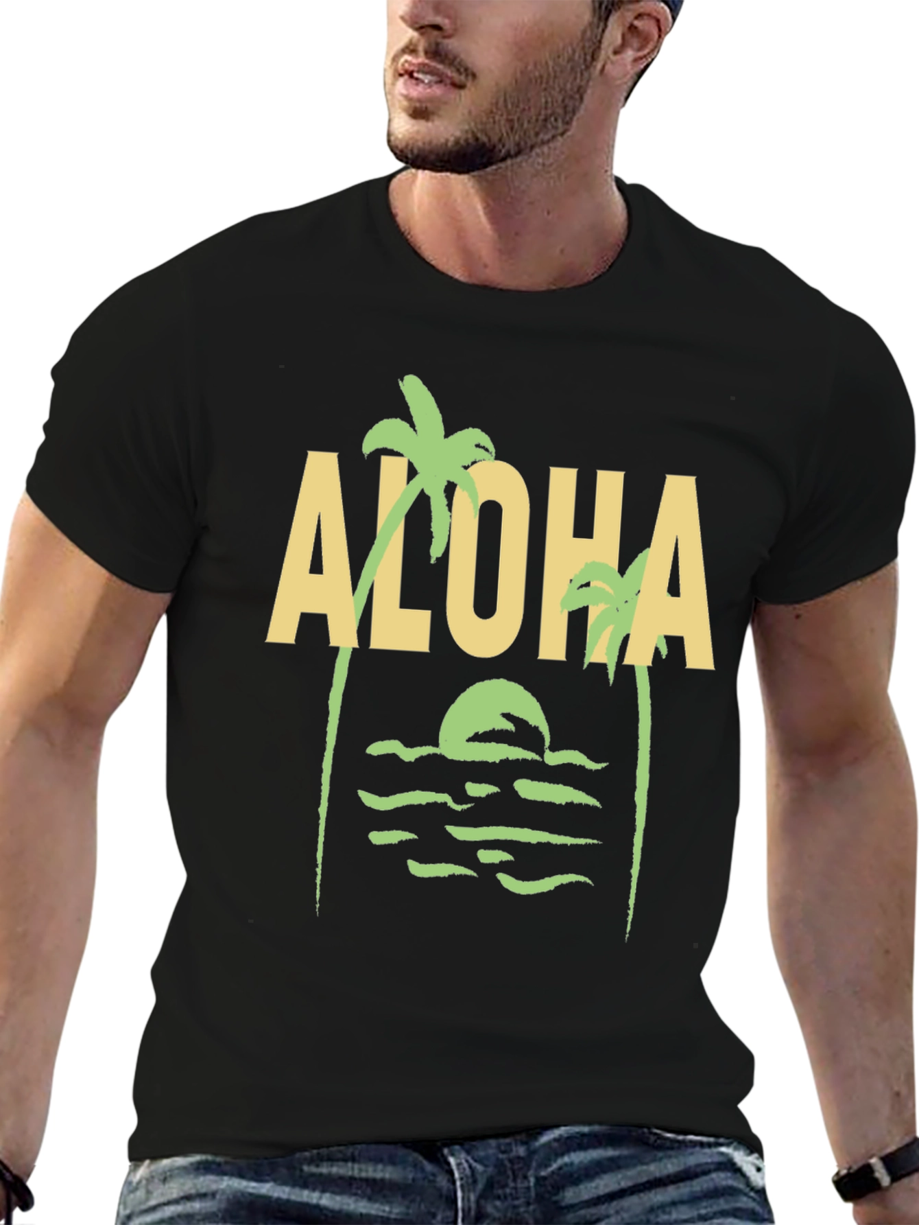 Embrace island vibes with this stylish black graphic tee. The design features the word 'ALOHA' in a bold tan font, playfully integrated with palm tree illustrations. A unique sunset and wave graphic adds a touch of the tropics. Made from a comfortable fabric, this tee is perfect for casual wear, beach outings, or summer adventures. Stand out with this cool, eye-catching design. Whether you're longing for a vacation or want to bring a touch of paradise to your everyday style, this Aloha tee is a must-have.