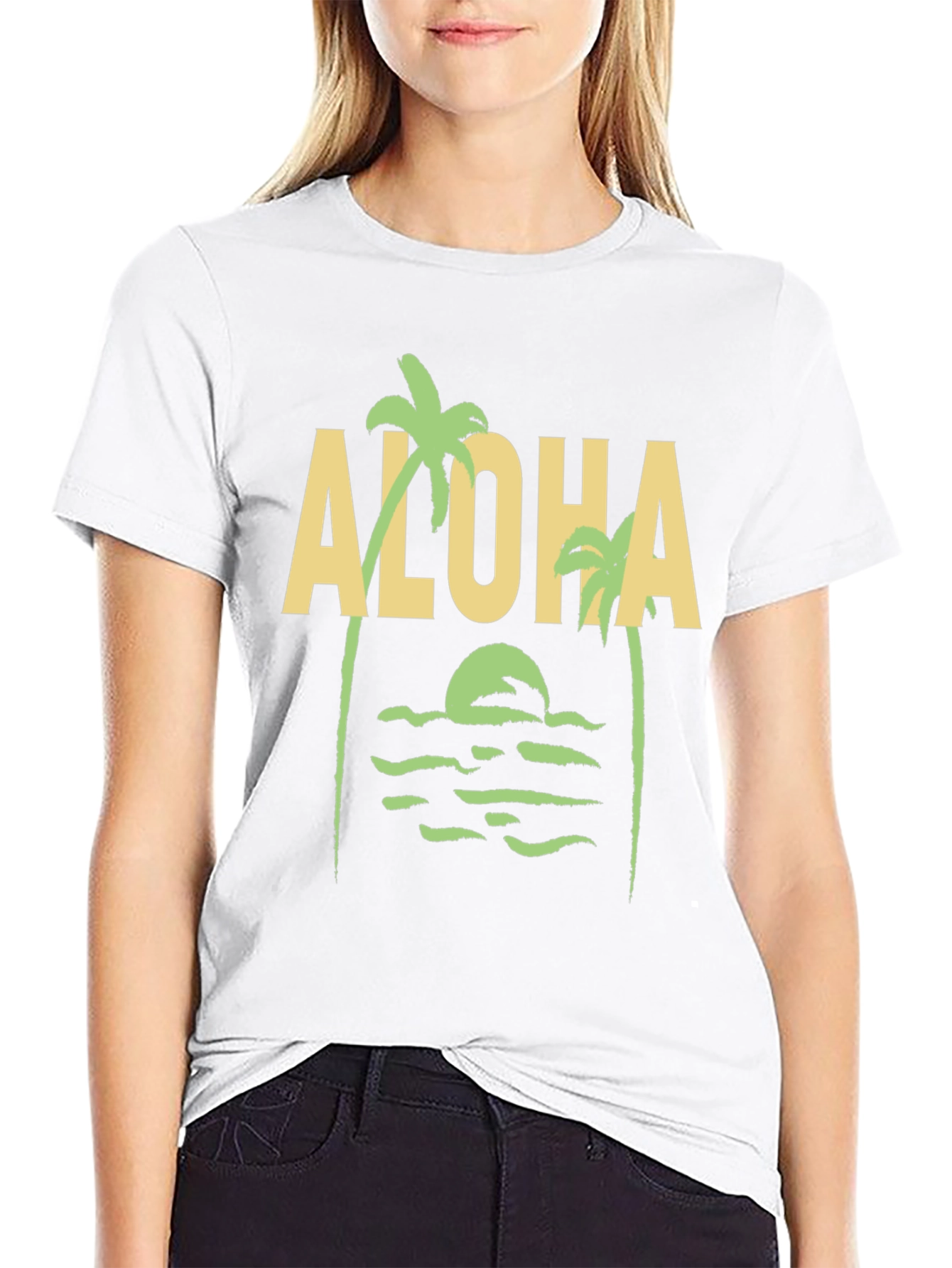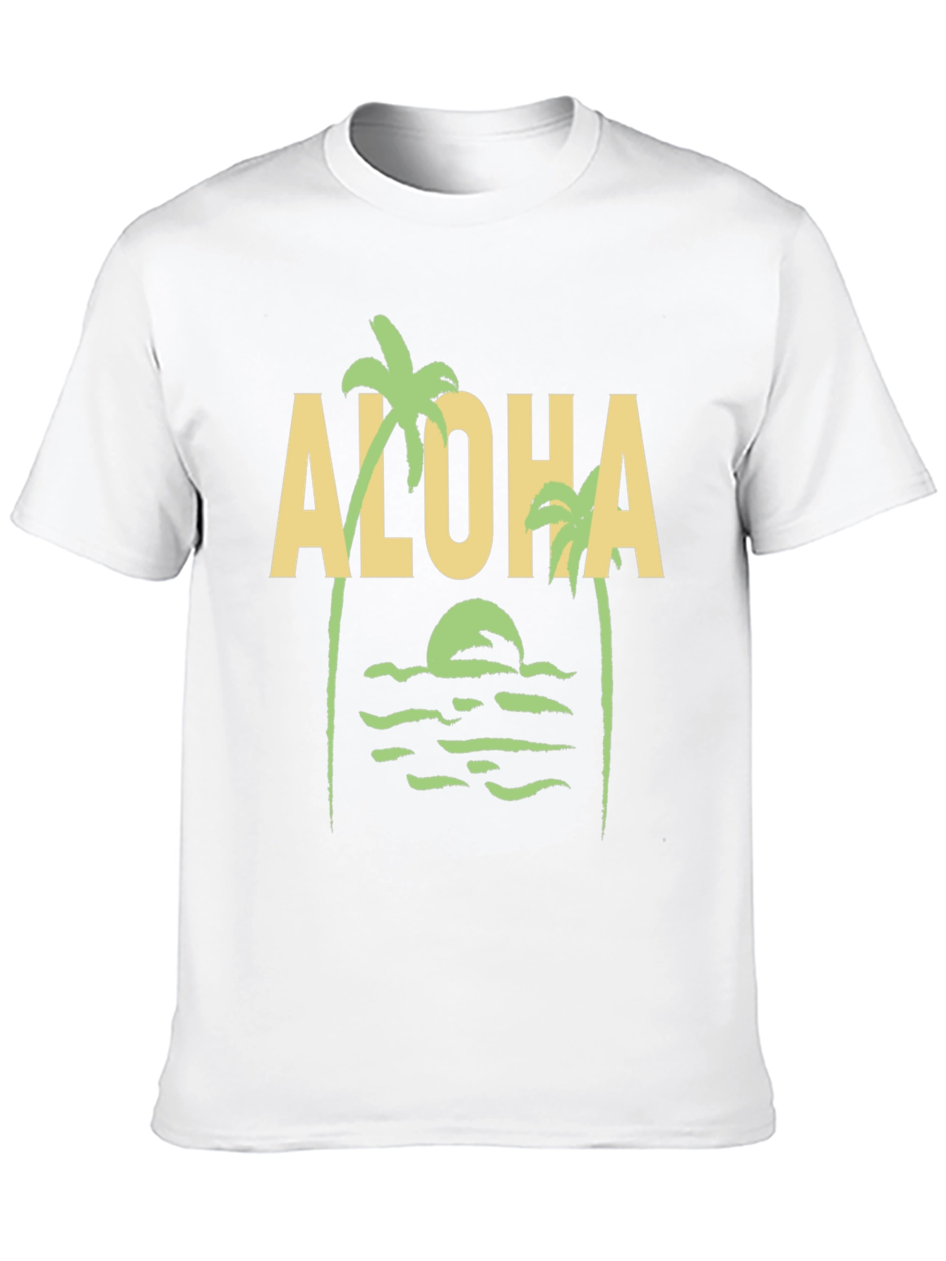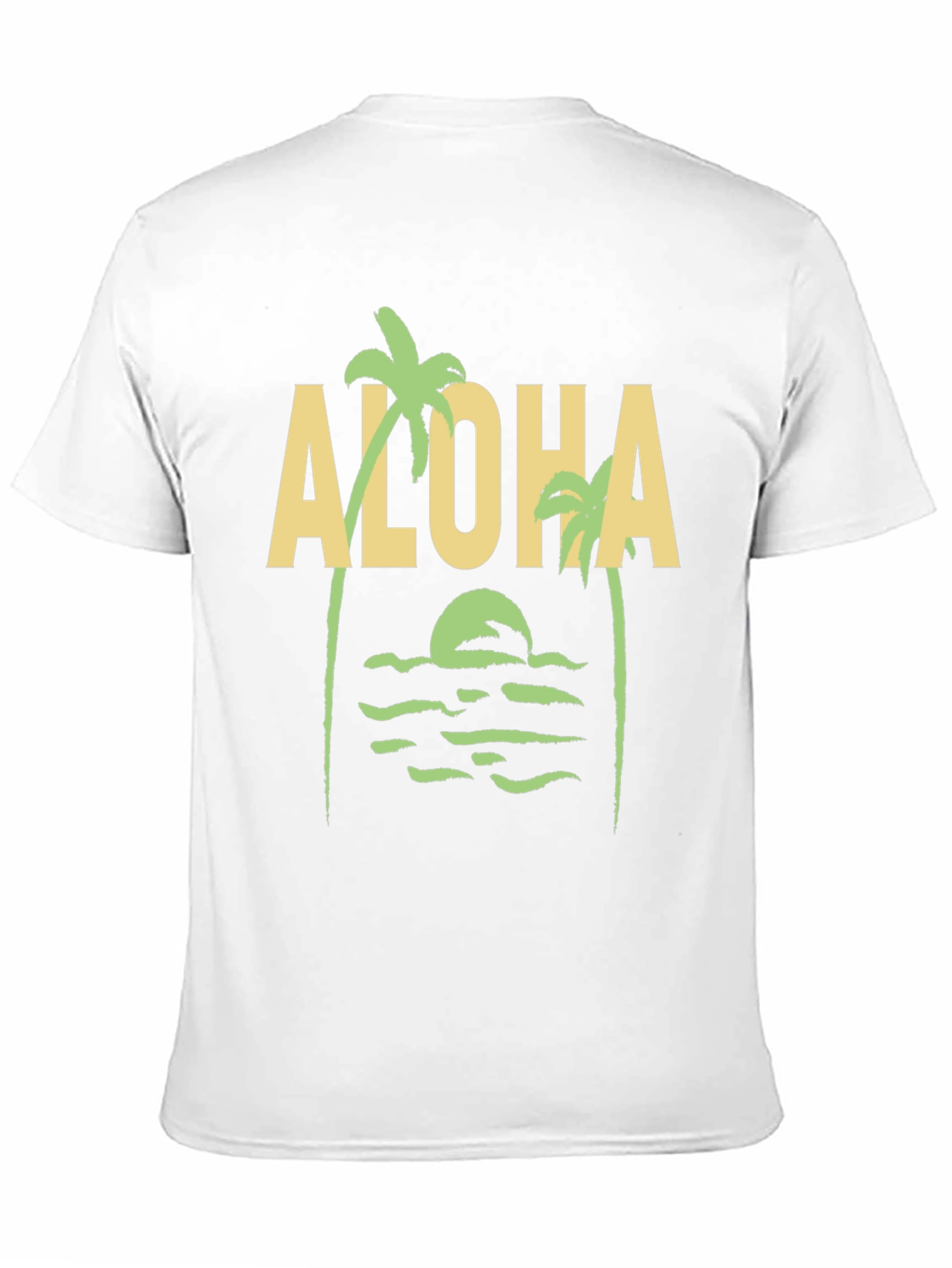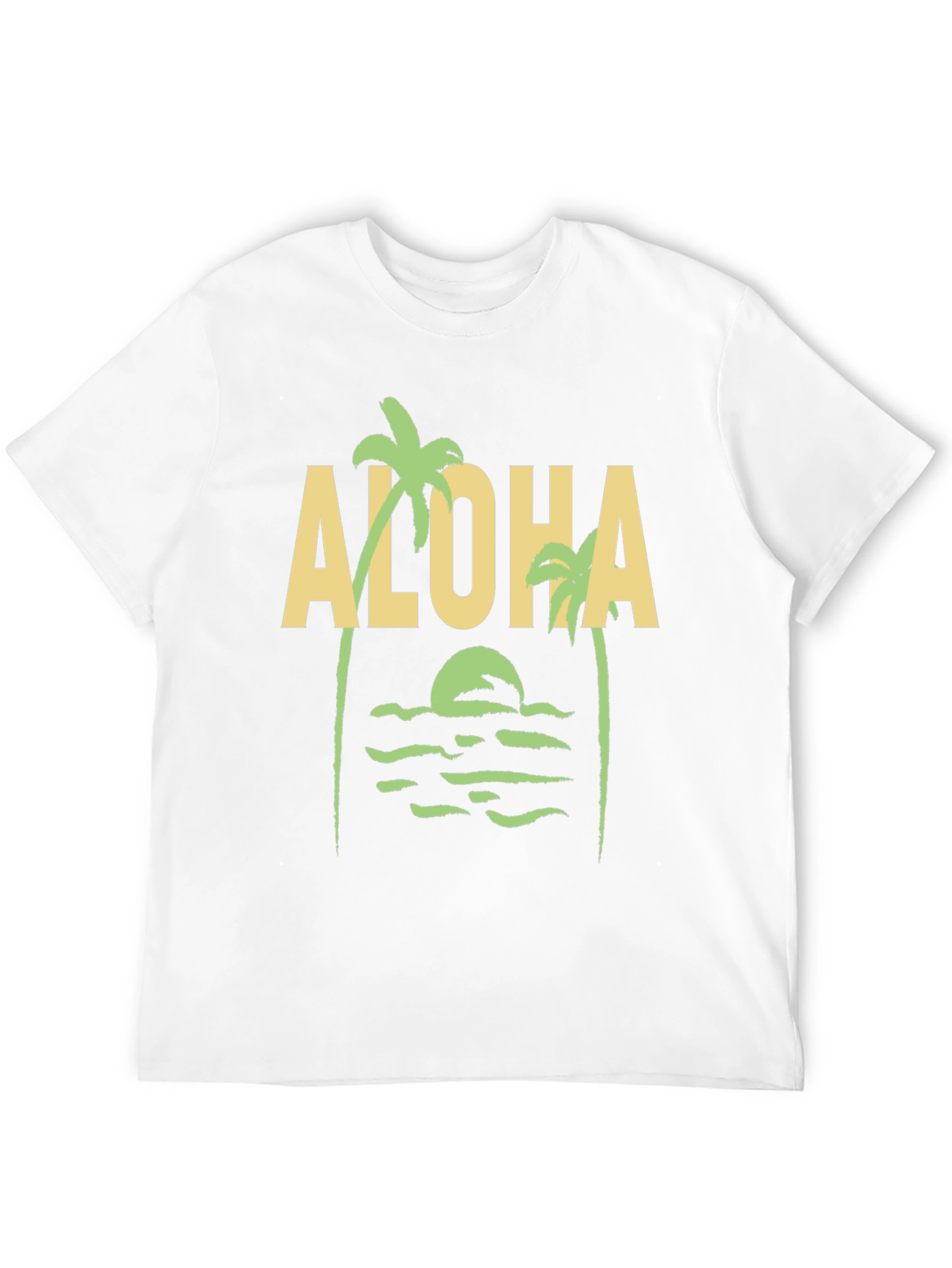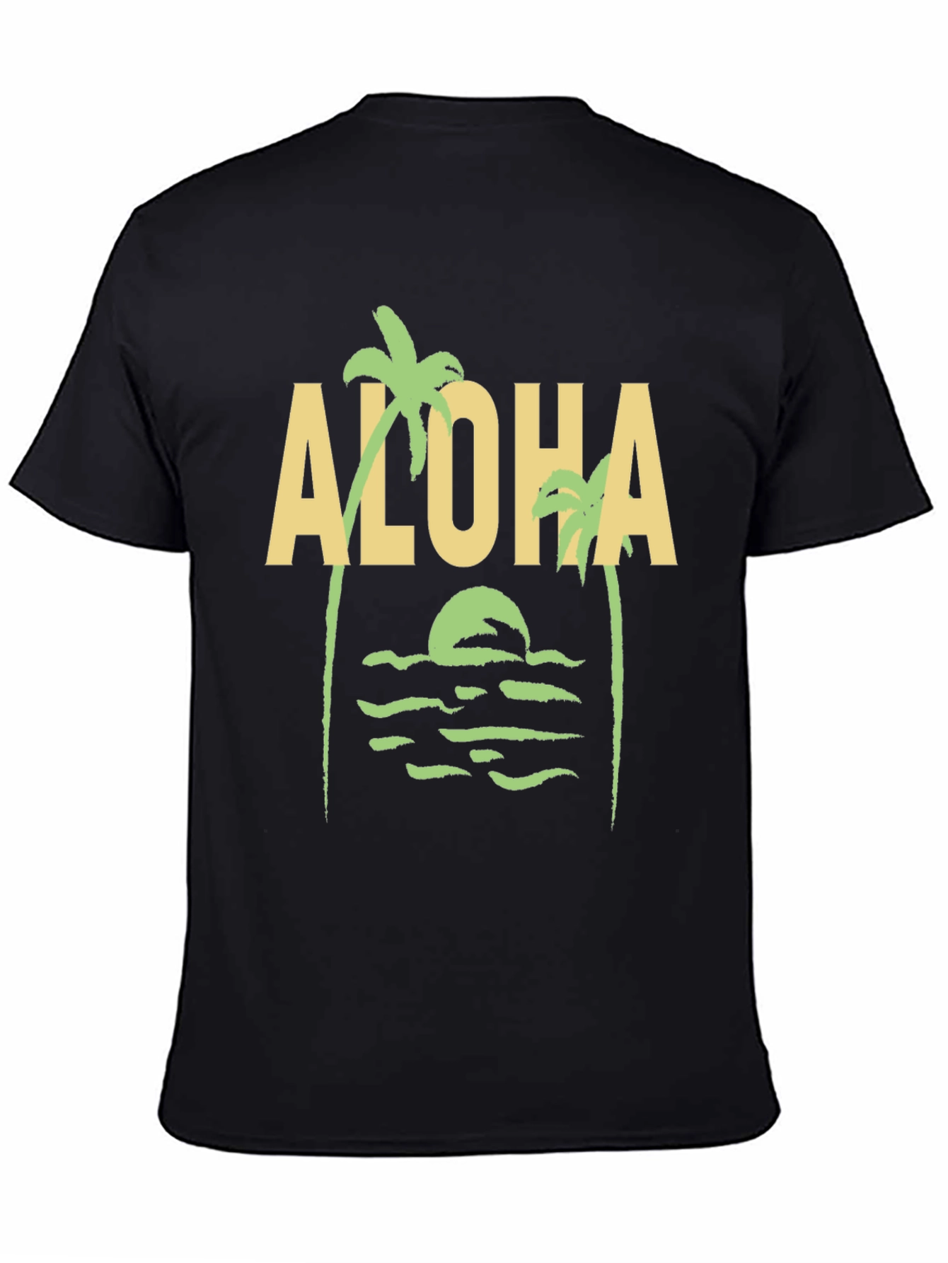 Embrace island vibes with this stylish black graphic tee. The design features the word 'ALOHA' in a bold tan font, playfully integrated with palm tree illustrations. A unique sunset and wave graphic adds a touch of the tropics. Made from a comfortable fabric, this tee is perfect for casual wear, beach outings, or summer adventures. Stand out with this cool, eye-catching design. Whether you're longing for a vacation or want to bring a touch of paradise to your everyday style, this Aloha tee is a must-have.