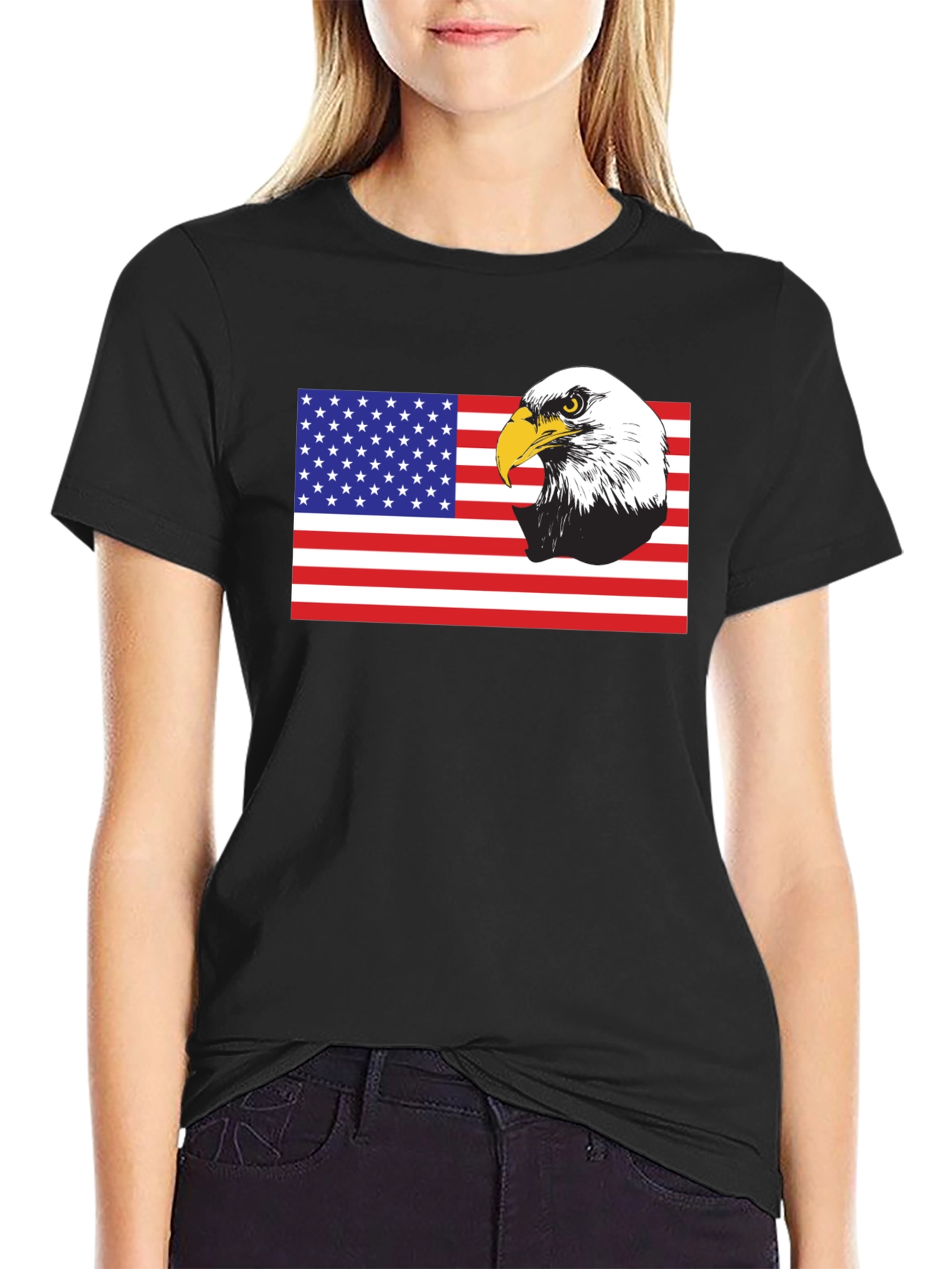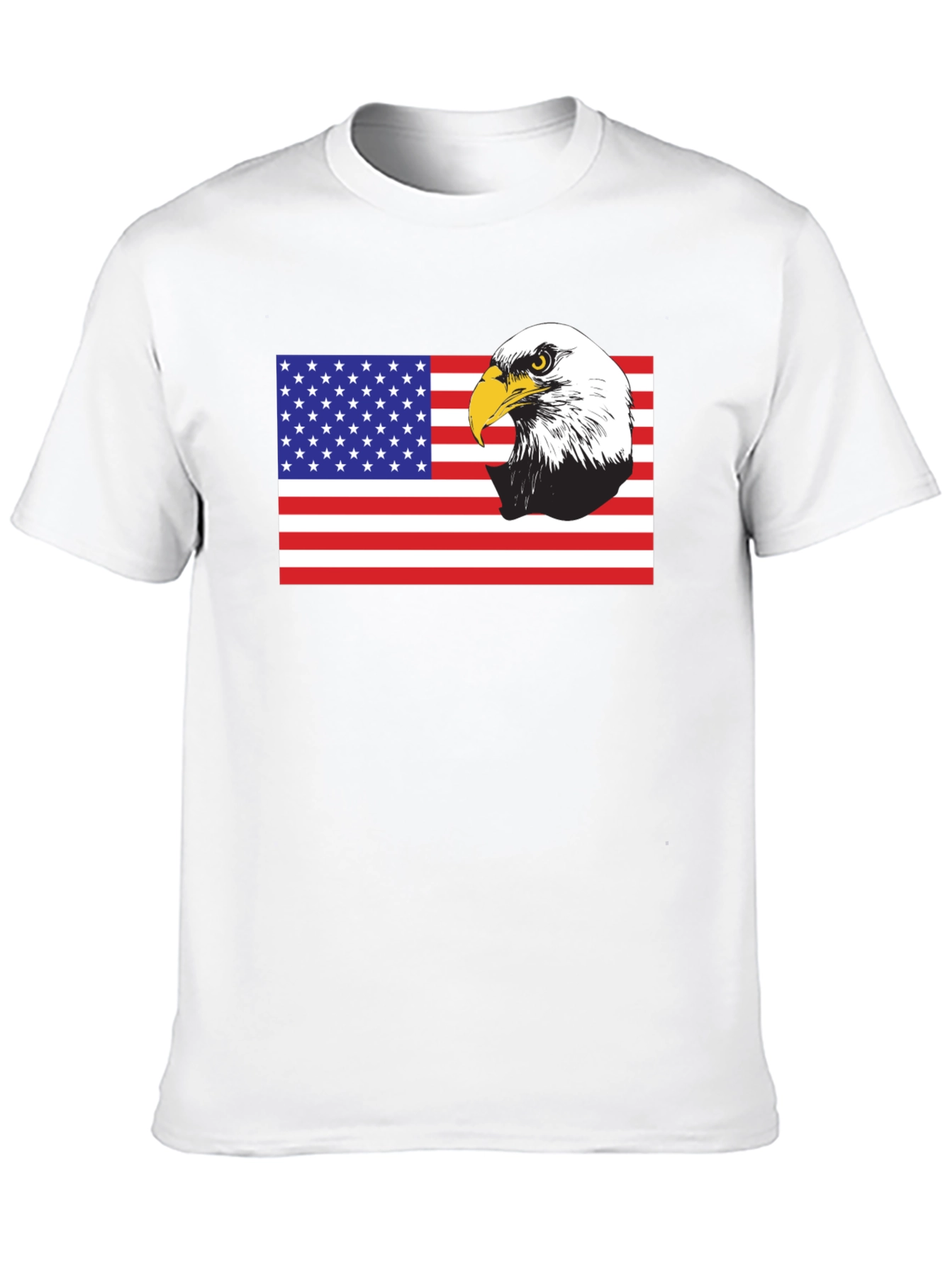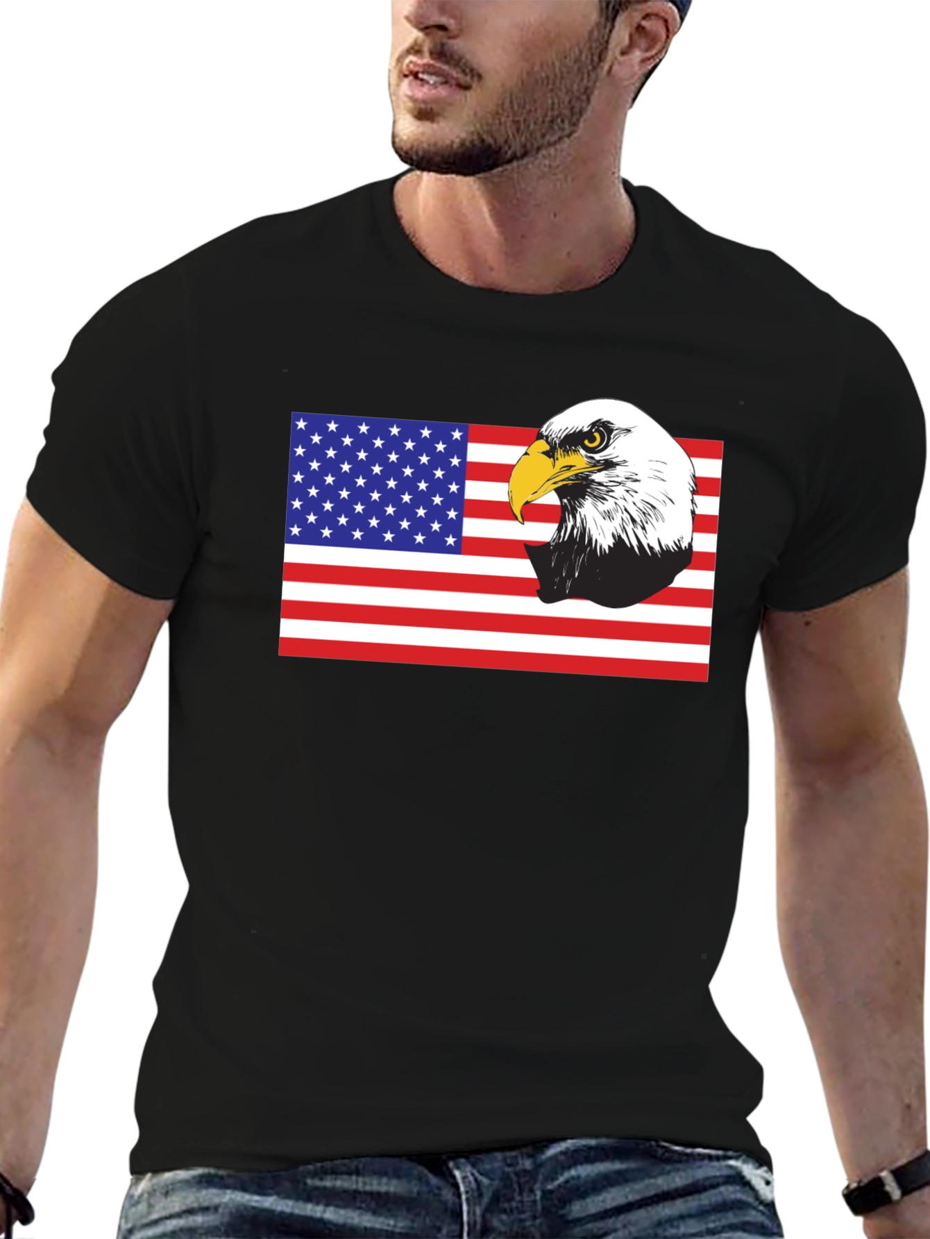 Show your American pride with this striking graphic t-shirt. The shirt features a bold design of the American flag with a majestic bald eagle head integrated into the stripes. Made from what appears to be a comfortable, breathable fabric, this tee is perfect for everyday wear. The design is eye-catching and makes a statement. Ideal for casual outings, patriotic events, or simply expressing your love for the USA. Makes a great gift for veterans, patriots, or anyone who appreciates unique American-themed apparel. The shirt has a standard fit and short sleeves for comfort and ease of movement.