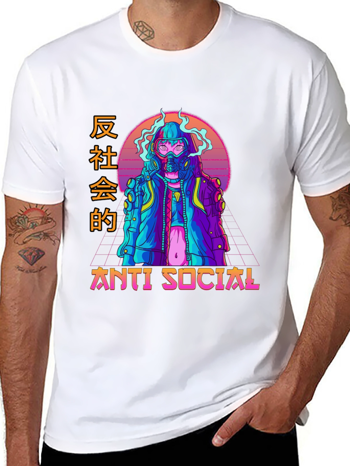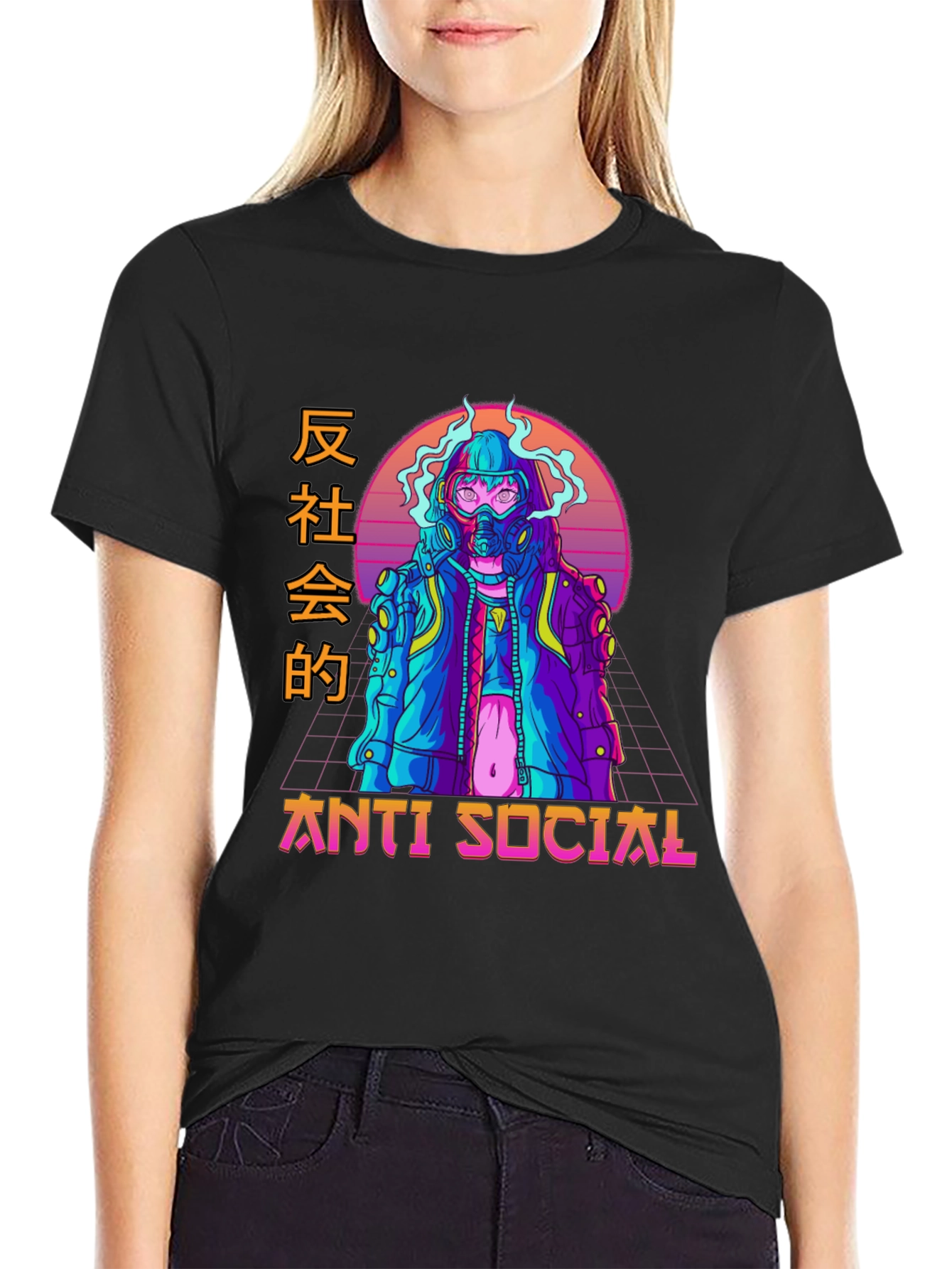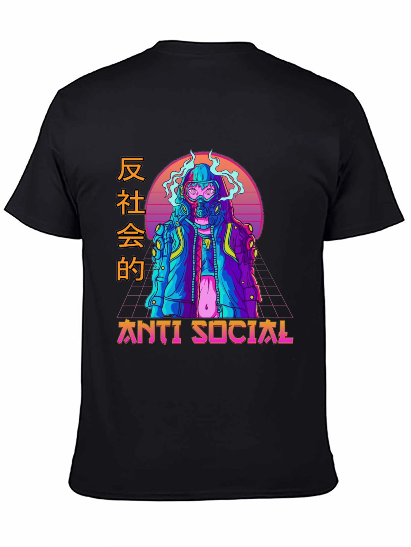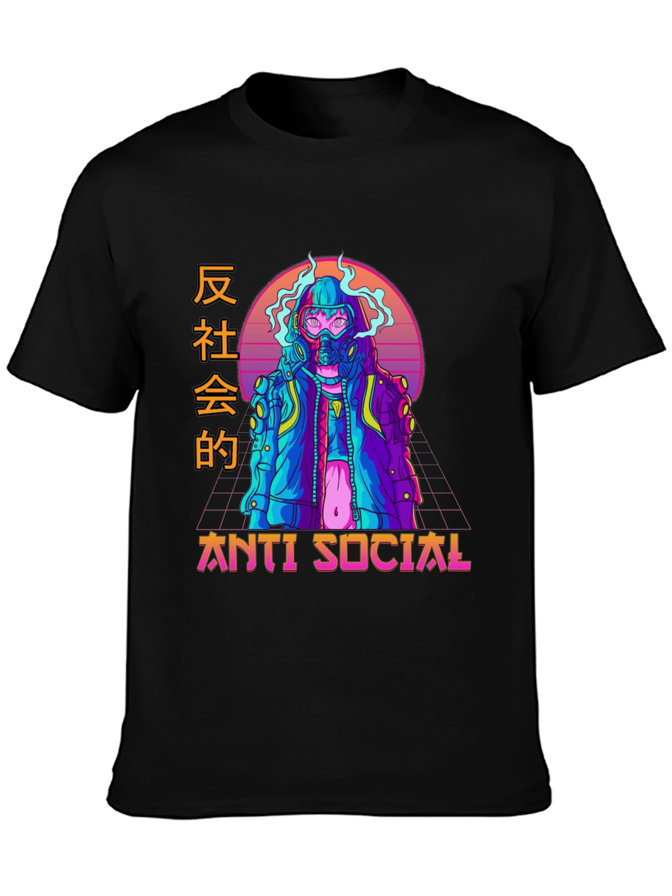 Embrace the future with this eye-catching black t-shirt featuring a vibrant cyberpunk design. The graphic includes a stylized figure wearing a gas mask and futuristic clothing, set against a retro-wave sunset background and grid pattern. Japanese text adds an edgy, international flair. Made from comfortable, breathable fabric, this tee is perfect for casual wear, gaming events, or making a bold statement. Stand out from the crowd with this unique and trendy piece of wearable art.