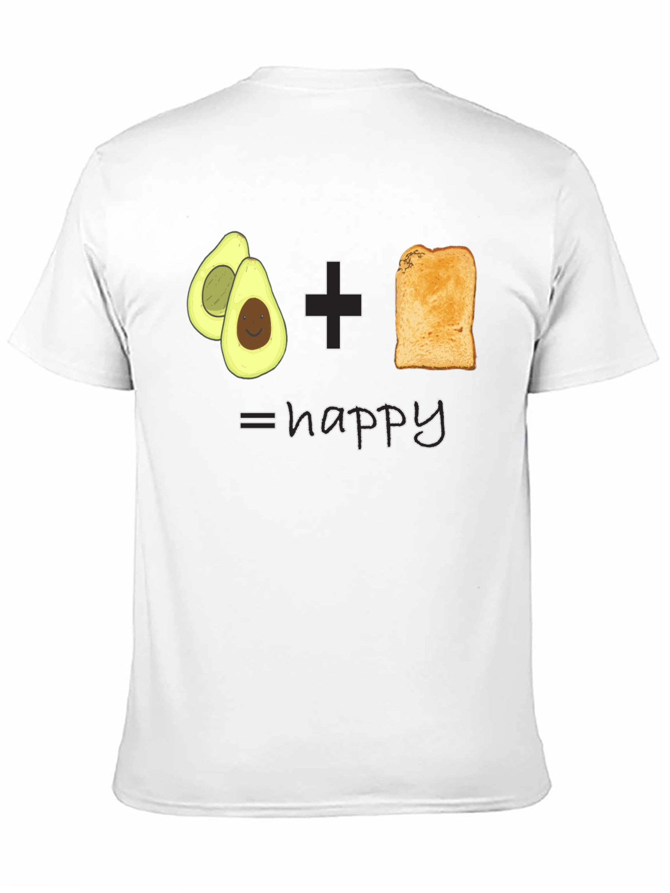 Show your love for everyone's favorite brunch with this fun graphic tee. This black t-shirt features a vibrant graphic of avocados plus toast equals 'happy'. Made from a soft, comfortable fabric, this t-shirt is perfect for everyday wear. Whether you're heading to a casual get-together, running errands, or just lounging at home, this tee is a great way to showcase your fun personality. It's a conversation starter and a must-have for avocado toast enthusiasts!
