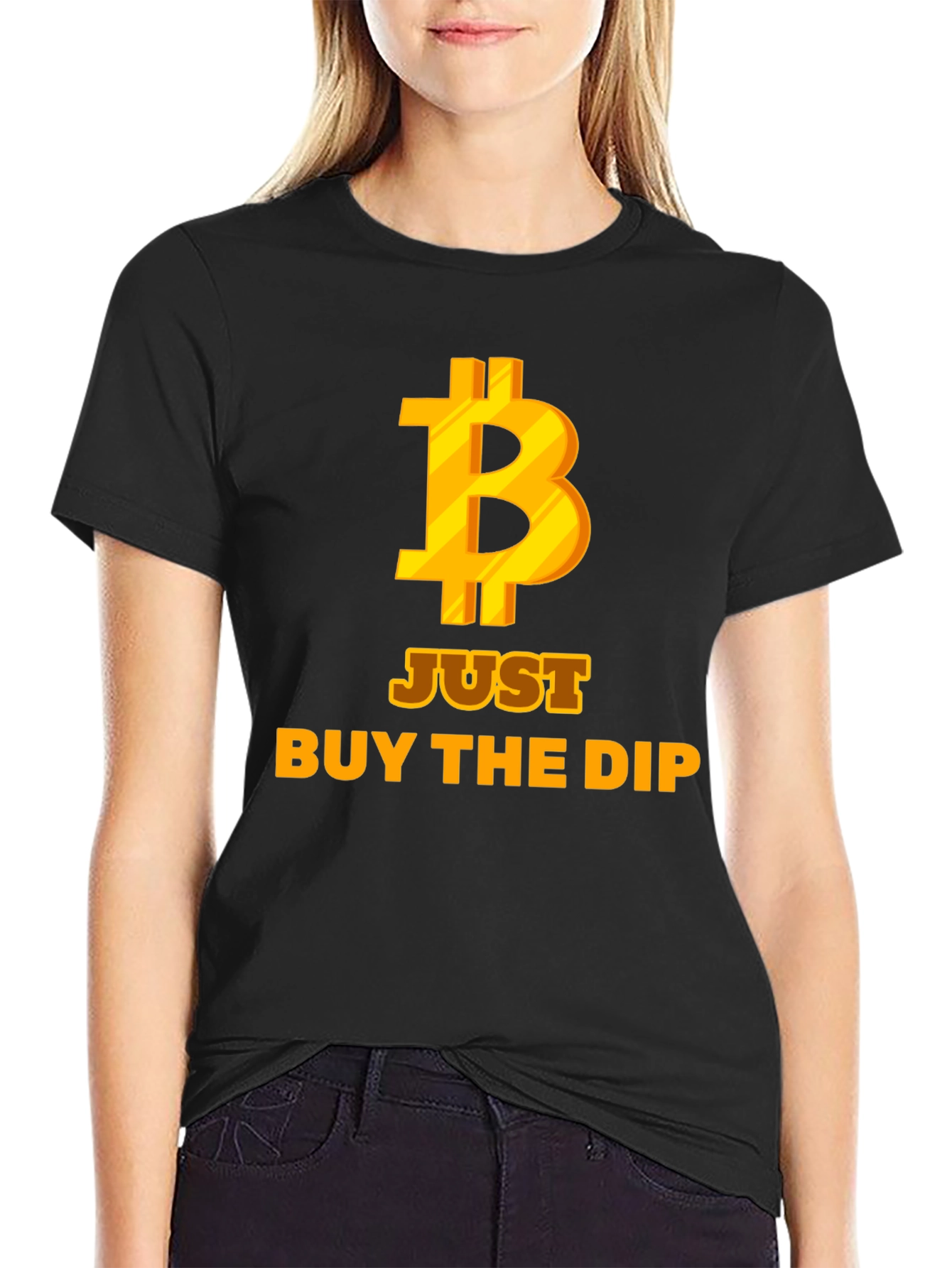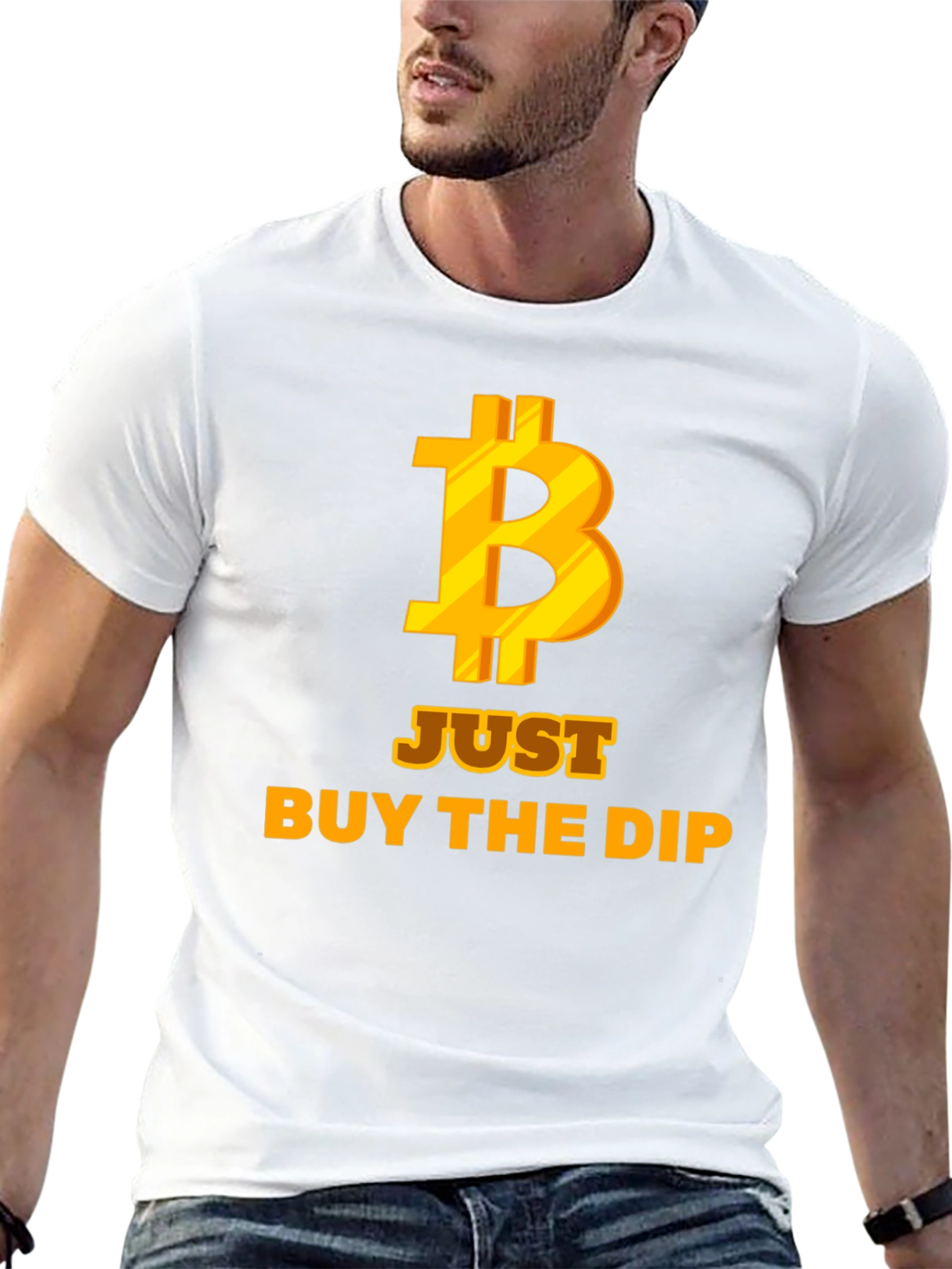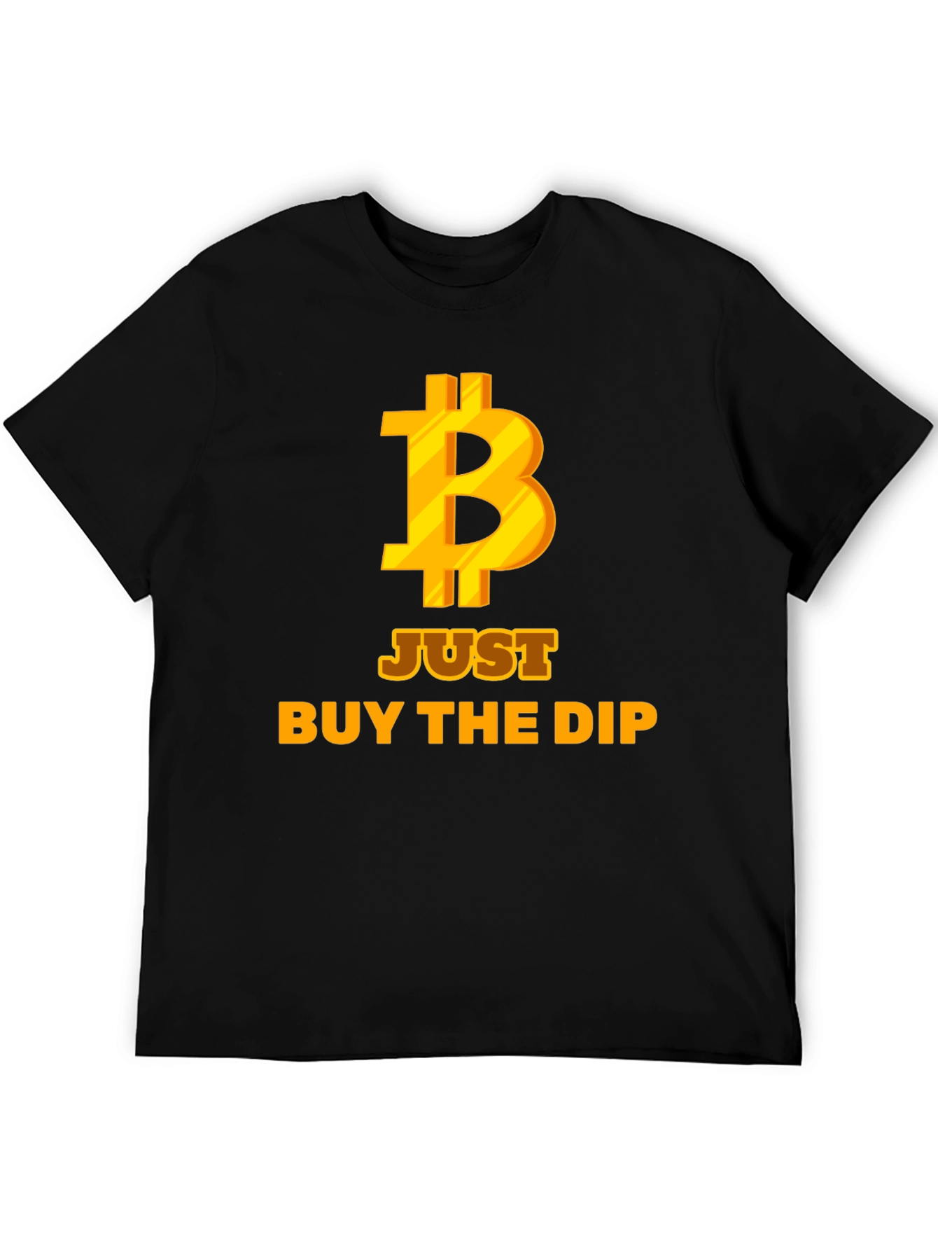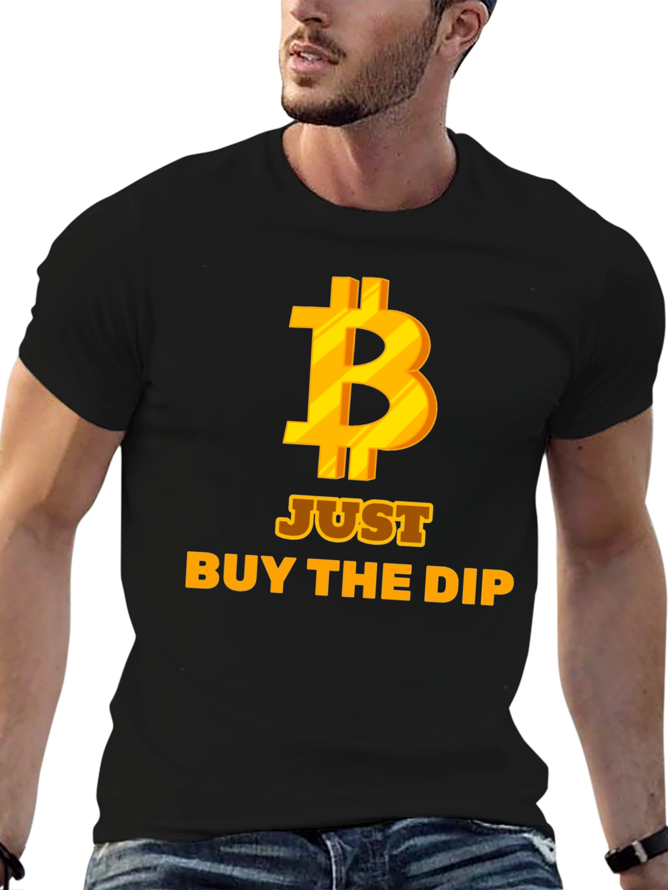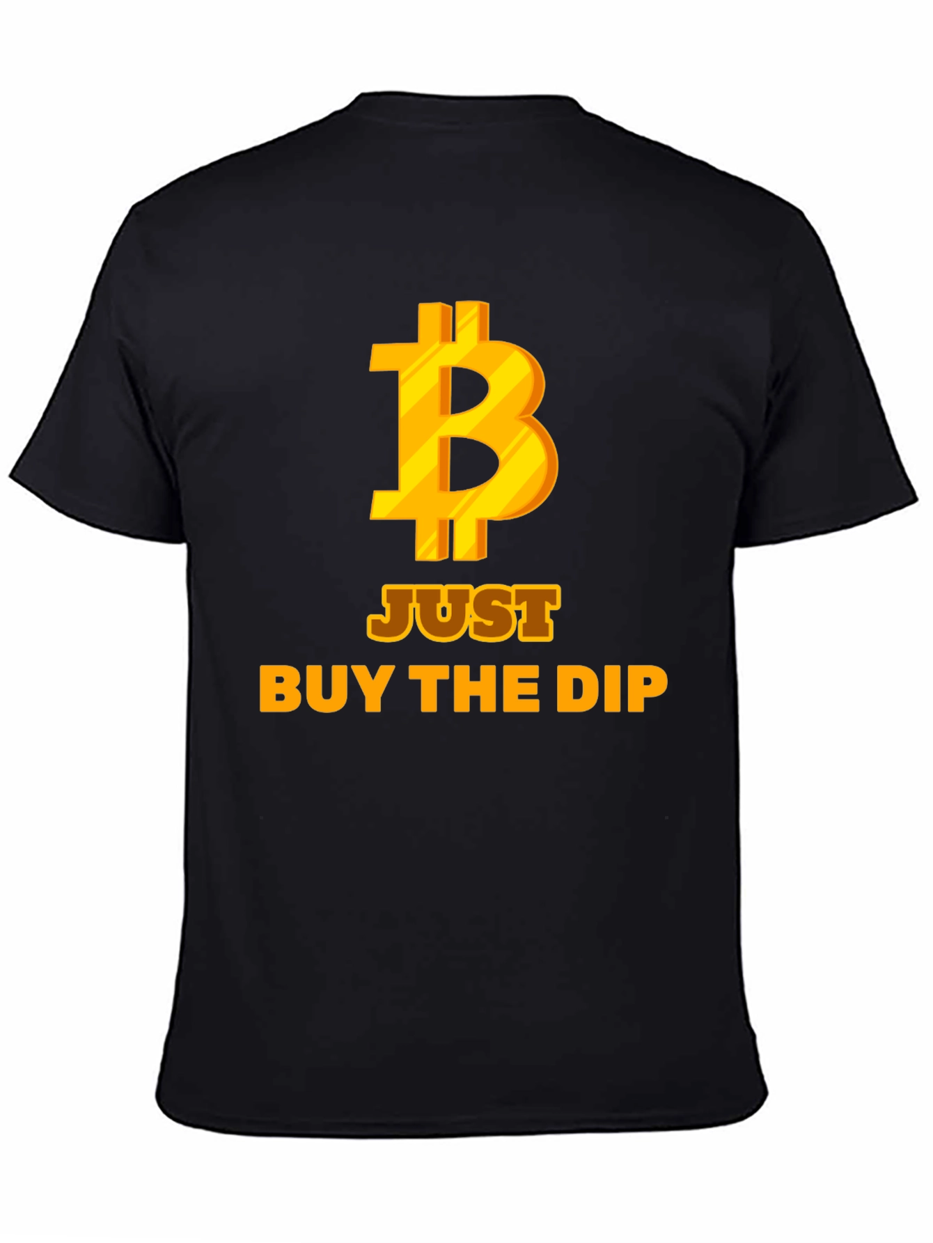 This stylish black t-shirt features a large, eye-catching Bitcoin symbol in vibrant gold tones. Below the Bitcoin logo, the phrase "JUST BUY THE DIP" is emblazoned in matching gold lettering, making a bold statement. The shirt's classic cut and comfortable fabric make it ideal for everyday wear. Perfect for Bitcoin enthusiasts and crypto investors, this t-shirt is a great conversation starter and a fun way to show your support for cryptocurrency. Wear it to meetups, conferences, or just around town to express your belief in the future of digital currency.