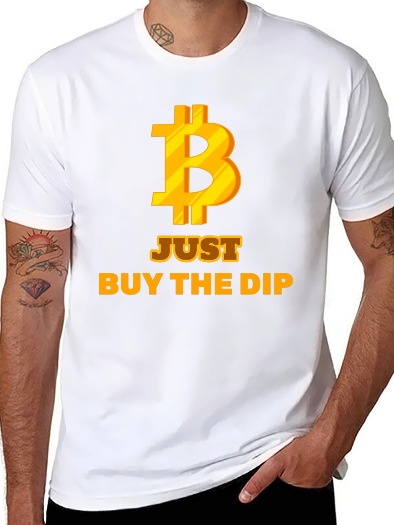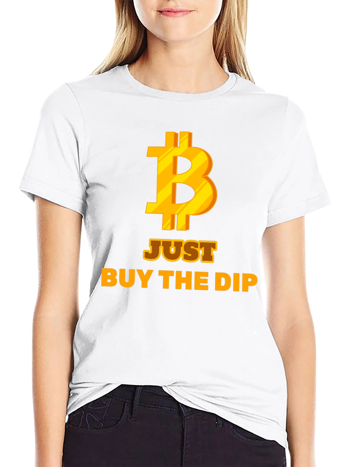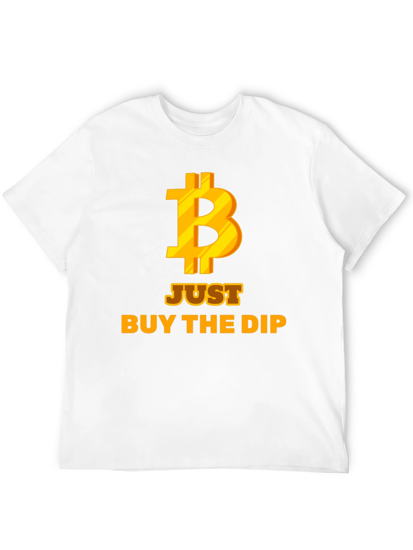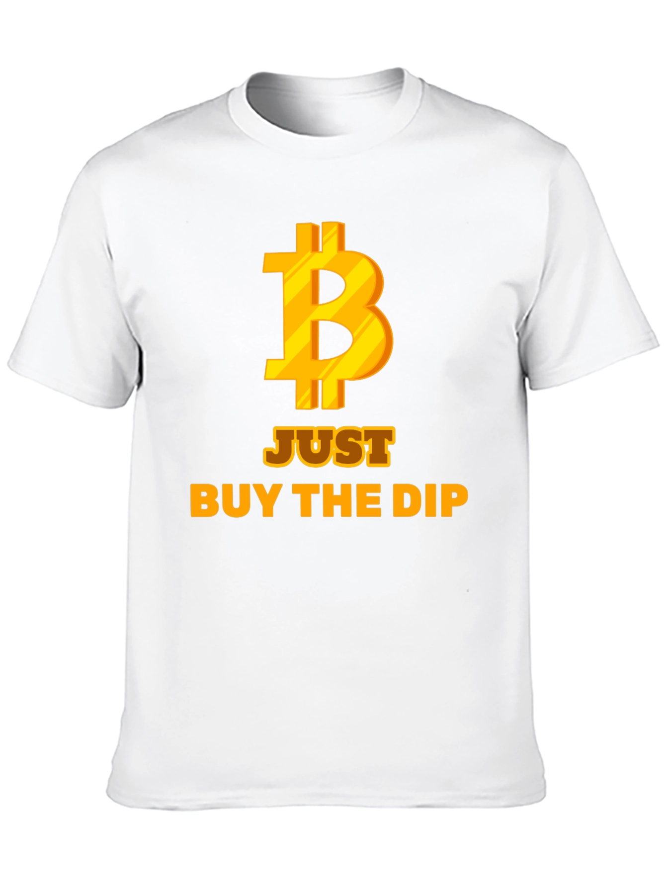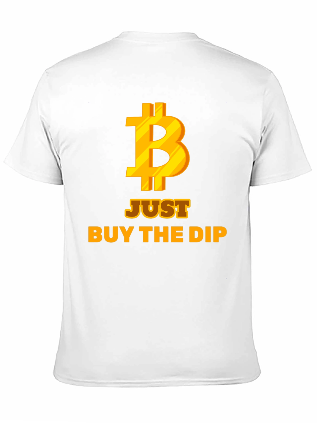 This stylish black t-shirt features a large, eye-catching Bitcoin symbol in vibrant gold tones. Below the Bitcoin logo, the phrase "JUST BUY THE DIP" is emblazoned in matching gold lettering, making a bold statement. The shirt's classic cut and comfortable fabric make it ideal for everyday wear. Perfect for Bitcoin enthusiasts and crypto investors, this t-shirt is a great conversation starter and a fun way to show your support for cryptocurrency. Wear it to meetups, conferences, or just around town to express your belief in the future of digital currency.