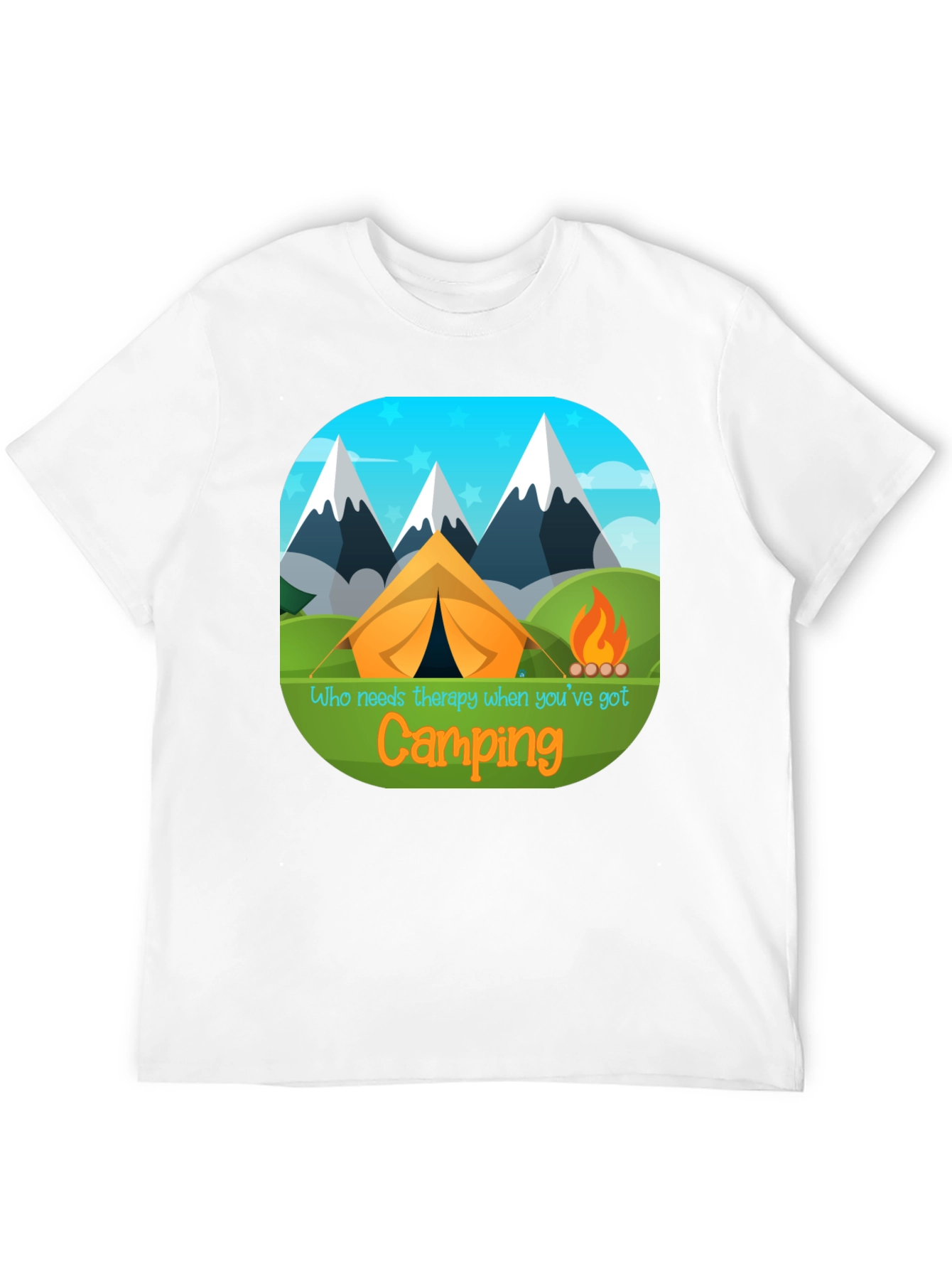 Embrace the great outdoors with this eye-catching t-shirt! Featuring a vibrant graphic of a cozy tent nestled among majestic mountains under a starlit sky, this tee is perfect for camping enthusiasts. The design includes a crackling campfire, adding a touch of warmth to the scene. The shirt proudly proclaims "Who needs therapy when you've got Camping," celebrating the therapeutic power of nature. Made from a comfortable, breathable fabric, this shirt is ideal for everyday wear, camping trips, or casual outings. Show off your love for camping and let the world know where you find your peace!