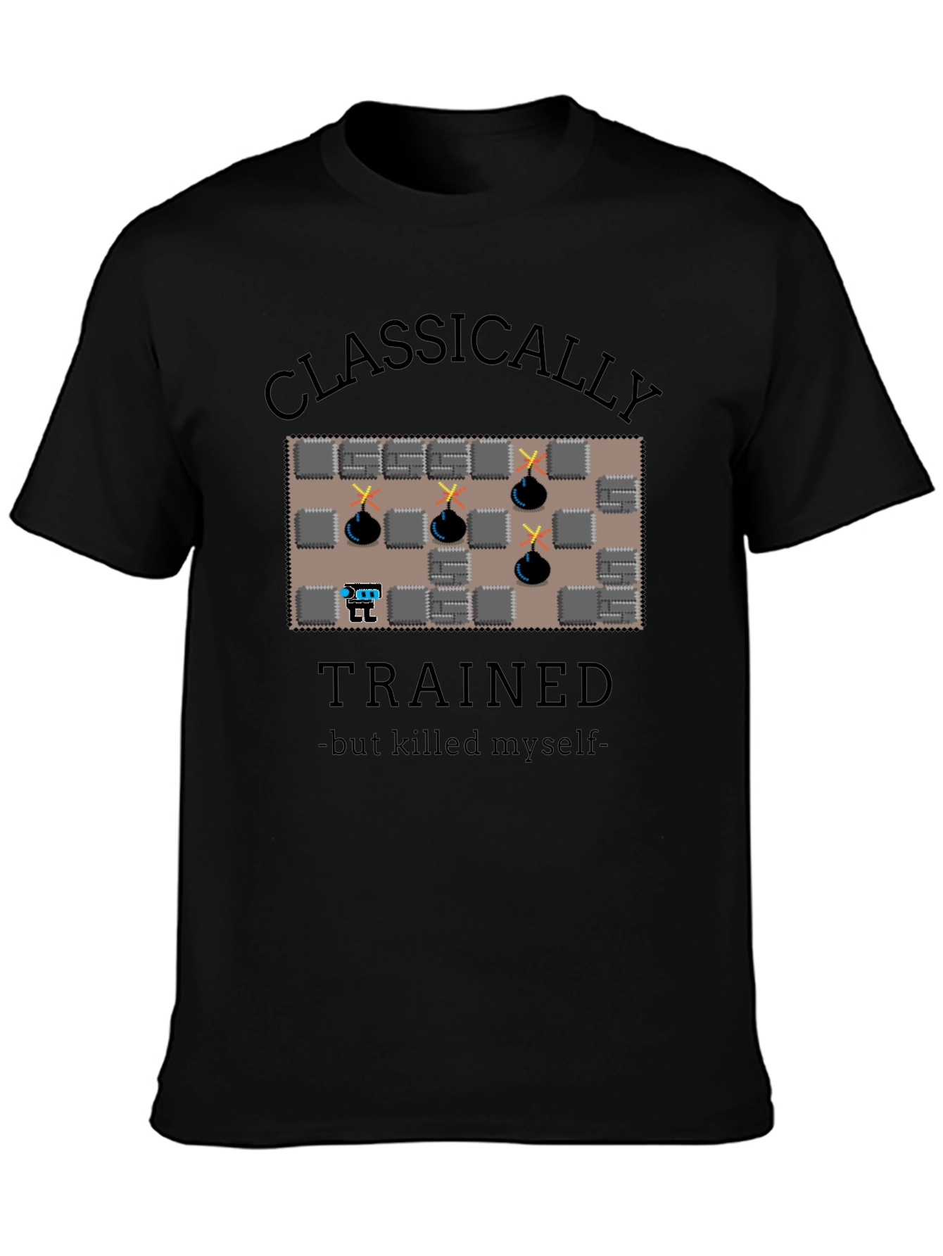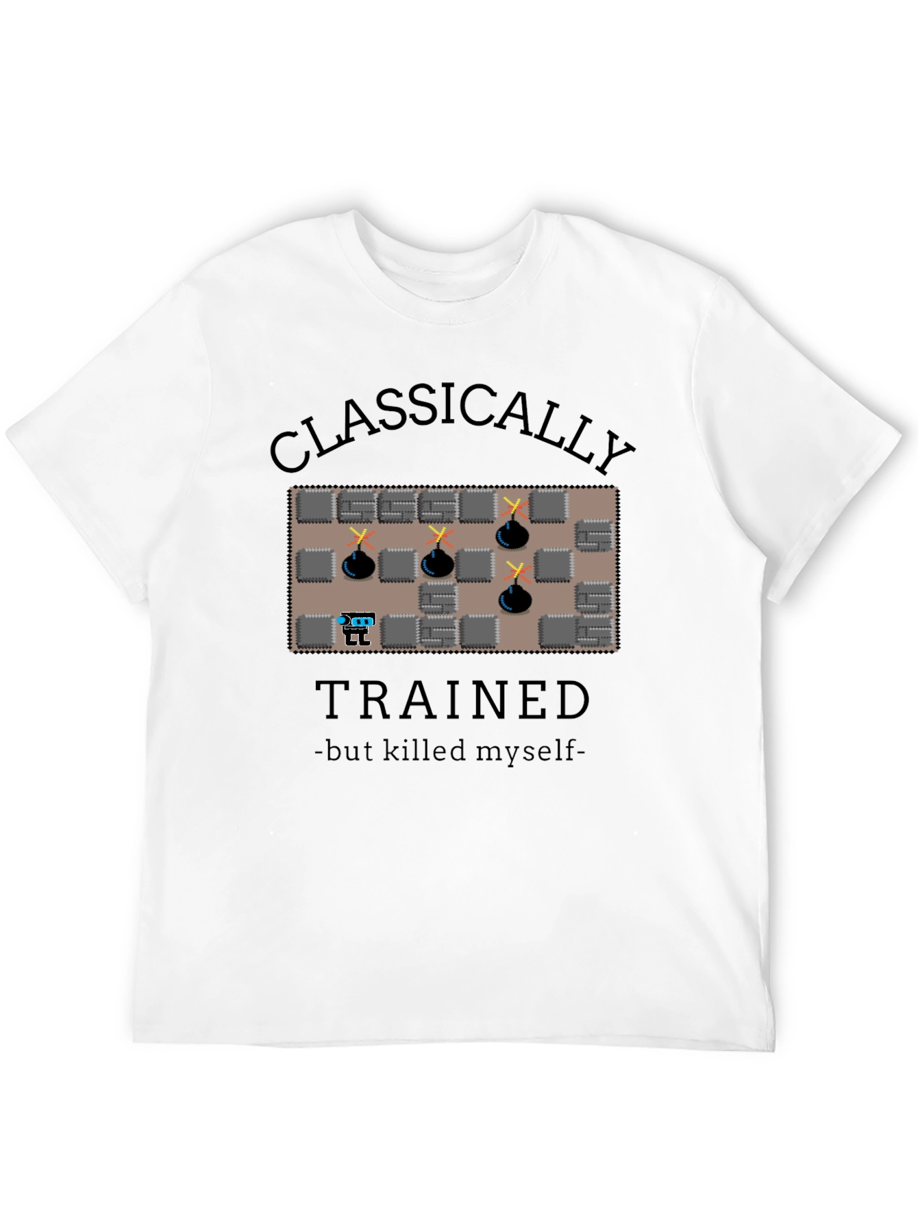 This black tee features a playful graphic design. It shows a video game scene reminiscent of the classic Bomberman, complete with bombs and a small character navigating a grid. Above and below the graphic, the words "CLASSICALLY TRAINED -but killed myself-" are printed in a complementary font. Made from what appears to be soft, breathable fabric, this t-shirt is comfortable enough for everyday wear. It's ideal for gamers, retro enthusiasts, or anyone with a sense of humor. Pair it with jeans or shorts for a casual look that's sure to spark conversations. It's a fun, nostalgic nod to classic gaming culture.