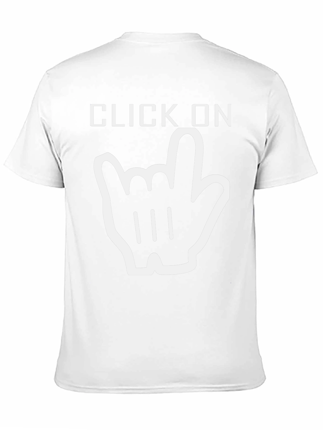 Show off your playful side with this eye-catching black graphic tee! Featuring bold, white text that reads "CLICK ON" above a stylized hand giving the "rock on" gesture, this shirt is sure to turn heads. The clean design is printed on what appears to be soft, comfortable fabric, perfect for everyday wear. This tee is ideal for casual outings, concerts, or just lounging around. Its unique graphic makes it a great conversation starter, letting you express your fun personality. Get ready to rock any situation with this must-have addition to your wardrobe!