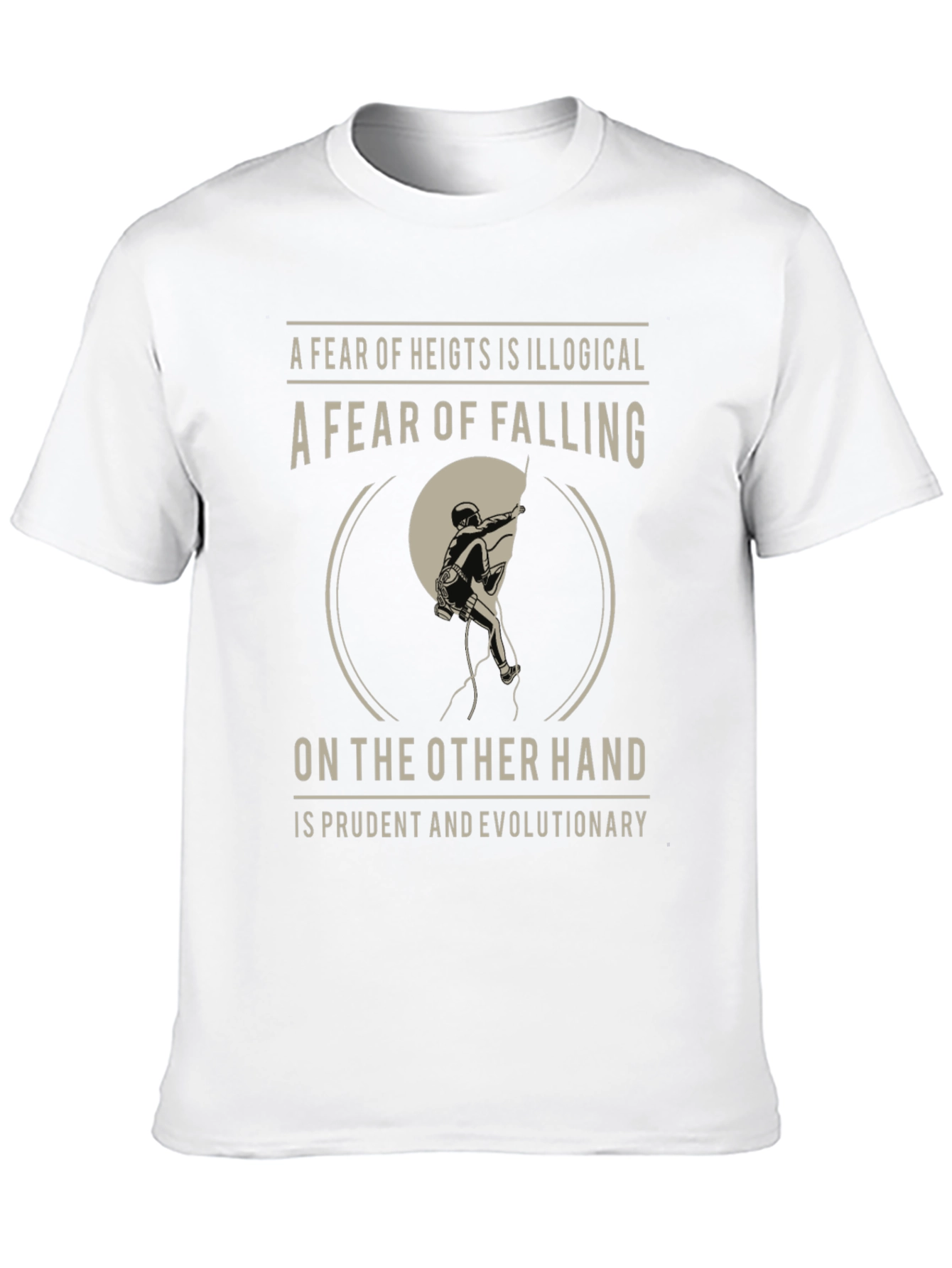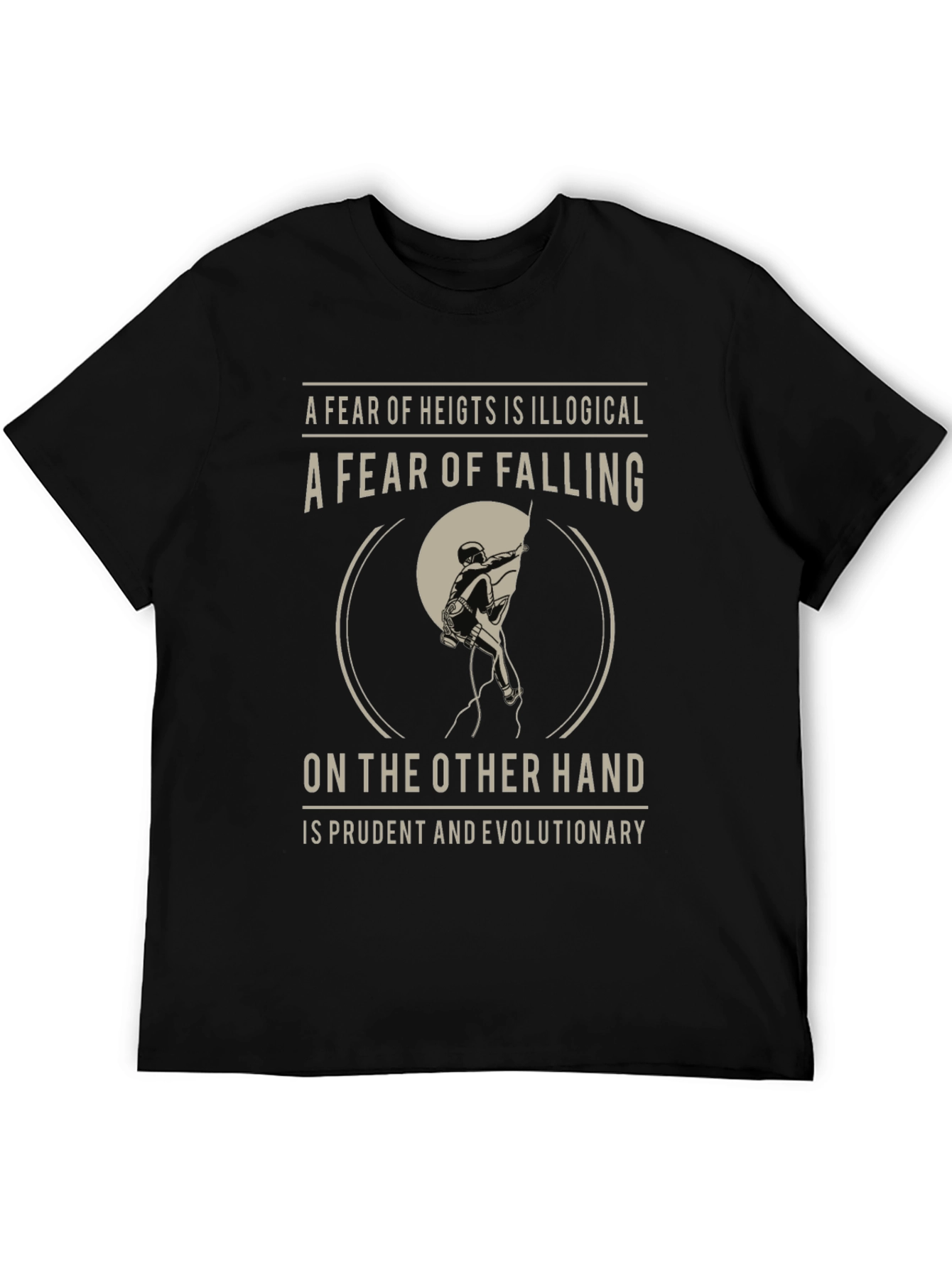 This black t-shirt features a unique graphic design centered around rock climbing. The design includes an illustration of a climber ascending a rock face against a moon backdrop, framed by a double-lined circle. Above and below the graphic are textual elements that read "A FEAR OF HEIGTS IS ILLOGICAL, A FEAR OF FALLING, ON THE OTHER HAND, IS PRUDENT AND EVOLUTIONARY," adding a touch of humor and philosophical perspective for climbing enthusiasts. Crafted for comfort and style, this tee is perfect for casual wear, gym sessions, or showcasing your passion for climbing.
