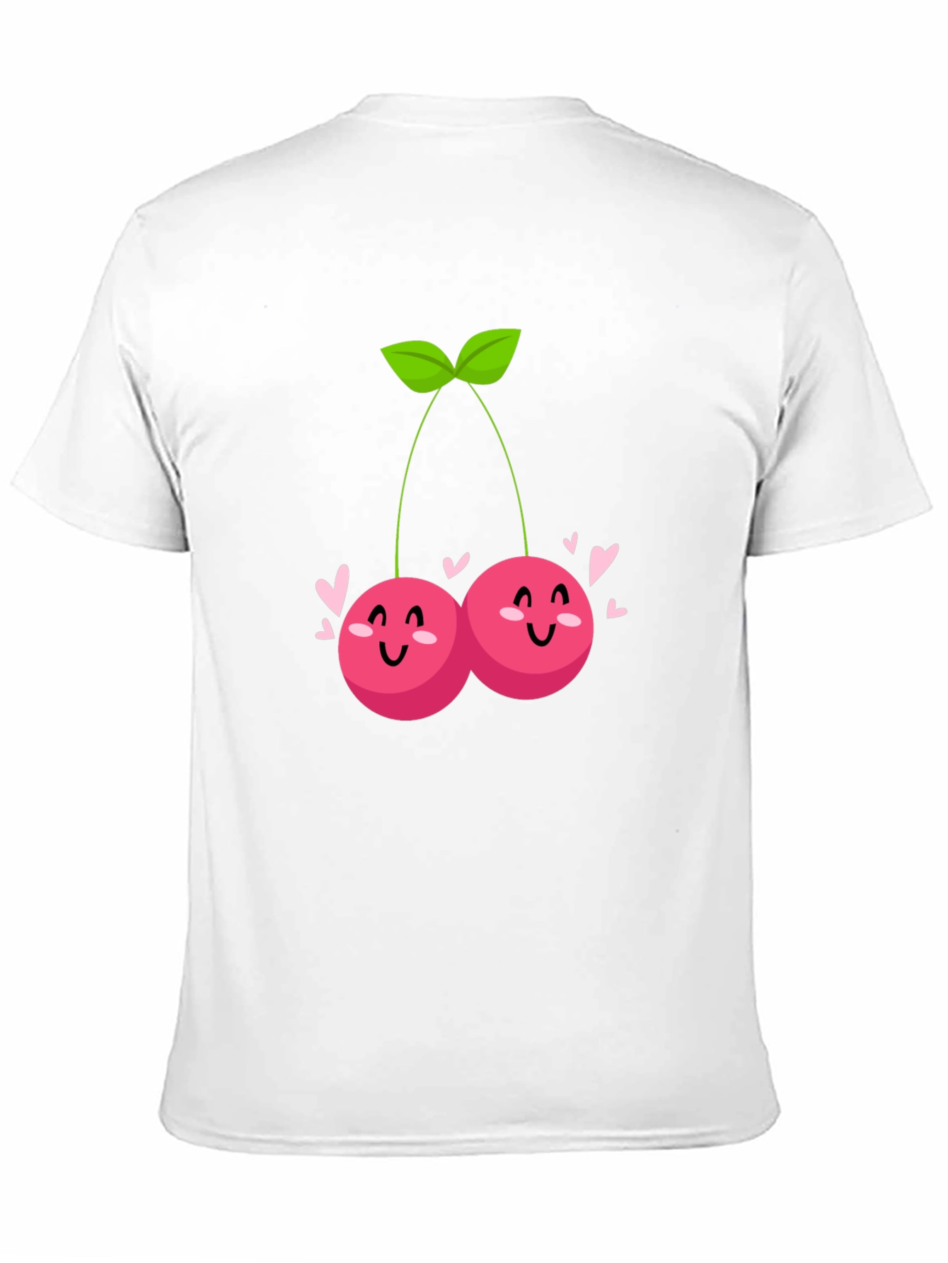Add a touch of whimsy to your wardrobe with this adorable black graphic tee! This comfortable t-shirt features a charming design of two smiling cherries with green leaves, surrounded by cute pink hearts. The bold design pops against the classic black background, making it perfect for casual wear. Made from a soft, breathable fabric, this shirt is ideal for everyday comfort and style. Pair it with jeans, shorts, or a skirt for a fun and fashionable look. A perfect gift for cherry lovers and anyone who appreciates playful and unique designs.