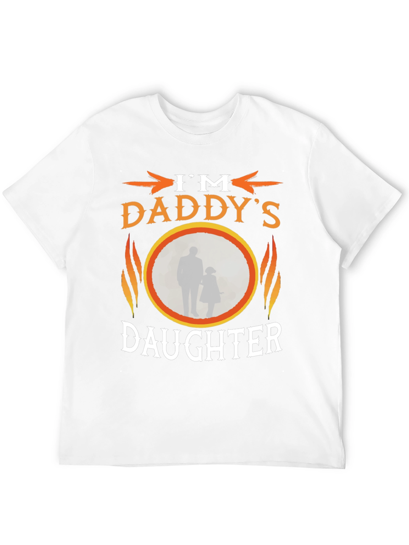 Showcase your special bond with this unique black T-shirt. Featuring a vibrant design with the text "I'M DADDY'S DAUGHTER" above and below a silhouetted father and daughter within a circle, it's a heartwarming statement piece. Accented with fiery graphic elements, this tee is sure to turn heads. Made from a comfortable-looking fabric, this T-shirt is perfect for casual outings, family gatherings, or as a thoughtful gift. Let the world know you're proud to be a daddy's girl with this stylish and expressive T-shirt.