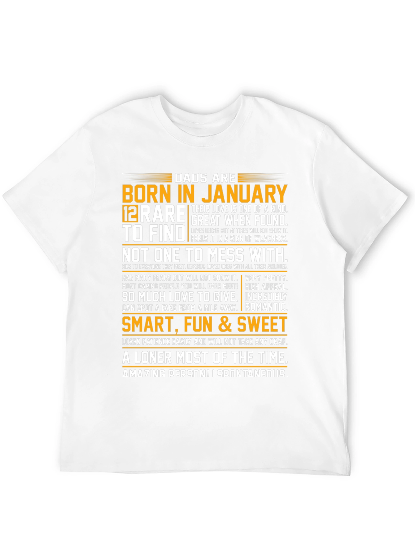 Celebrate the January dad with this bold graphic tee. The black shirt features a vibrant design with the phrase "Dads Are Born In January" prominently displayed. The shirt also showcases multiple positive characteristics associated with January dads such as being rare, great when found, caring, smart, fun, sweet, and incredibly loving. This tee is perfect for casual wear and makes a thoughtful gift for birthdays, Father's Day, or any occasion to show appreciation for a special dad born in January. It's a comfortable and stylish way to express love and pride.