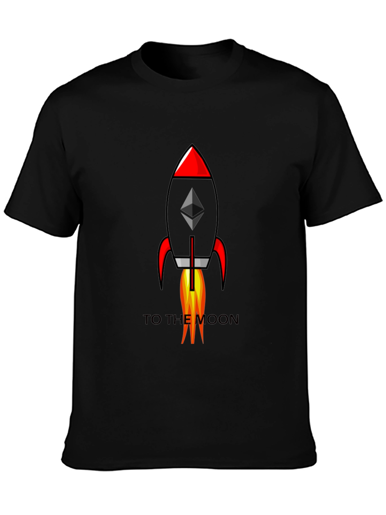 Show your enthusiasm for Ethereum with this stylish black T-shirt. The design features a sleek rocket with the Ethereum logo, soaring upwards with the text "TO THE MOON". Made from a soft and comfortable fabric, this tee is perfect for everyday wear and crypto meetups. The eye-catching design is sure to spark conversations and show your passion for the future of digital currency. Whether you're a seasoned investor or just getting started, this shirt is a great way to express your excitement for Ethereum's potential. Get yours today and join the crypto revolution!