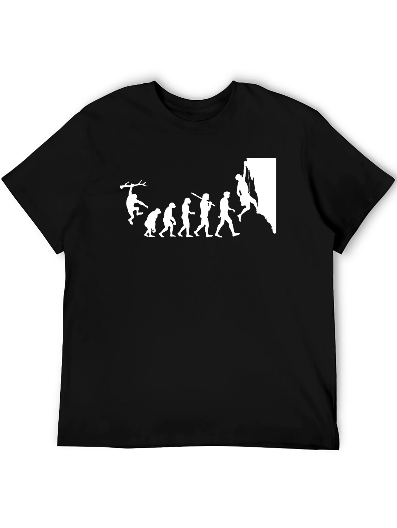 Show off your love for climbing with this unique graphic t-shirt. The black tee features a white print depicting the evolution of man, culminating in a rock climber scaling a cliff. Made from a comfortable material, this short-sleeve shirt is perfect for everyday wear or a casual climbing session. The design is eye-catching and humorous, making it a great conversation starter. Ideal for climbers, outdoor enthusiasts, and anyone who appreciates a clever graphic tee. Get yours today and represent the pinnacle of evolution!