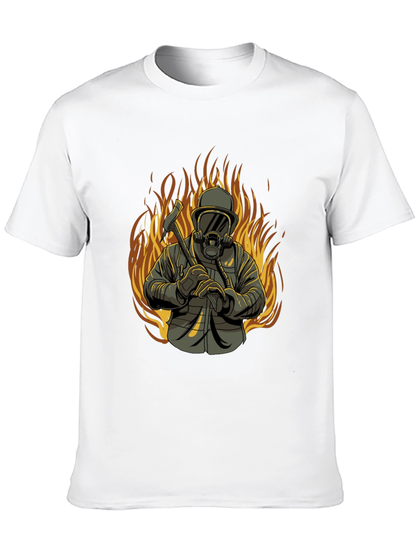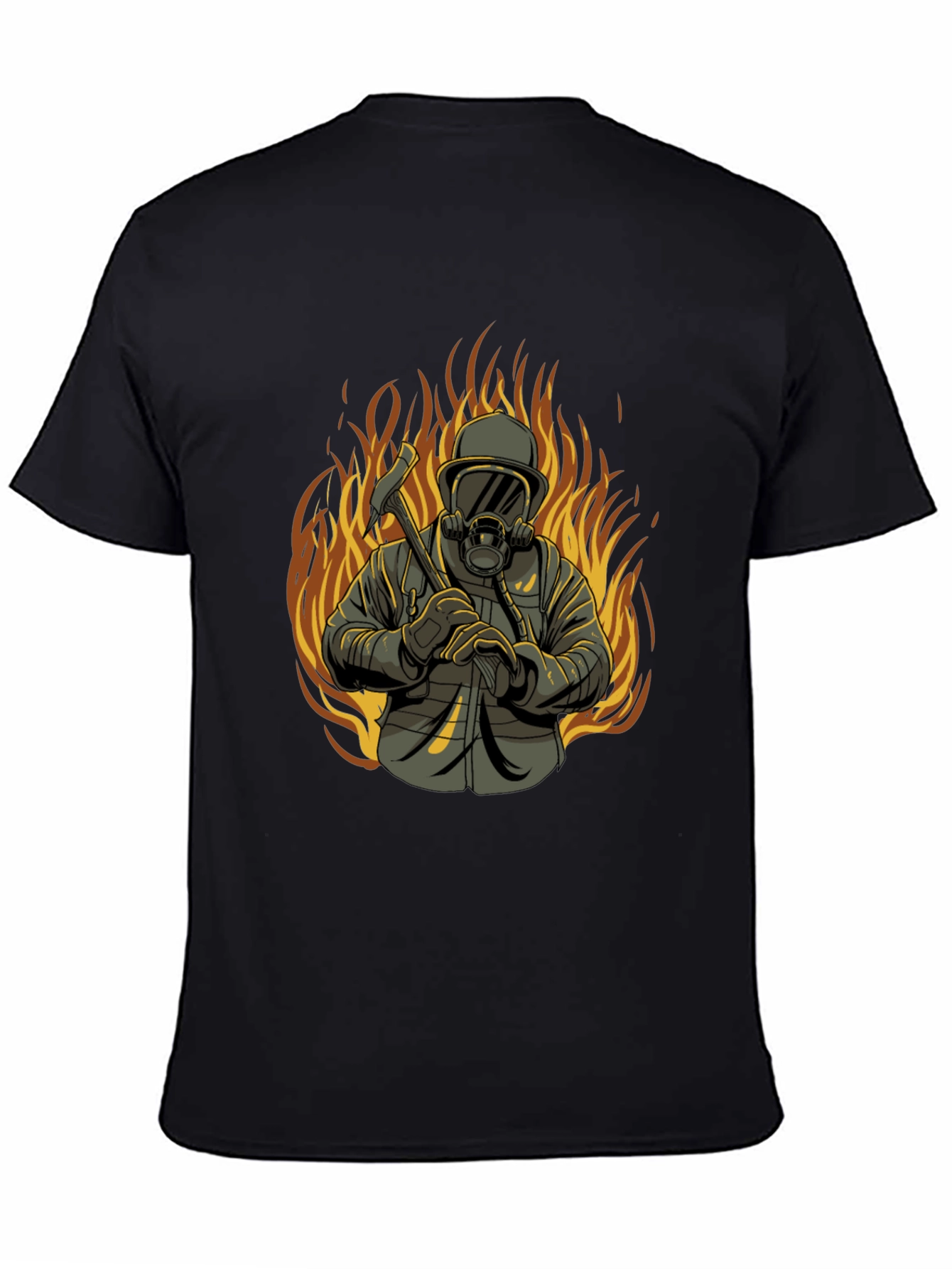 Show your appreciation for the brave firefighters with this striking black t-shirt. The design features a detailed illustration of a firefighter in full gear, holding an axe, set against a backdrop of roaring flames. The graphic is bold and eye-catching. Made from comfortable fabric, this tee is perfect for everyday wear, casual outings, or as a thoughtful gift for anyone who admires the courage and dedication of firefighters. Express your respect and support with this unique and stylish t-shirt.