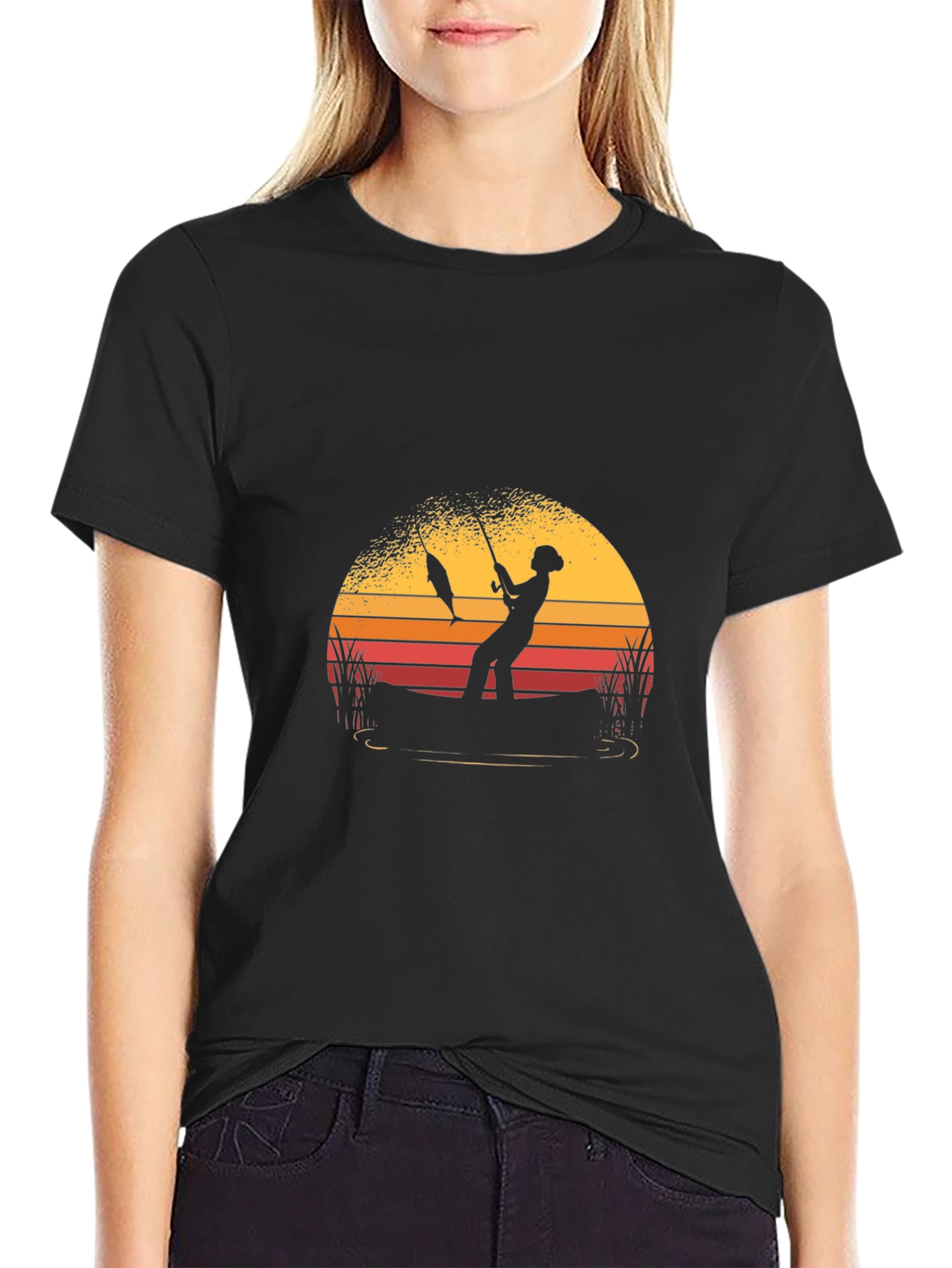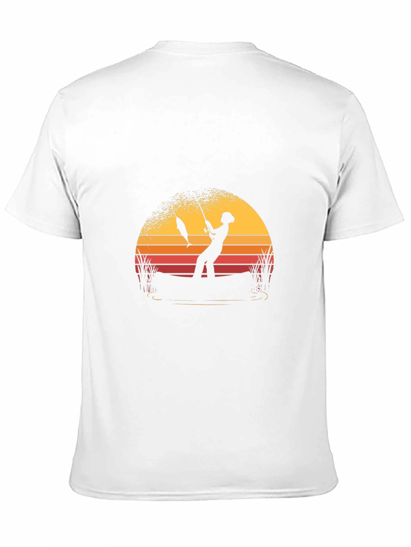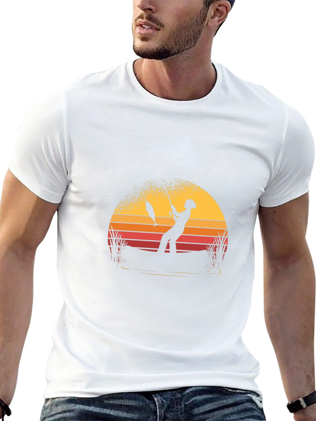 Cast a line with style in this eye-catching graphic tee. Featuring a bold silhouette of a fisher catching a fish against a retro sunset backdrop, this shirt is perfect for anglers and outdoor enthusiasts alike. The design includes reeds and water details, adding depth to the overall look. Crafted from comfortable, breathable fabric, this tee offers all-day comfort whether you're on the water or relaxing at home. Show off your love for fishing with this unique and stylish shirt, ideal for casual wear, fishing trips, or as a gift for the fishing enthusiast in your life.