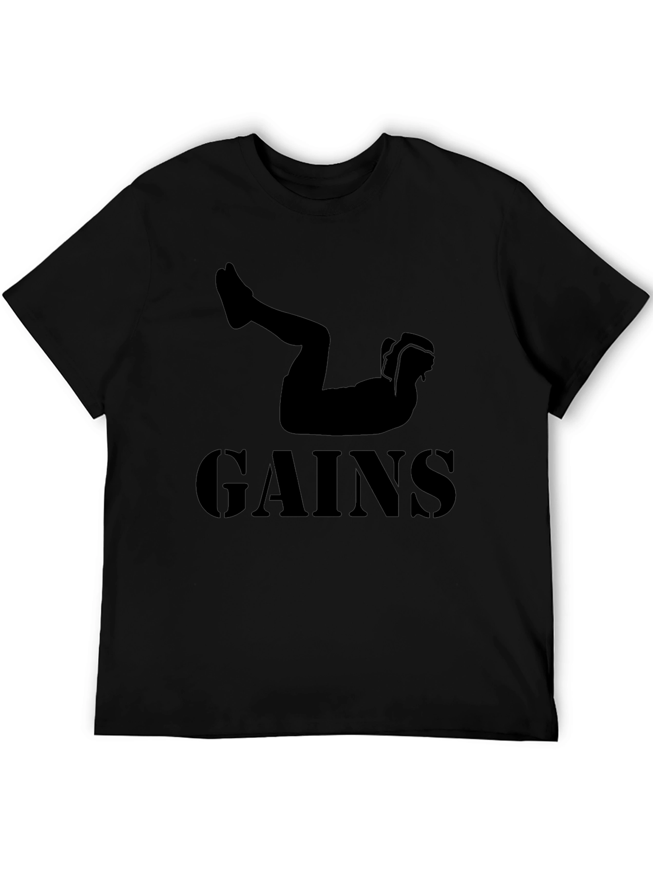 Show off your dedication to fitness with this bold black t-shirt. Featuring a silhouette graphic of a person doing crunches and the word "GAINS" prominently displayed, this shirt is perfect for workouts or casual wear. Made from a comfortable, breathable fabric, this tee is designed for performance and style. Whether you're hitting the gym, running errands, or simply relaxing, this shirt is a statement piece that highlights your active lifestyle. Grab yours today and showcase your commitment to making gains!