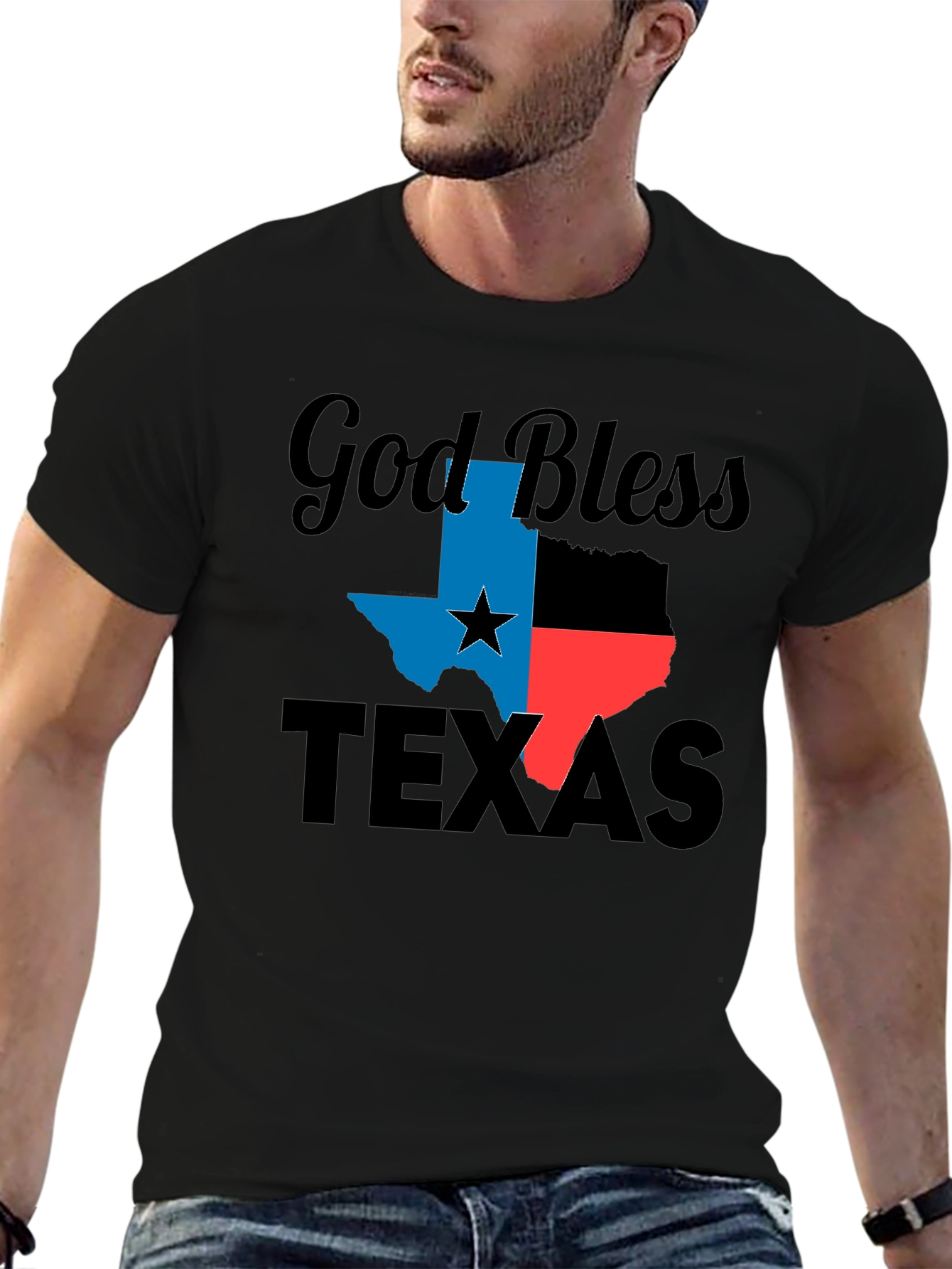 Show your Texas pride with this stylish black t-shirt. Featuring a bold "God Bless Texas" design, this shirt includes a unique Texas state outline filled with patriotic colors. The cotton blend material ensures a comfortable fit, perfect for everyday wear. Ideal for casual outings, showing off your Texan spirit, or as a thoughtful gift for friends and family. Grab yours now and wear your Texas pride!
