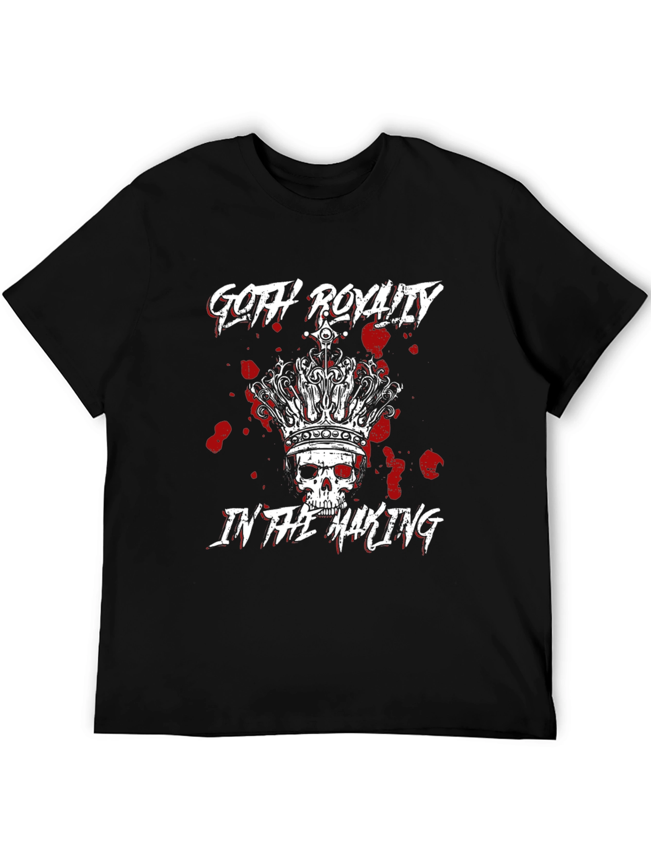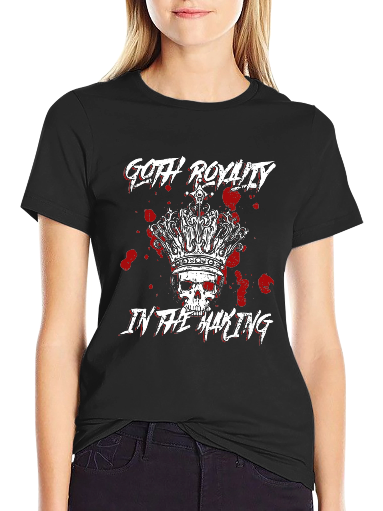 Embrace your dark side with this edgy 'Goth Royalty in the Making' black t-shirt. The design features a striking skull wearing a detailed crown, accented with red splatter details for a raw, gothic aesthetic. Made from comfortable, breathable fabric, this shirt is perfect for expressing your unique style. Ideal for casual wear, concerts, or gothic-themed events, this statement piece will definitely turn heads. Show off your rebellious spirit and claim your place among the goth elite with this eye-catching tee!