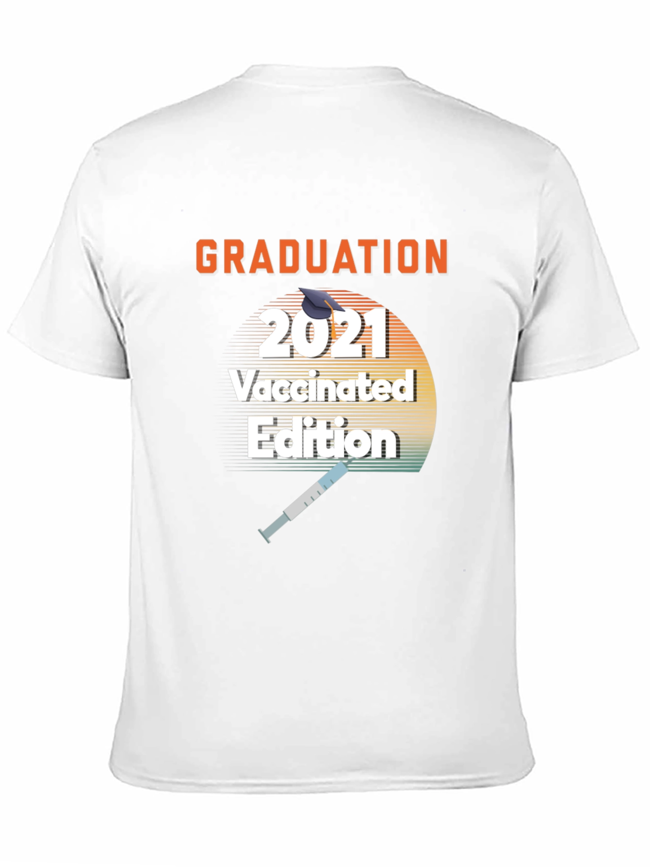 Celebrate graduation with this unique 'Graduation 2021 Vaccinated Edition' T-shirt! This black tee features a bold design with "GRADUATION" printed at the top, followed by "2021" with a graduation cap graphic. Below, "Vaccinated Edition" is prominently displayed above a syringe graphic. The design is set against a retro-style sunset graphic, adding a vintage touch. This shirt is perfect for graduates who want to commemorate their special year and show off their vaccination status in a fun and stylish way. Great for graduation parties, reunions, or casual wear.