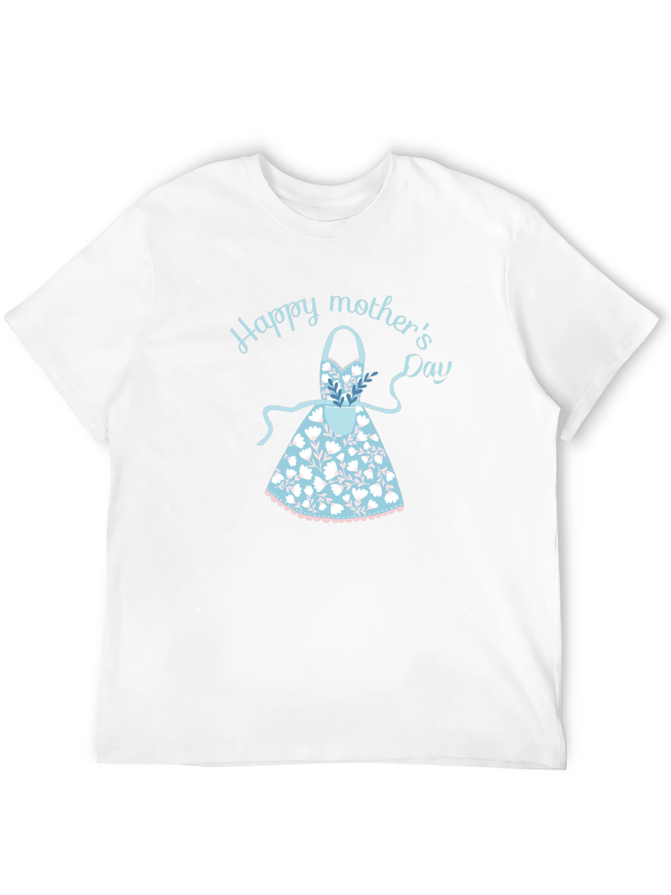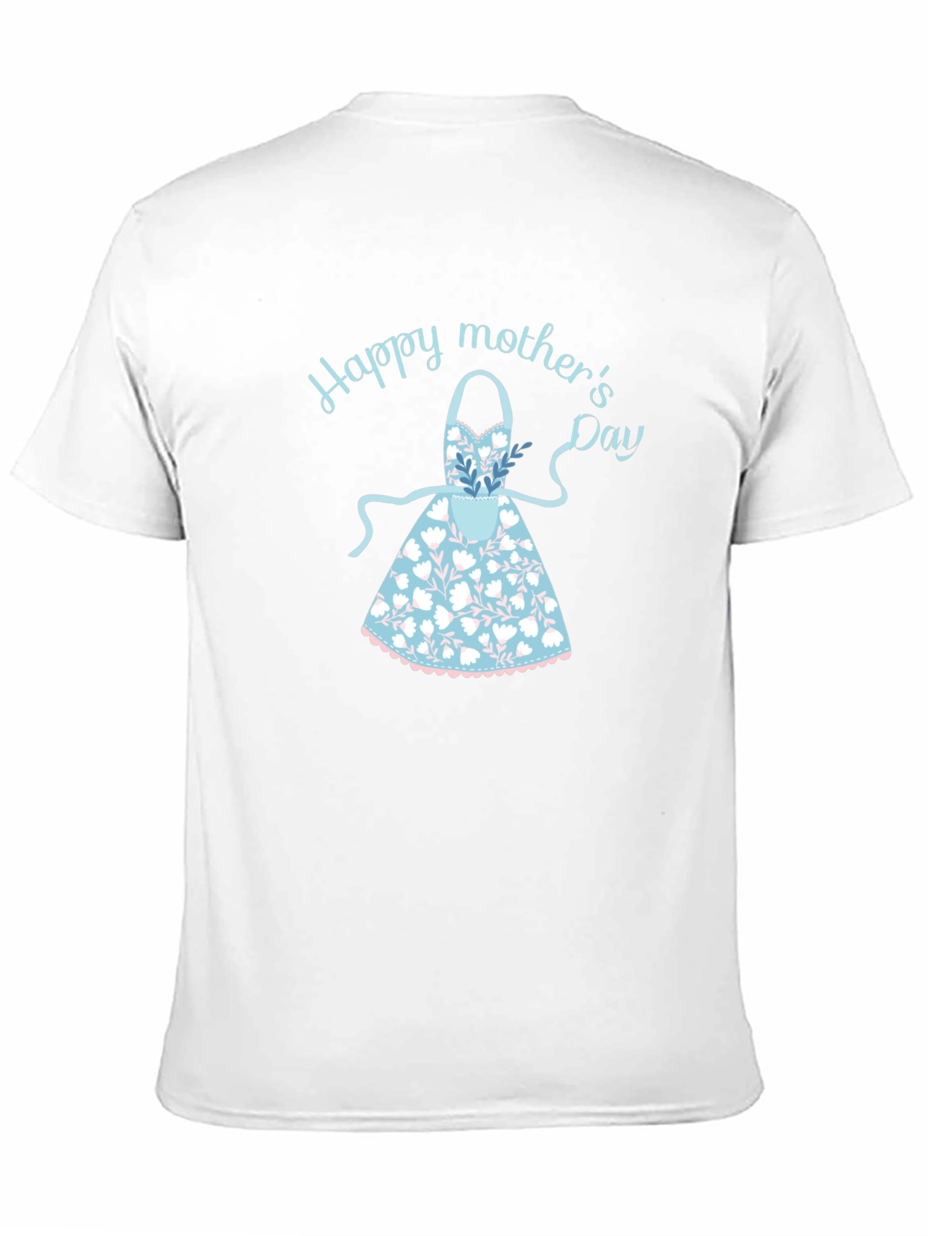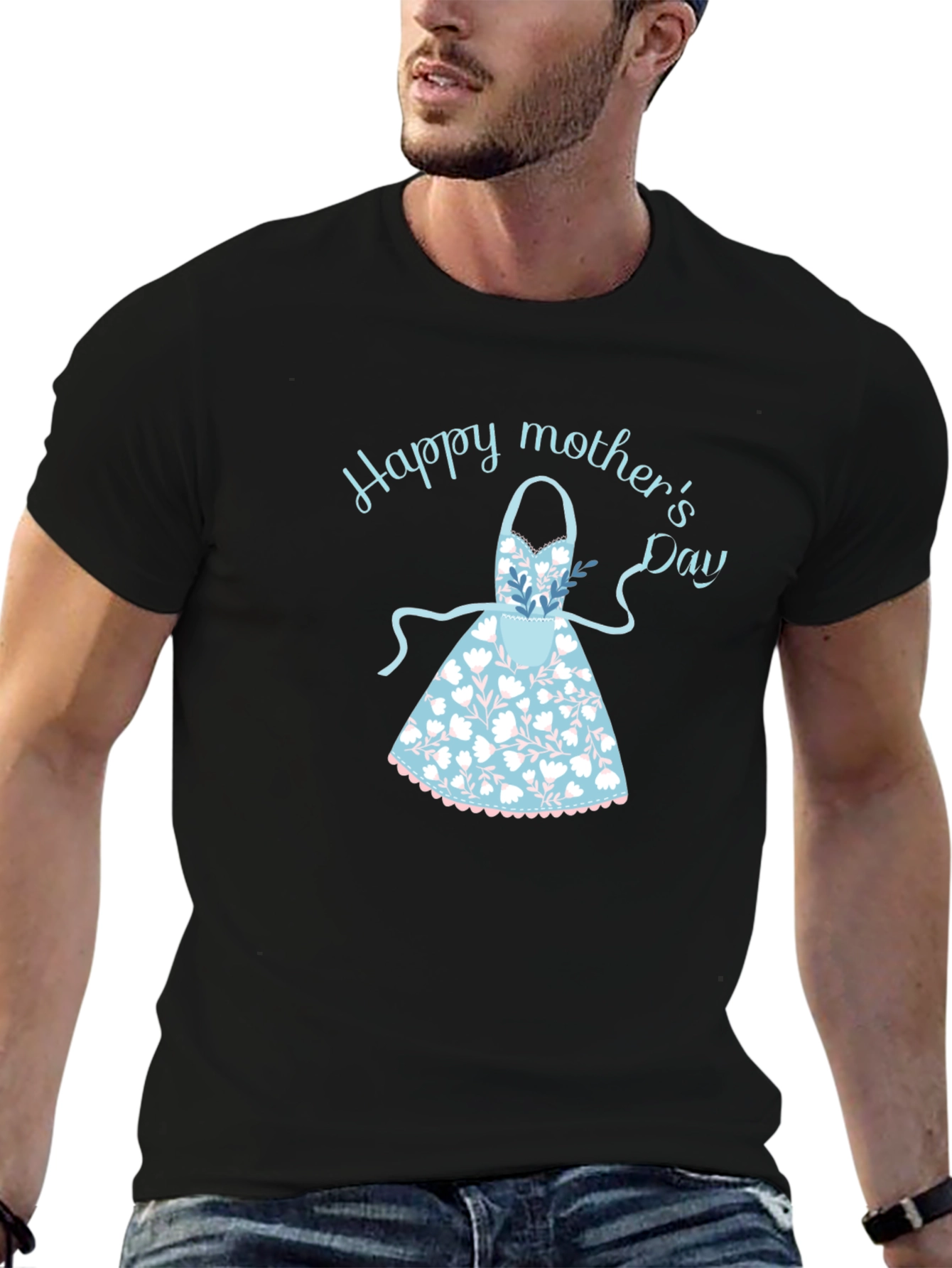 Celebrate Mother's Day with this unique and stylish black t-shirt. The design features a charming blue and white floral apron graphic, complete with a whimsical 'Happy Mother's Day' inscription. Made from comfortable material, this tee is perfect for casual wear, family gatherings, or as a thoughtful gift for your beloved mom. Show your appreciation with this fashionable and festive garment that captures the spirit of the special day. The detailed apron illustration adds a touch of warmth and personalization, making it a memorable and cherished keepsake.
