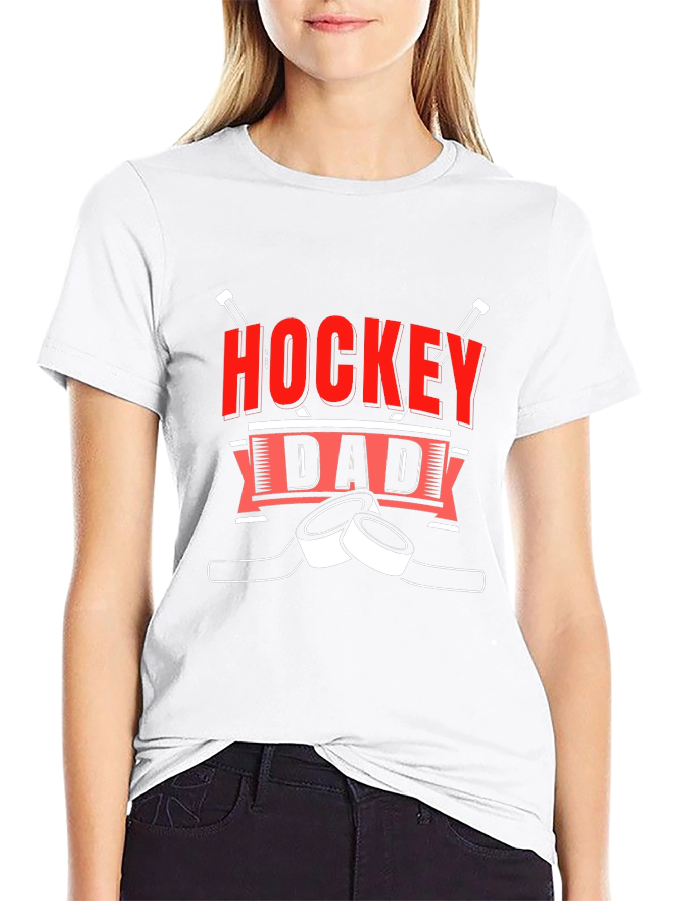 Show off your love for hockey with this classic black t-shirt. The tee features a bold "HOCKEY DAD" design in red and white. The design also includes hockey sticks and hockey pucks. Perfect for wearing to the rink, casual outings, or while cheering on your favorite team, this shirt is a must-have for any hockey-loving dad. Made from comfortable materials, it offers a relaxed fit for all-day wear. Get yours today and let everyone know you're a proud hockey dad!