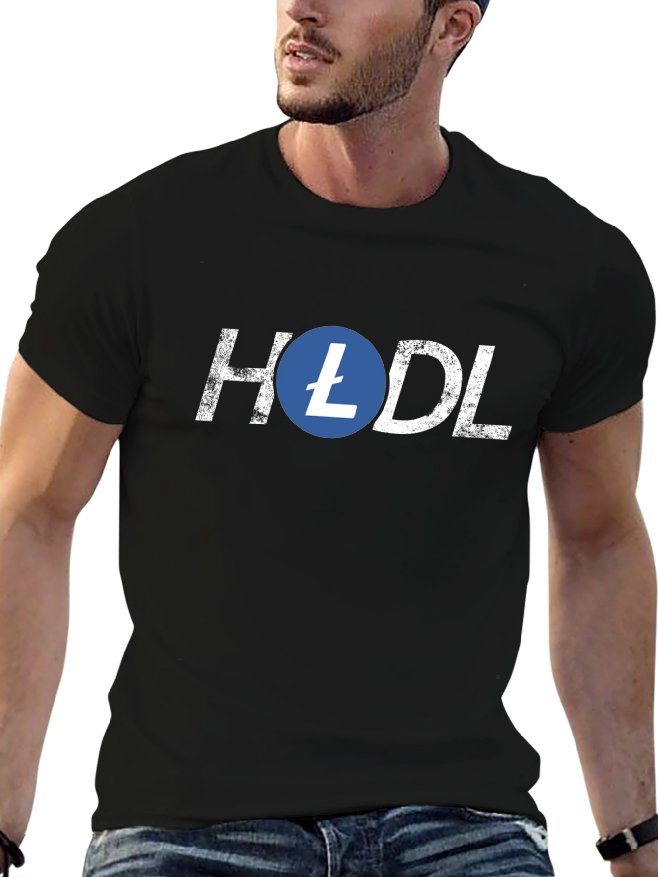 Show your support for Litecoin with this stylish black HODL t-shirt. The shirt features a bold, distressed-style 'HODL' design with the Litecoin logo prominently displayed. Made from what appears to be a comfortable cotton blend, this tee is perfect for crypto enthusiasts and everyday wear. Ideal for casual outings, meetups, or just lounging at home while watching the market. Get yours today and rep your favorite cryptocurrency!