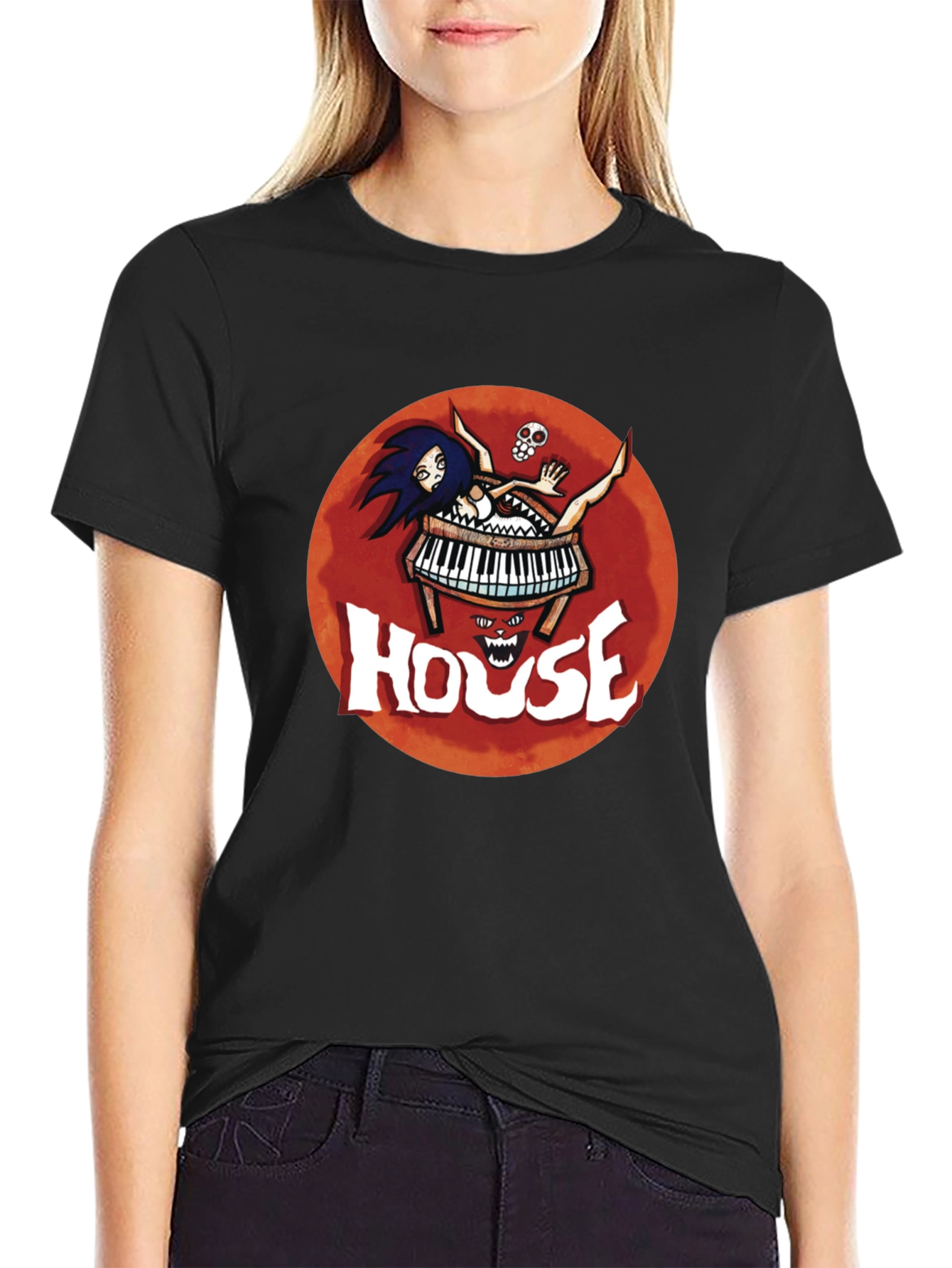 Show off your love for classic horror with this striking black t-shirt! Featuring a vivid graphic design inspired by the cult film "House" (1977), the shirt displays a spooky scene. The central image pops with bold colors, depicting an eerie piano and ghostly figures set against a bright red backdrop. Made from what appears to be soft, breathable cotton, this tee is both comfortable and durable. Wear it casually or as a statement piece. This unique tee is perfect for movie buffs, horror fans, or anyone who appreciates eye-catching apparel. Grab yours today and make a statement!
