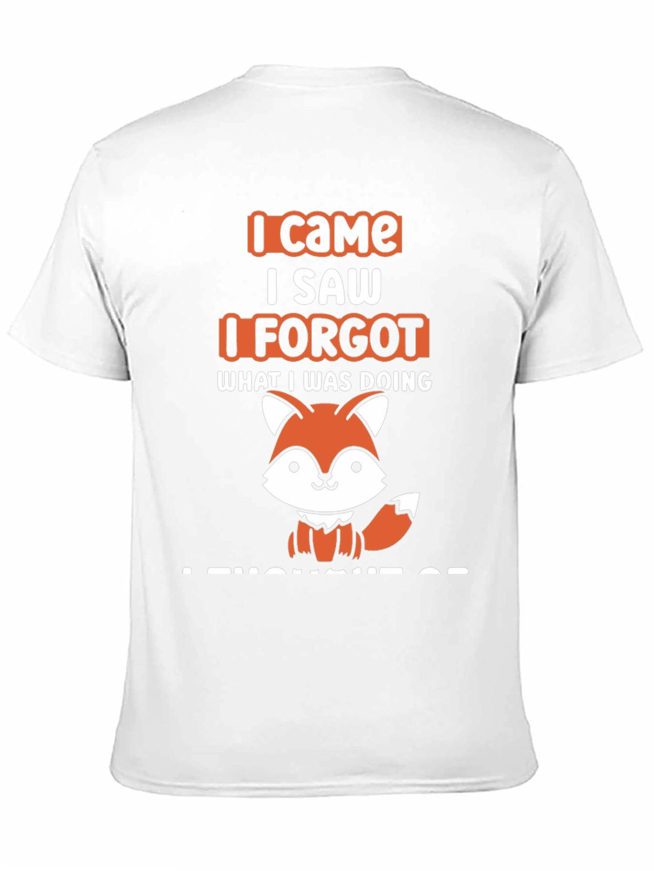 This fun black t-shirt features the phrase 'I came, I saw, I forgot what I was doing' above a cute cartoon fox. Below the fox, it reads 'I thought of'. The design is printed in a playful font, with the text and fox image creating a humorous and eye-catching graphic. Made from a comfortable-looking fabric, this tee is perfect for casual wear. Show off your witty side with this unique and relatable t-shirt. It would make a great gift for anyone who appreciates a bit of humor and a cute fox design. Available in various sizes.