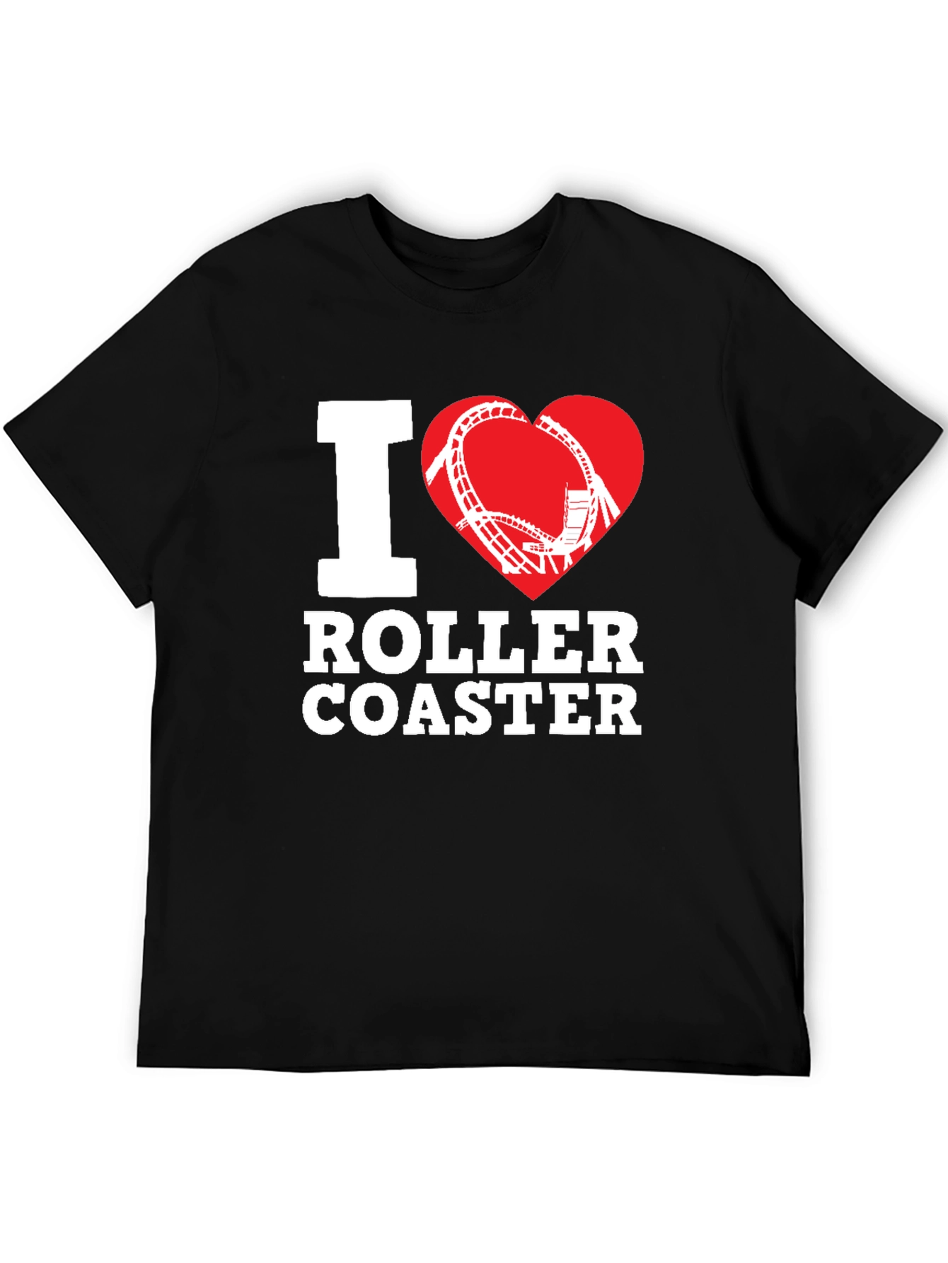 Show your passion for thrill rides with this stylish black tee! This t-shirt features a bold design with a large white "I" and a red heart containing a white roller coaster graphic, followed by the word "ROLLER COASTER" in white block letters. Made from a comfortable-looking fabric, this shirt is perfect for everyday wear, theme park visits, or casual hangouts with friends. Ideal for roller coaster enthusiasts, this tee is a fun and fashionable way to express your love for adrenaline-pumping adventures. Get yours today and wear your passion with pride!
