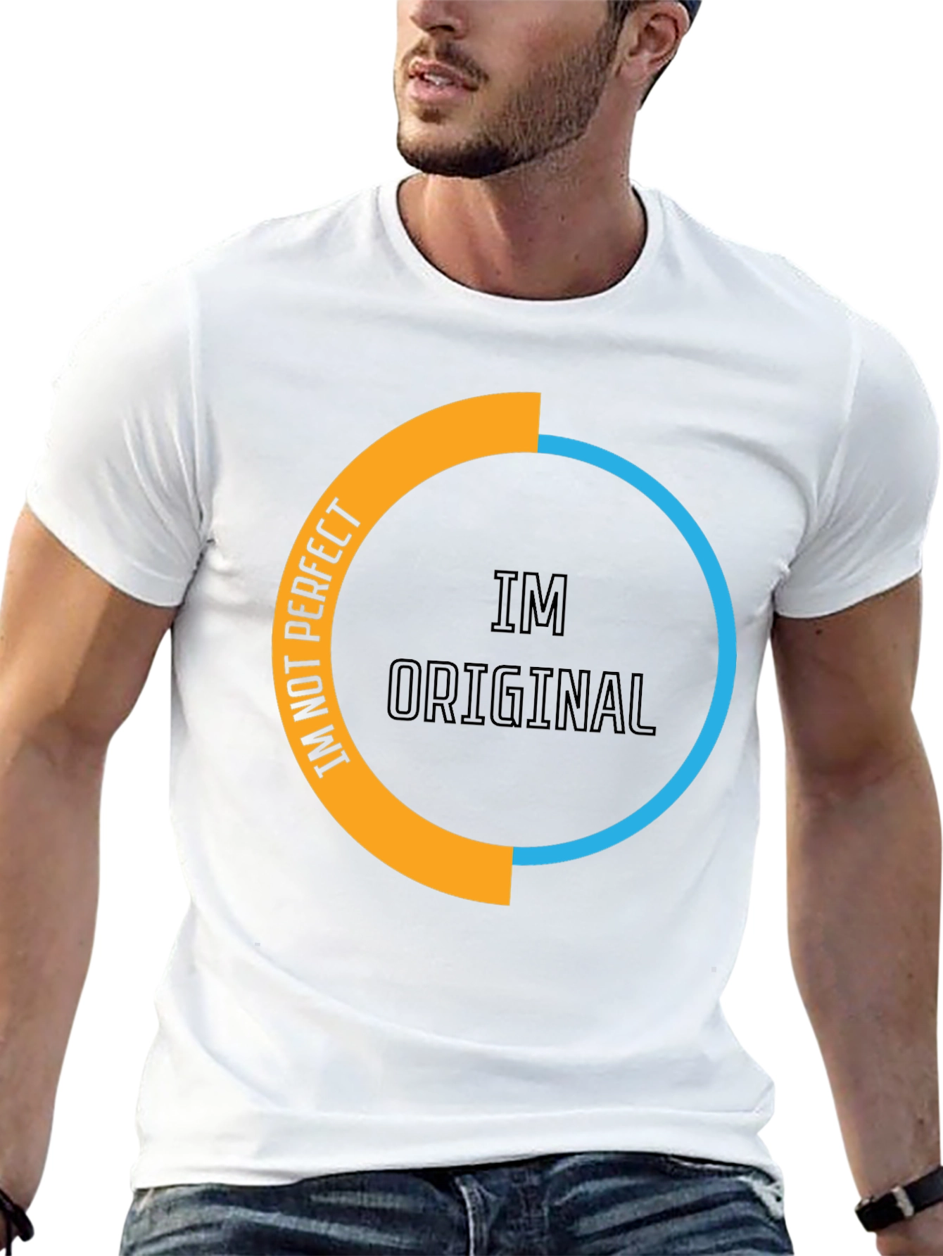 Express your unique self with this stylish black t-shirt. The tee features a creative graphic design with the words "I'm Not Perfect, I'm Original" arranged around a circular design in orange and blue. Made from comfortable material, this short-sleeved shirt offers a relaxed fit. Ideal for casual wear, social gatherings, or expressing your individuality, this tee makes a bold statement. Show off your distinctive style and inspire others with this fashionable and meaningful t-shirt.