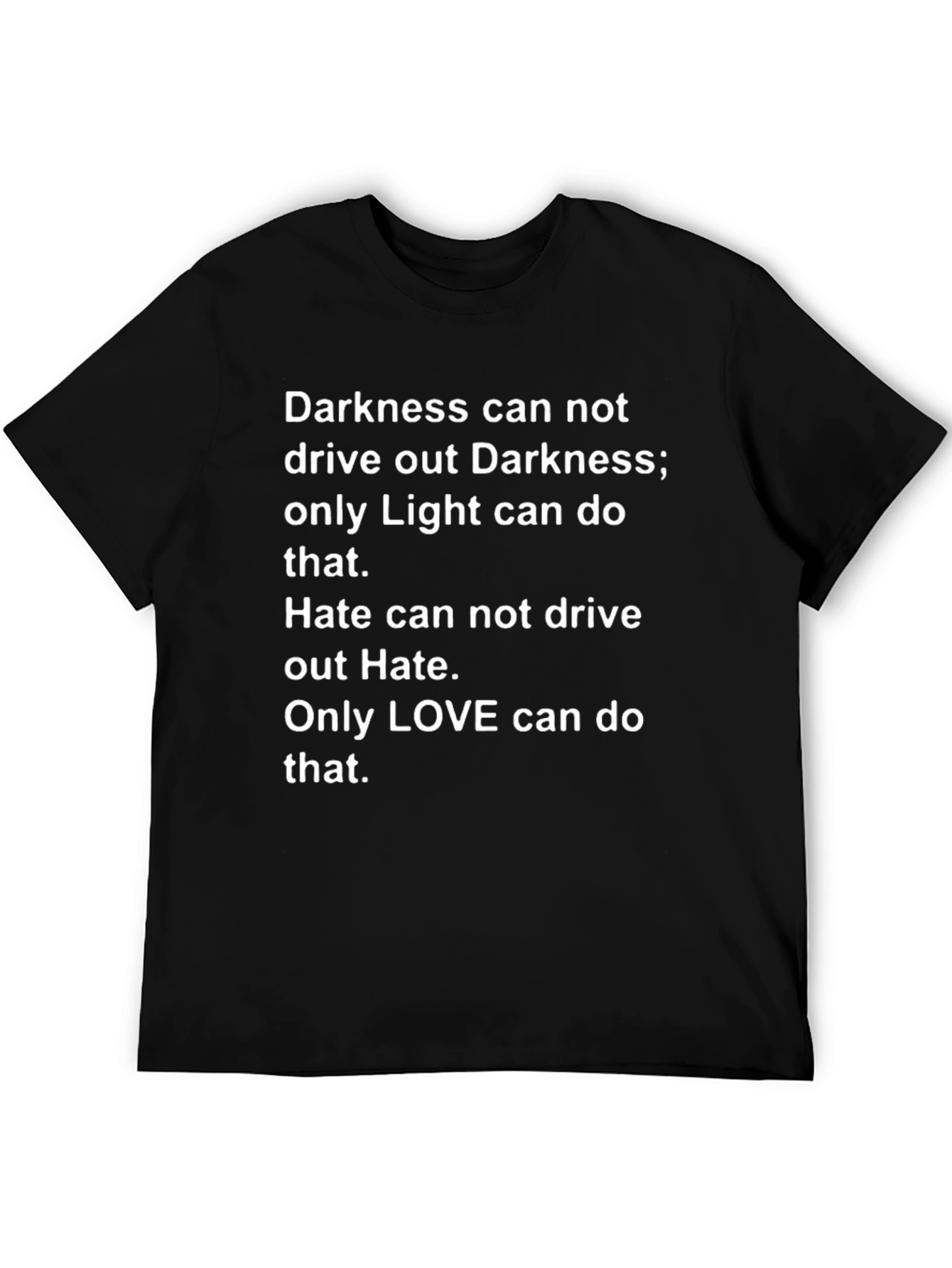 This black t-shirt features a powerful message about overcoming negativity with positivity. The bold white text states: "Darkness can not drive out Darkness; only Light can do that. Hate can not drive out Hate. Only LOVE can do that." Made from what appears to be a soft and comfortable fabric, this tee offers a classic fit suitable for everyday wear. Ideal for those who appreciate meaningful statements and spreading positive vibes, this t-shirt can be worn casually with jeans, shorts, or layered under a jacket. Its message makes it a great conversation starter and a reminder to choose love and light in all situations. A great choice for expressing your beliefs and values.