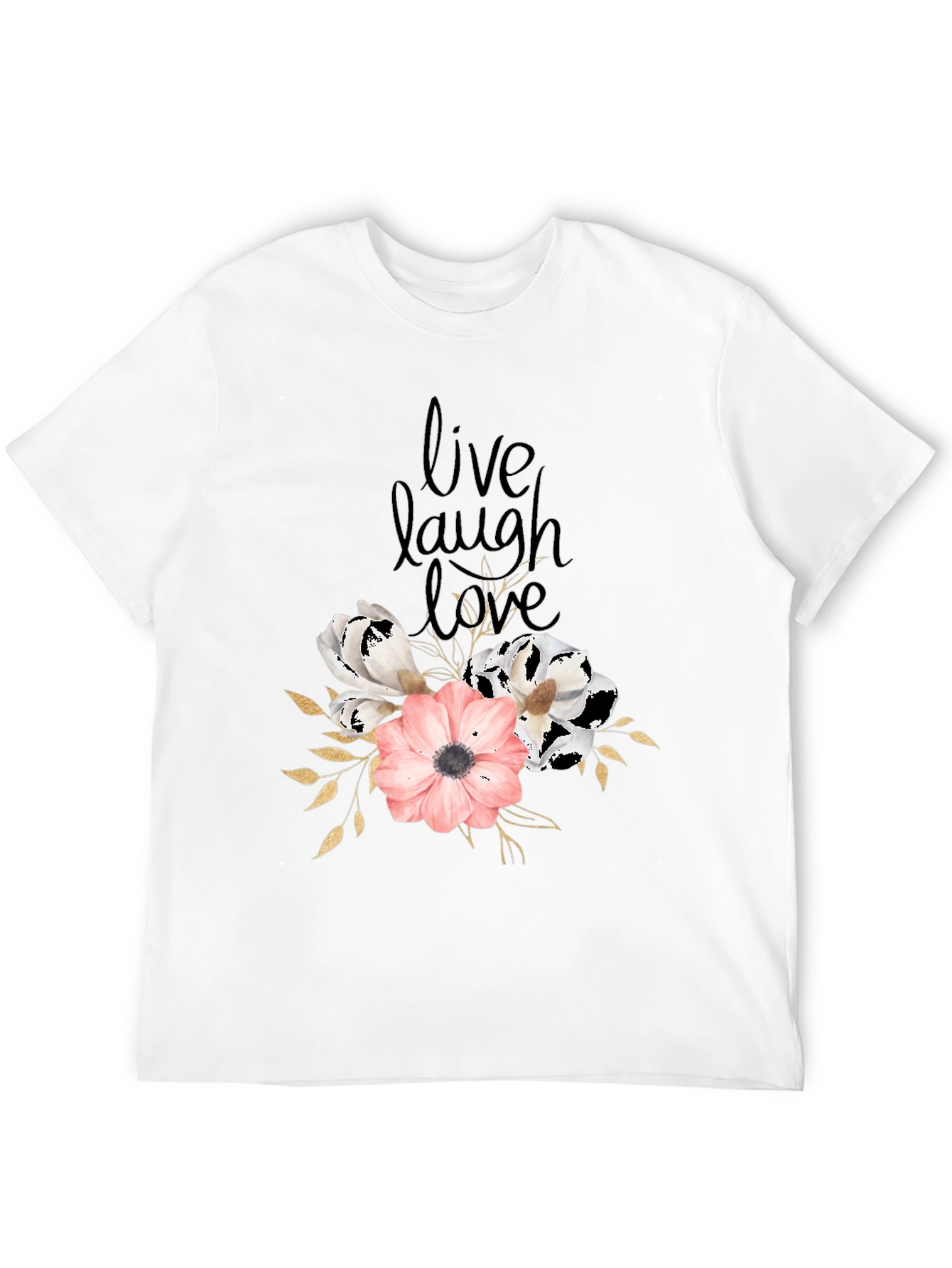 Showcase your love for life with this stylish black t-shirt. Featuring a beautiful floral design with a prominent pink flower, complemented by white and gold accents. The elegant script "Live Laugh Love" adds a touch of inspiration. Perfect for casual wear, this tee is a comfortable and fashionable way to express yourself. Made from a soft, breathable fabric, it's ideal for everyday use. Pair it with jeans or shorts for a relaxed yet chic look. A great addition to any wardrobe, this t-shirt combines comfort with a positive message.