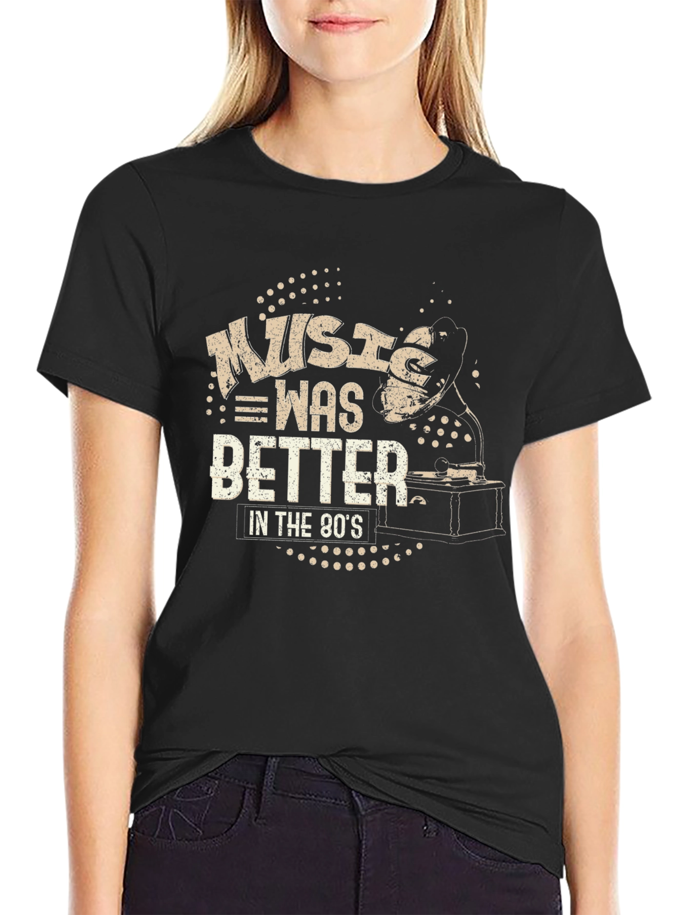 Step back in time with this vintage-inspired black tee featuring a retro design. The shirt proudly proclaims "Music Was Better In The 80's" alongside a classic phonograph illustration. The distressed print gives it a cool, worn-in feel. Made from a soft, comfortable material, this short-sleeve t-shirt is perfect for casual wear. It's an ideal conversation starter for music lovers and anyone who appreciates a touch of nostalgia. Wear it to concerts, retro-themed parties, or just around town to showcase your unique style.
