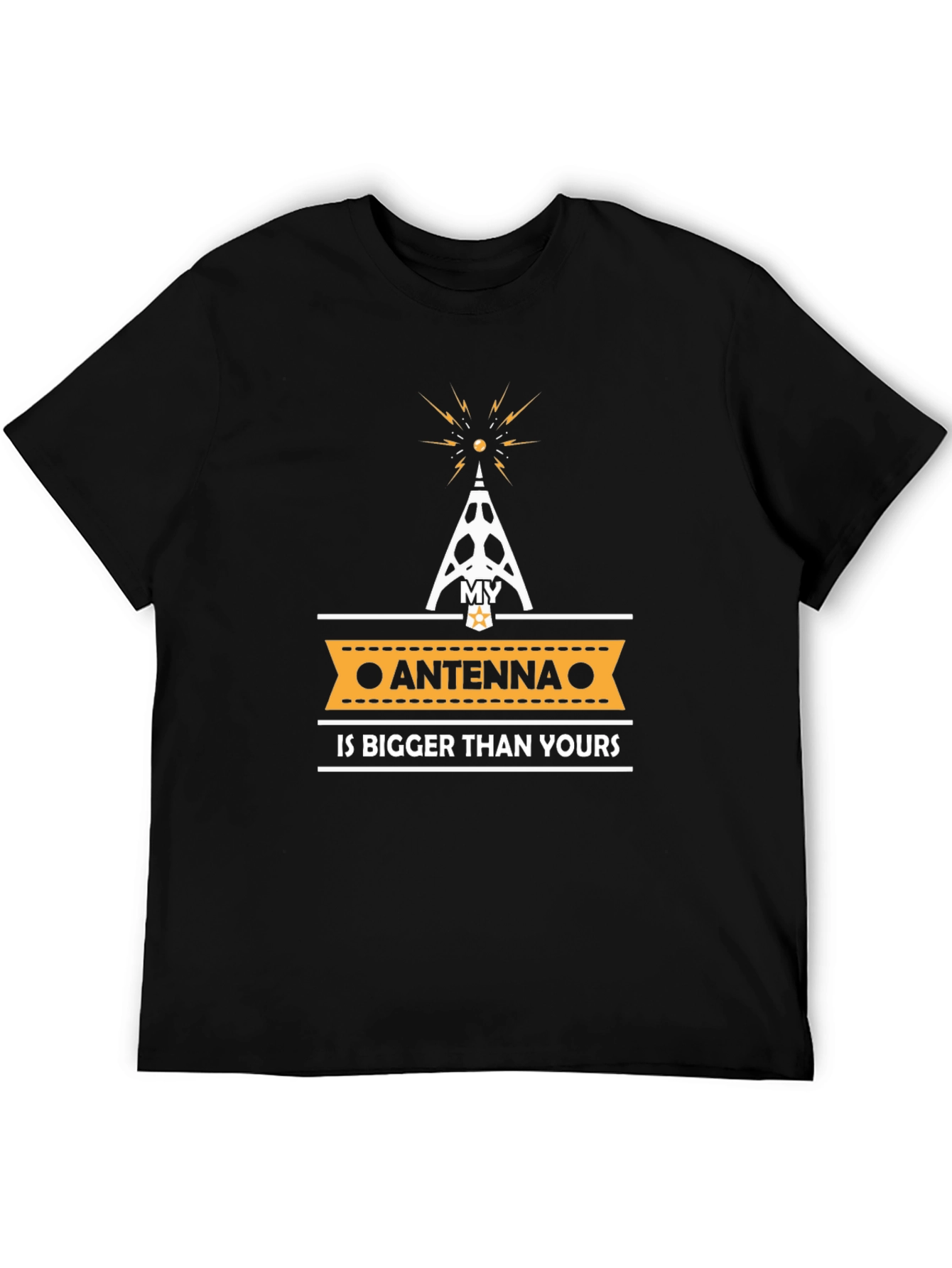 Show off your superior setup with this bold black t-shirt. Featuring a stylized antenna graphic with radiating signals, this tee makes a statement. The design incorporates the cheeky phrase 'My Antenna is Bigger Than Yours', perfect for radio enthusiasts and tech aficionados with a sense of humor. Made from a comfortable-looking fabric, this short-sleeve shirt is ideal for casual wear, meetups, or tech events. Let everyone know you're serious about your signal strength and enjoy the conversations it sparks!