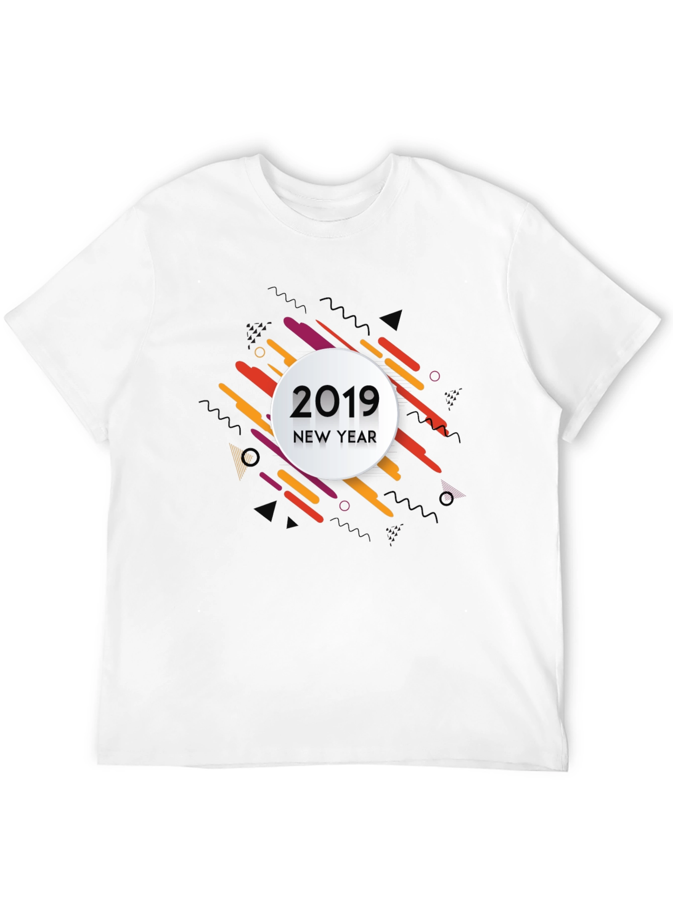 Celebrate in style with this eye-catching black t-shirt featuring a vibrant "2019 New Year" graphic print. The design showcases a modern, abstract pattern with colorful geometric shapes and lines surrounding a central white circle. Made from a soft and comfortable fabric, this tee is perfect for casual wear or New Year's Eve parties. Its versatile style makes it easy to pair with jeans, shorts, or layered under a jacket. Show off your festive spirit with this unique and stylish t-shirt.