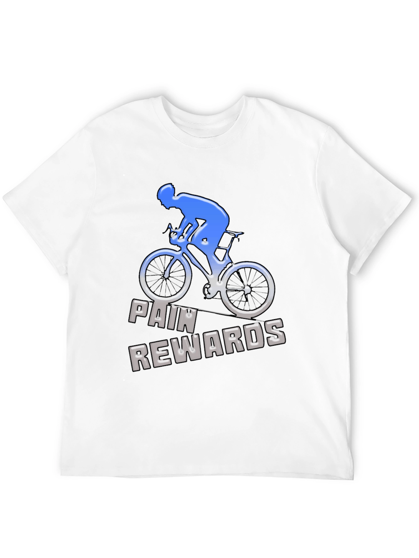 Show off your love for cycling with this stylish black t-shirt. The design features a cyclist and bike in a striking blue and white gradient, accompanied by the motivational text "Pain Rewards" in a bold, 3D-style font. Made from a comfortable-looking material, this tee is perfect for everyday wear or to sport while you're out riding. It's a great way to express your passion for cycling and the rewarding feeling of pushing your limits. Whether you're a casual rider or a dedicated cyclist, this t-shirt is a must-have addition to your wardrobe. Get yours today and wear your dedication!