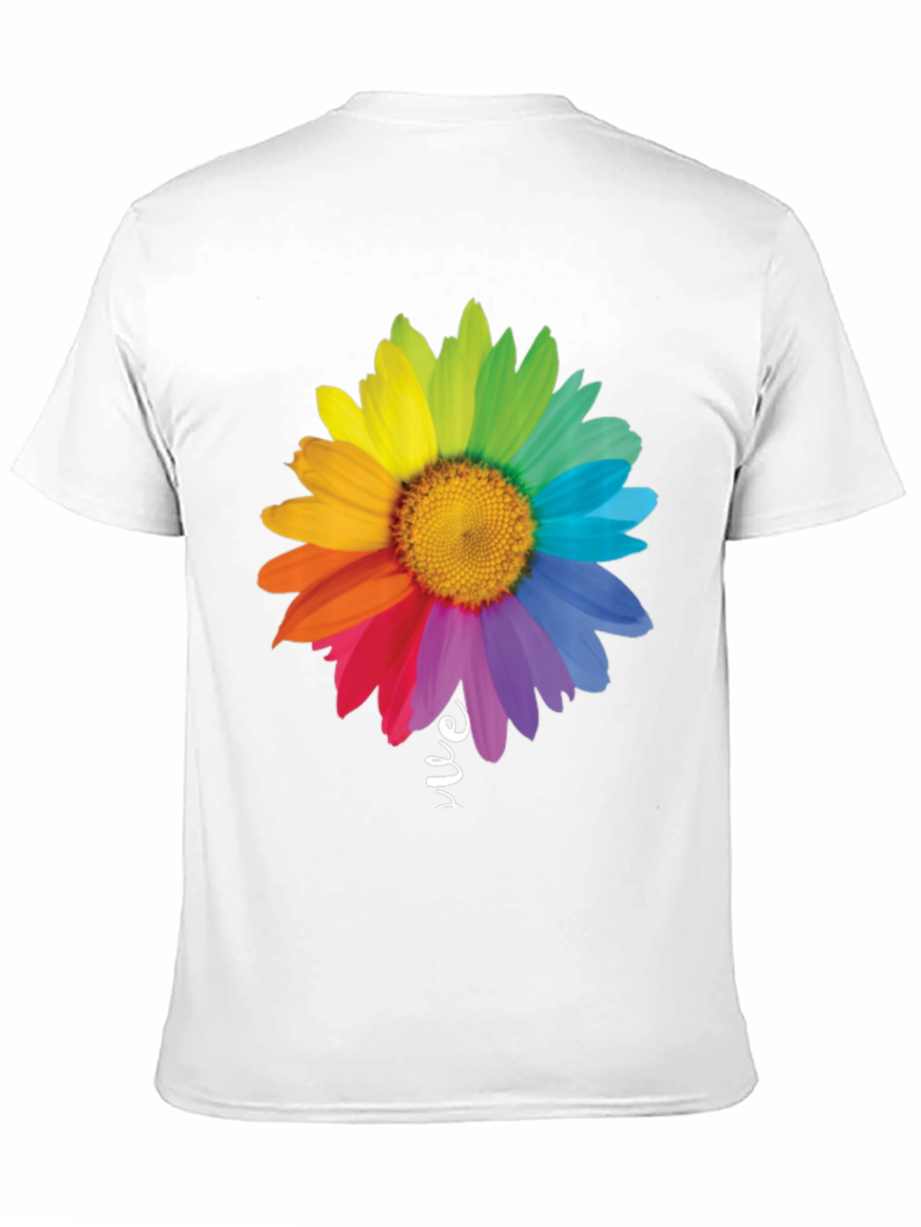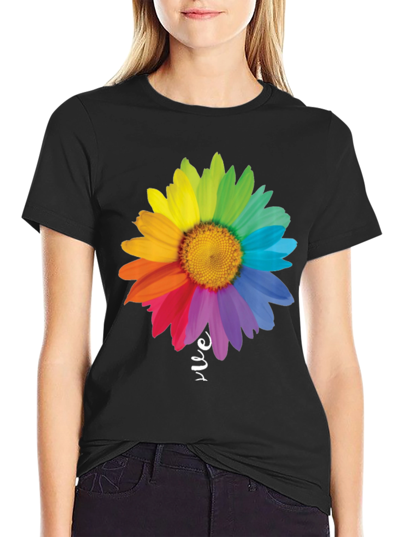 Show your pride with this stylish black T-shirt featuring a vibrant rainbow daisy graphic. The colorful petals blend seamlessly from yellow to purple, radiating positivity. 'Love' is subtly scripted, adding a touch of sweetness. Crafted from a comfortable cotton blend, this tee is perfect for casual wear, pride events, or making a statement. The classic fit and soft fabric ensure all-day comfort, while the eye-catching design guarantees you'll stand out. Dress it up or down, this tee is a versatile addition to any wardrobe. Express yourself with this unique and uplifting design!
