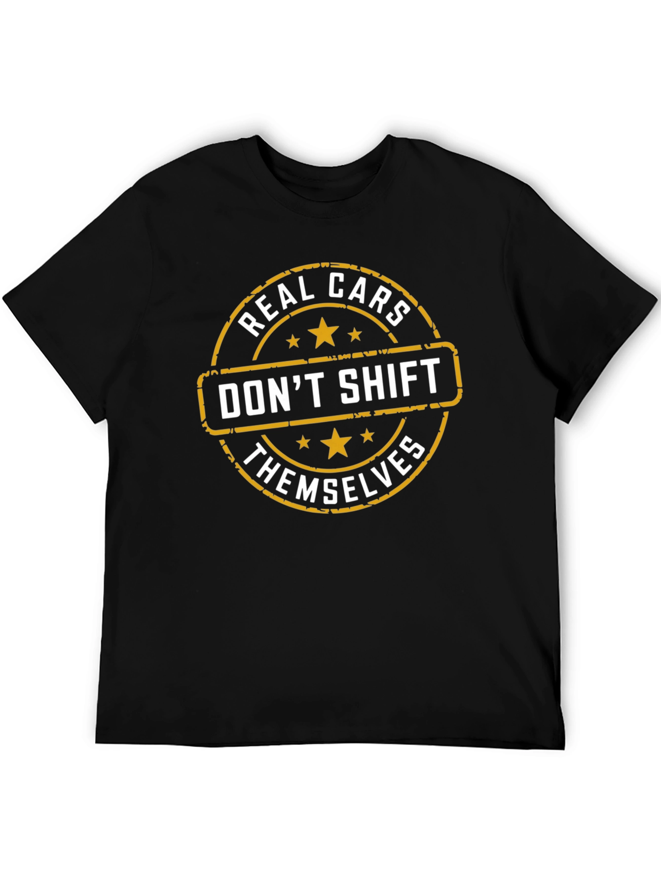 Show your love for classic cars with this stylish black t-shirt. The design features a golden yellow emblem with the bold statement "Real Cars Don't Shift Themselves," perfect for car enthusiasts who appreciate manual transmissions. The high-quality print ensures that the message stays crisp and clear. Made from comfortable fabric, this shirt is ideal for casual wear, car meets, or as a statement piece in your everyday wardrobe. Let everyone know you prefer the real feel of driving with this unique t-shirt.