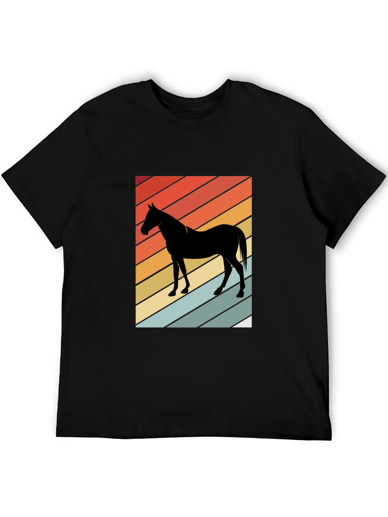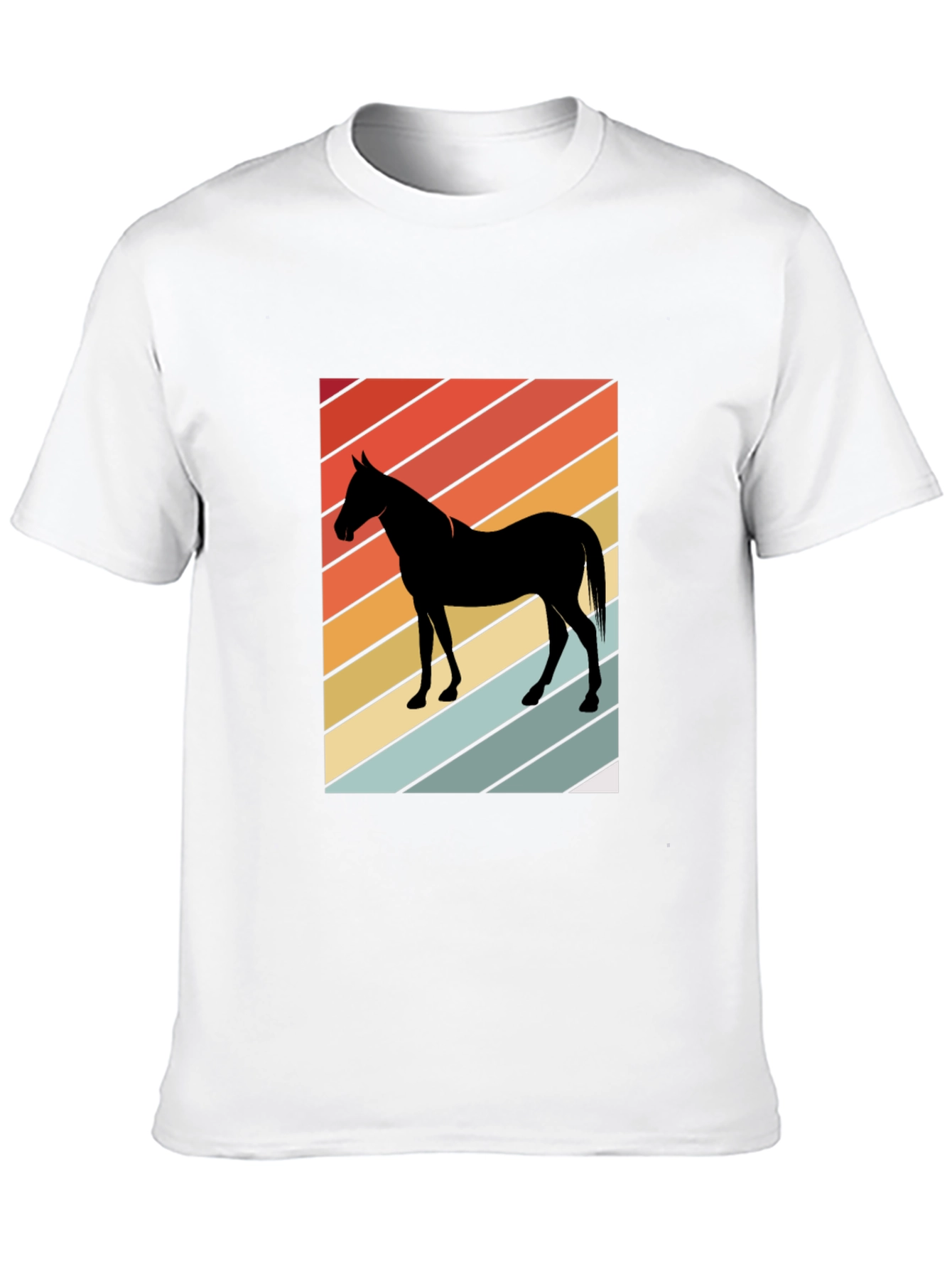 This stylish black t-shirt features a striking retro horse graphic, perfect for casual wear or making a statement. The design incorporates a silhouette of a horse set against a vibrant, striped background reminiscent of vintage aesthetics. Made from a comfortable-looking fabric, this shirt appears to be ideal for everyday wear. The classic fit complements a variety of body types, making it a versatile addition to any wardrobe. Wear it to casual outings, equestrian events, or simply as a cool piece to express your love for horses and retro design. A must-have for horse lovers and vintage style enthusiasts alike.