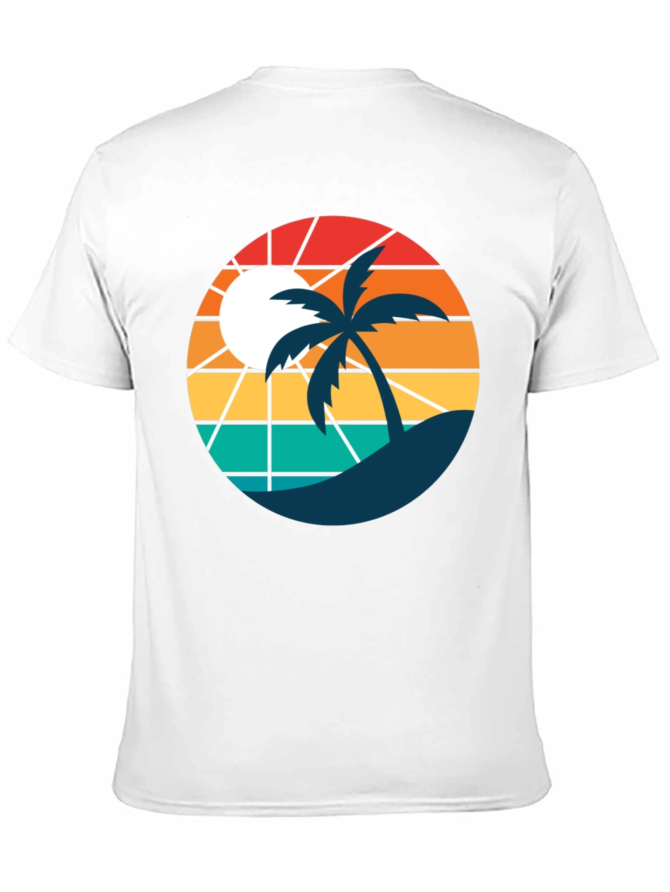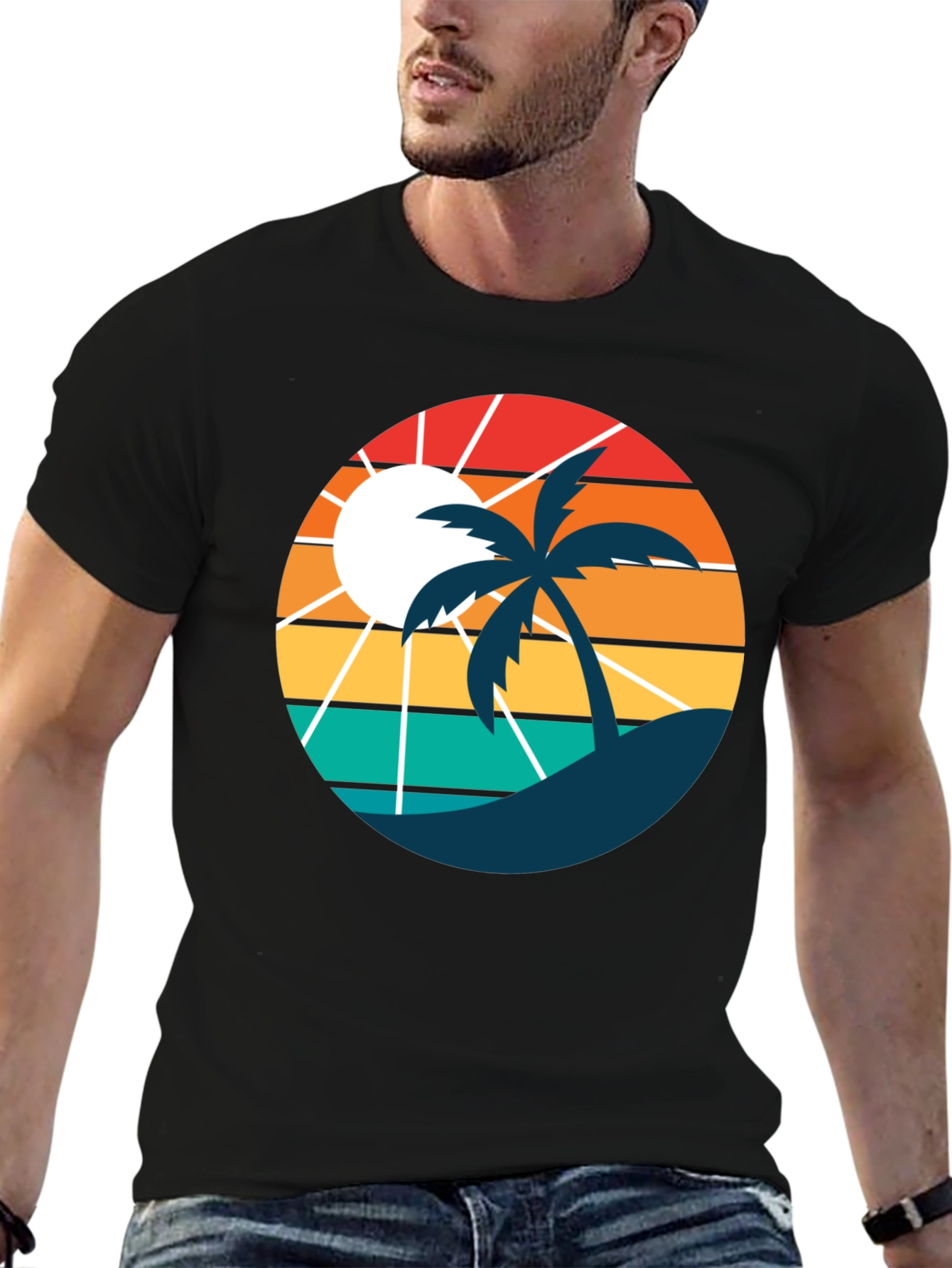 Embrace the island vibes with this stylish black t-shirt. Featuring a vibrant retro sunset design, complete with a palm tree silhouette, this tee is perfect for adding a touch of vacation to your everyday look. The design incorporates a spectrum of warm colors from red and orange to yellow, balanced by cool tones of turquoise and navy, creating a visually appealing contrast. Made from a comfortable, breathable fabric, this t-shirt is ideal for casual outings, beach trips, or simply relaxing at home. Stand out with this unique and eye-catching tee!