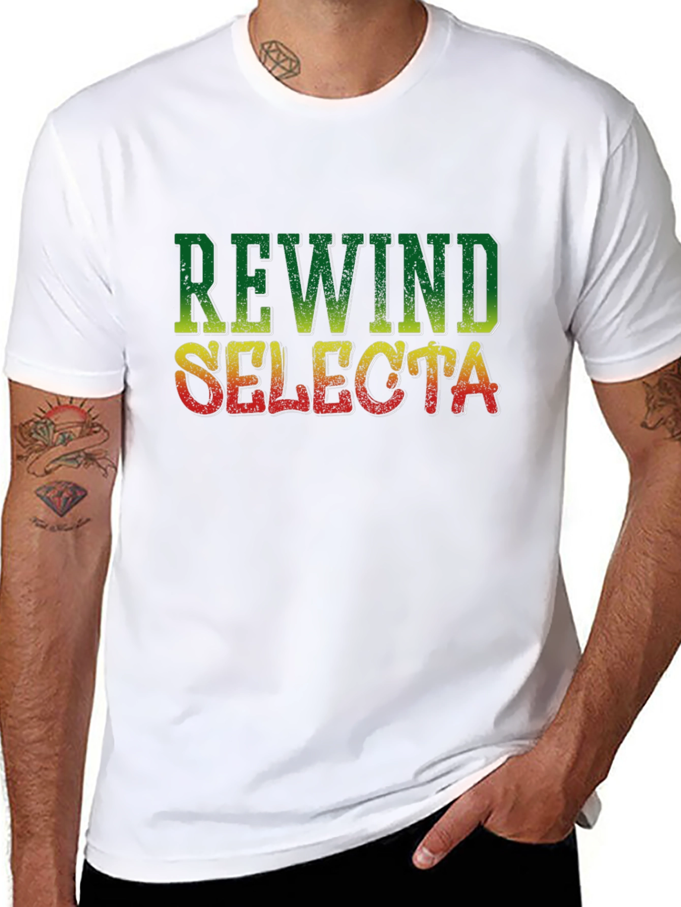 Show off your love for reggae music with this stylish black T-shirt. Featuring the words "REWIND SELECTA" in vibrant green, yellow, and red Rasta colors, this shirt is perfect for music lovers. The classic crew neck and comfortable fit make it ideal for casual wear, concerts, or festivals. Let everyone know you are a reggae fan with this standout graphic tee. Made with soft, breathable fabric for all-day comfort. A great addition to your wardrobe!