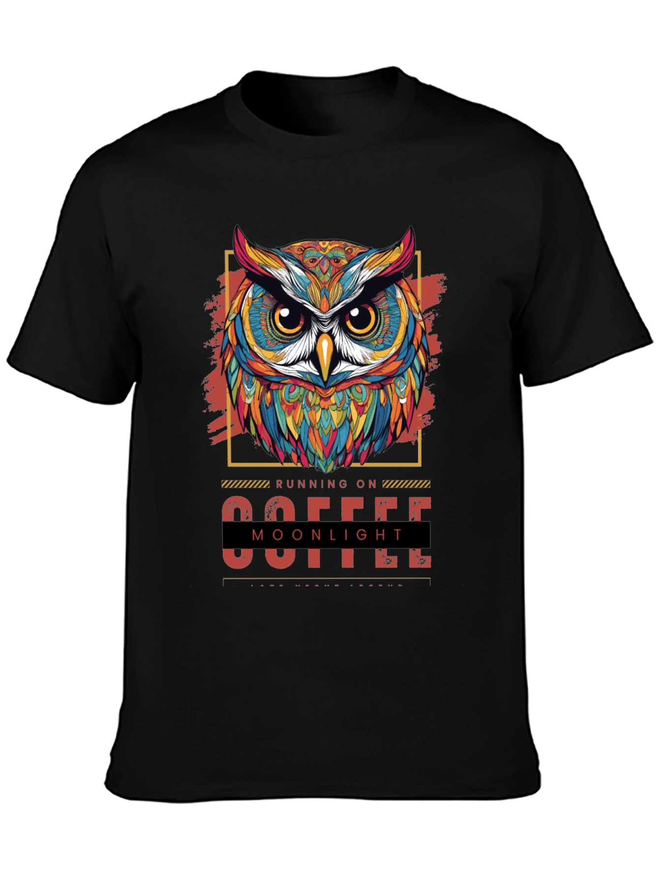 Show off your love for coffee and owls with this unique graphic t-shirt! This black tee features a vibrant, colorful owl design with the words "Running on Coffee and Moonlight." The intricate details of the owl's feathers and its captivating gaze will make you stand out. Perfect for coffee lovers, owl enthusiasts, or anyone who appreciates a touch of whimsy in their wardrobe. Made from comfortable, breathable material, this shirt is ideal for everyday wear. Pair it with jeans, shorts, or a skirt for a casual and stylish look. It's a great conversation starter and a fun way to express your personality. Get yours today!