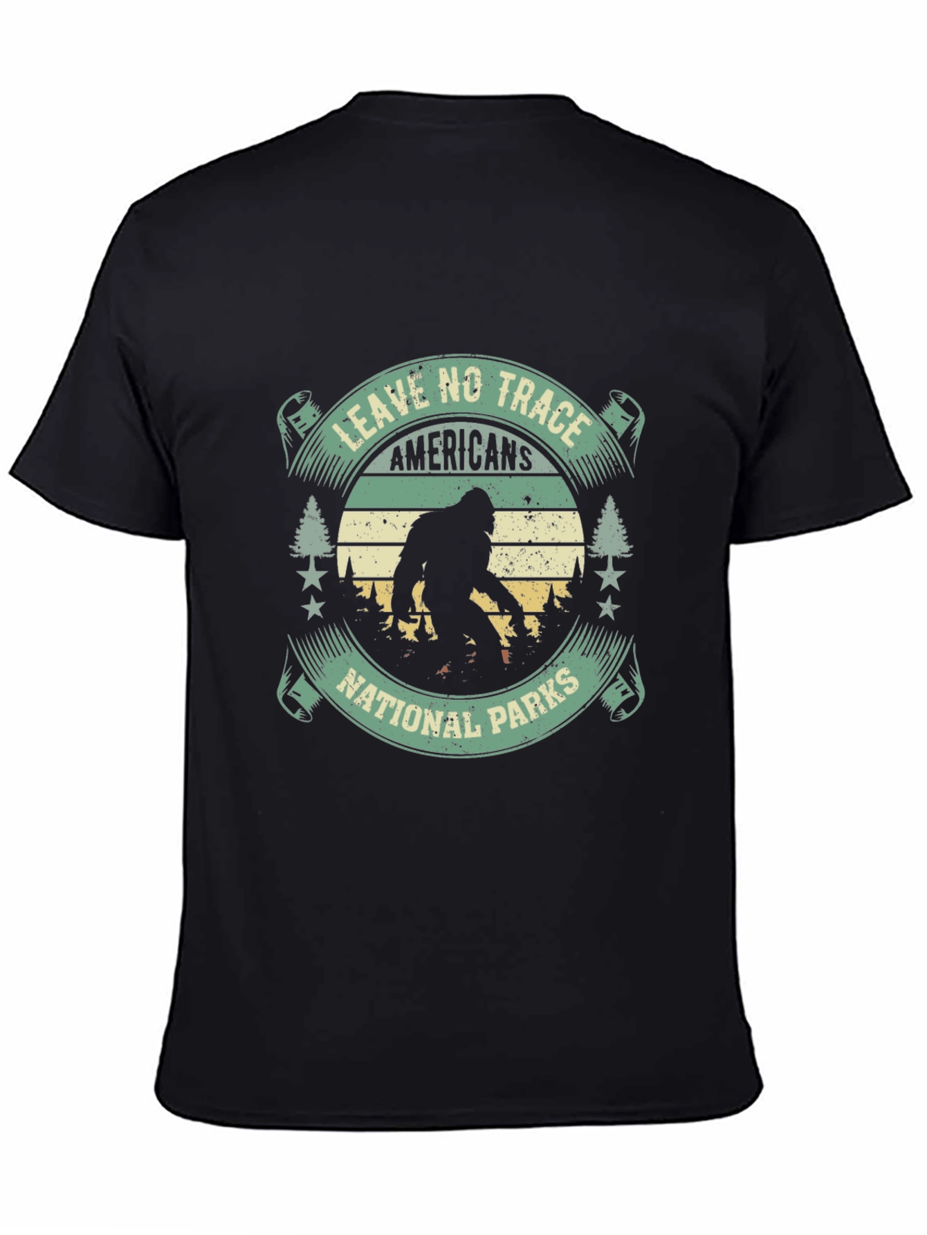 Show off your love for the great outdoors with this unique black t-shirt! Featuring a cool graphic design with the words "Leave No Trace Americans National Parks" in a vintage-inspired font, and a silhouette of Bigfoot in the middle of a forest, this shirt is perfect for outdoor enthusiasts, hikers, campers, and adventurers. Made from soft, breathable material, this tee will keep you comfortable on all your escapades. It's a great way to express your passion for nature and American national parks. Grab yours today and make a statement wherever you go!