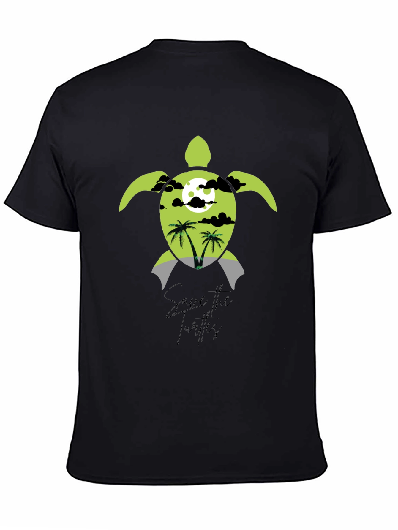 Show your support for marine life with this eye-catching black t-shirt featuring a unique turtle graphic. The design incorporates a vibrant green turtle silhouette filled with a serene night scene, including palm trees, a full moon, and clouds. Below the turtle, the phrase "Save the Turtles" is elegantly displayed in script. Crafted from a comfortable fabric, this tee is perfect for casual wear, environmental awareness events, or as a thoughtful gift for ocean lovers. Make a statement and help raise awareness with this stylish and meaningful t-shirt.