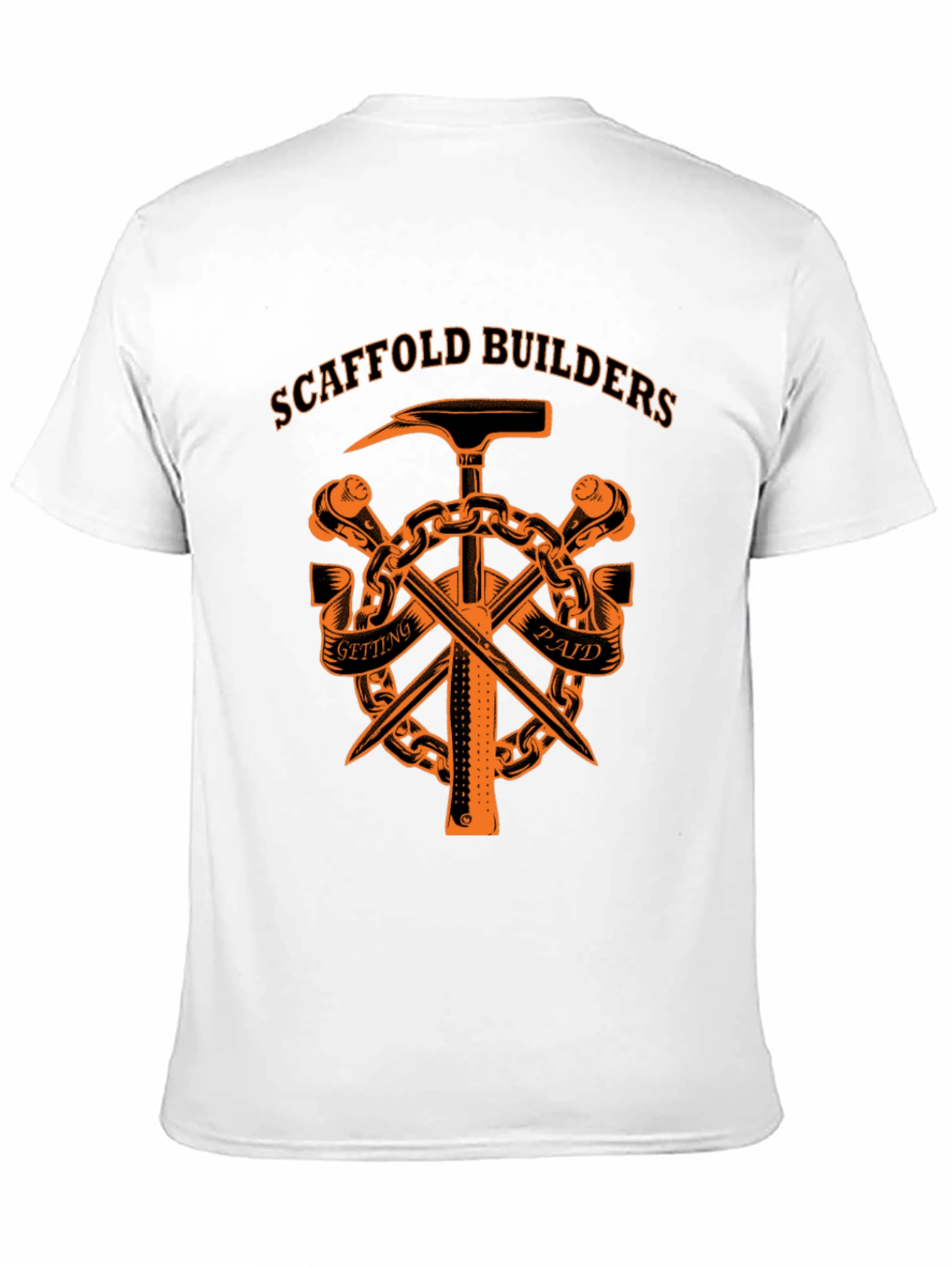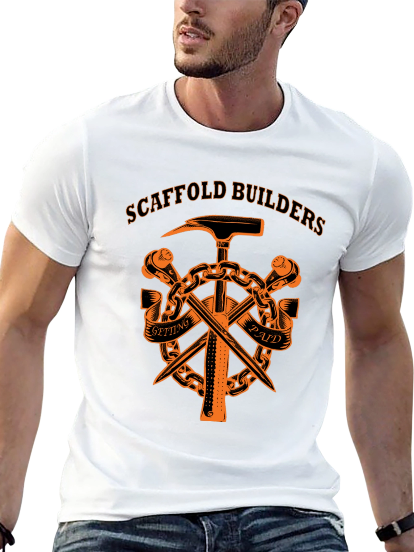 Showcase your pride with this Scaffold Builders graphic tee. This black t-shirt features a bold orange design including construction tools, chains, and a banner that reads "Getting Paid." The text "Scaffold Builders" is prominently displayed across the top. Ideal for construction workers and anyone in the scaffolding industry, this shirt is a perfect way to express your passion. Made from comfortable materials, this tee is suitable for everyday wear, whether on the job site or casually hanging out. Grab this unique graphic tee and make a statement!