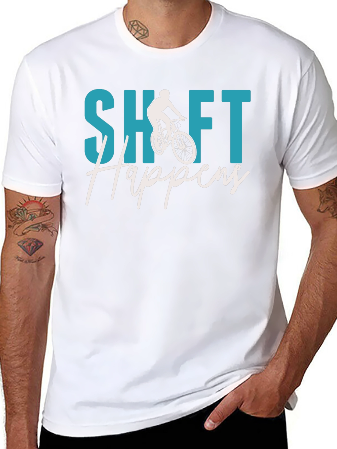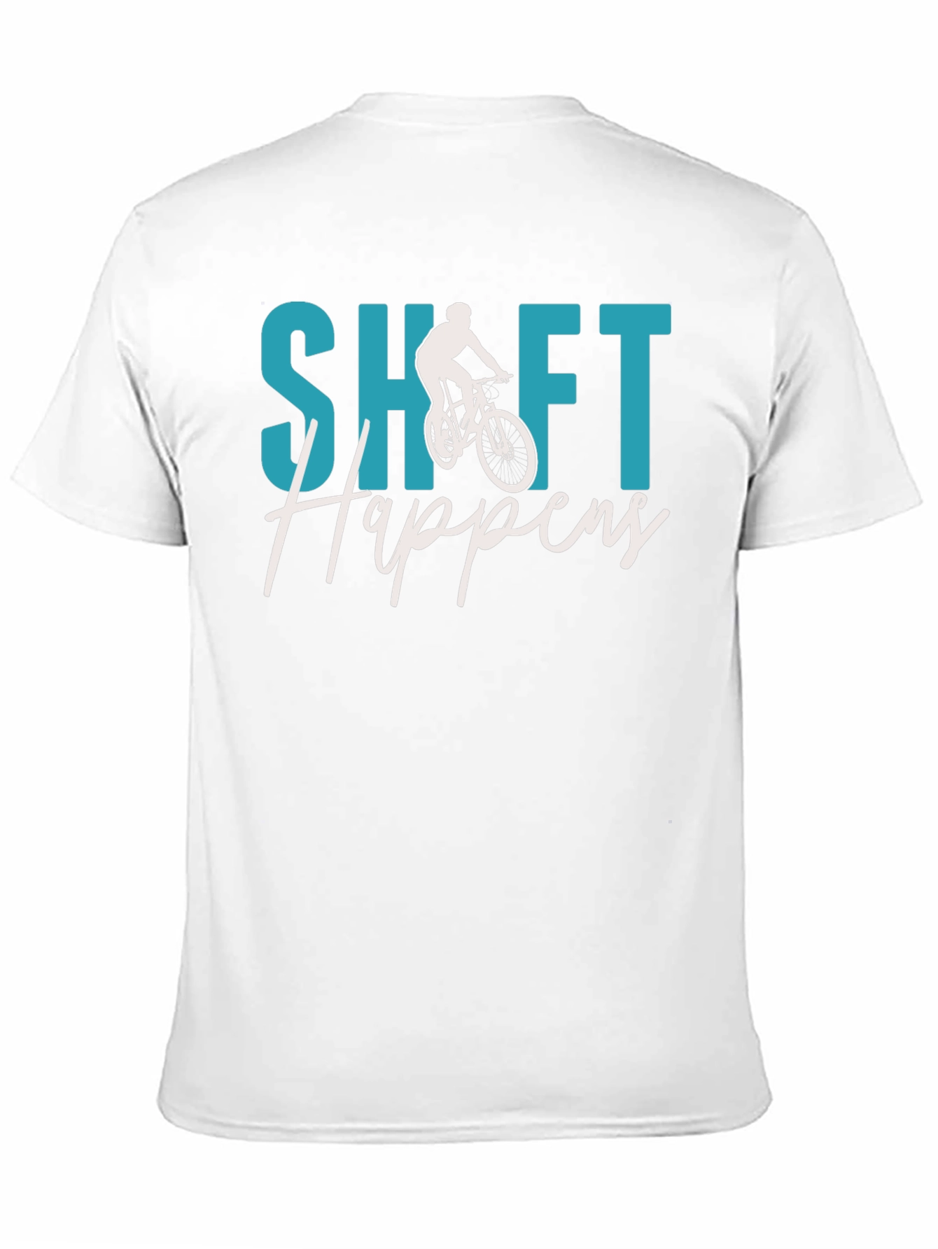 Embrace your love for cycling with this eye-catching black t-shirt. Featuring a playful design with the phrase "Shift Happens" in a stylish font, this tee is perfect for biking enthusiasts. A cyclist silhouette is integrated into the design, adding to its sporty appeal. Made from a comfortable fabric, this tee is ideal for casual wear, biking adventures, or as a fun gift for the cyclist in your life. Show off your passion for biking with this unique and trendy t-shirt.