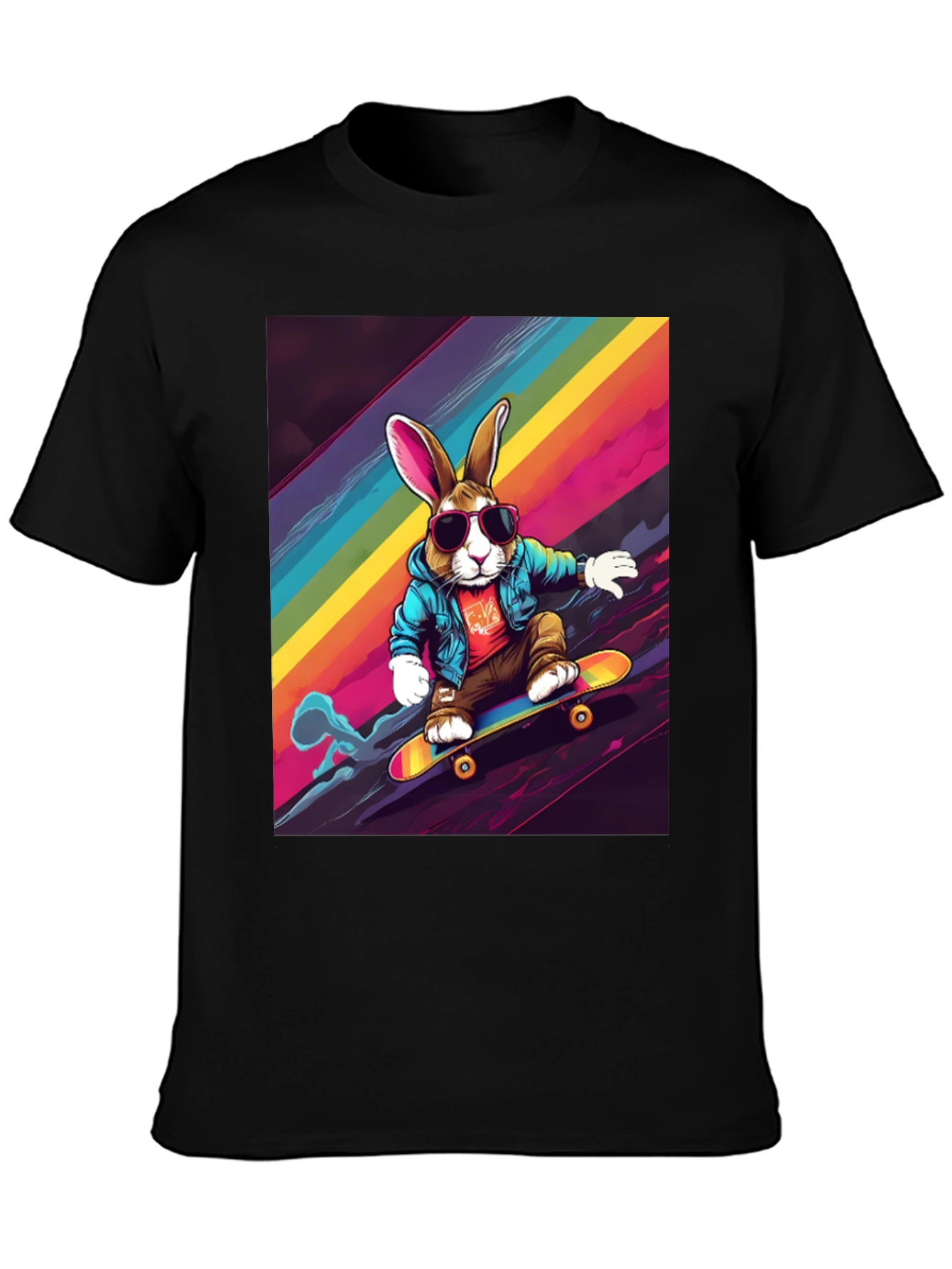 Rock this eye-catching black t-shirt featuring a vibrant skateboarding bunny graphic! This unique tee showcases a cool bunny character sporting sunglasses and a denim jacket, riding a skateboard against a striking rainbow background. The bold colors and playful design make this t-shirt a fun and stylish statement piece. Perfect for casual wear, skateboarding enthusiasts, or anyone who loves a touch of whimsy. Made from a comfortable, breathable fabric, this tee will keep you looking and feeling great all day long. Add some personality to your wardrobe with this one-of-a-kind skateboarding bunny t-shirt!