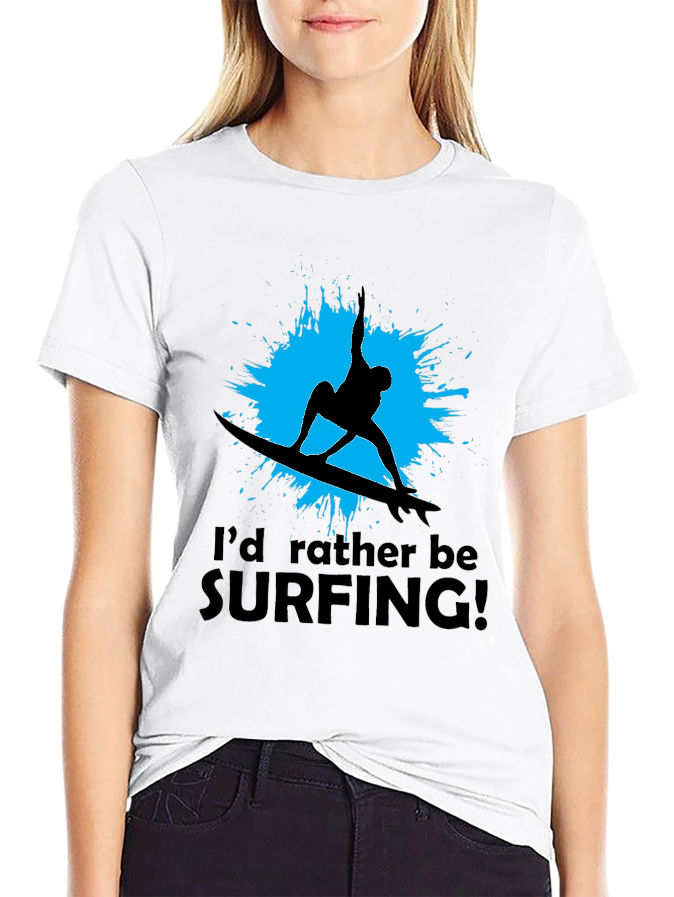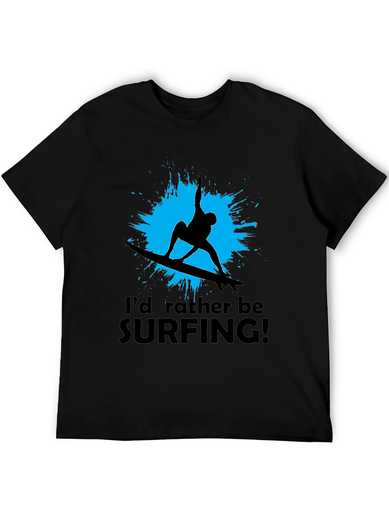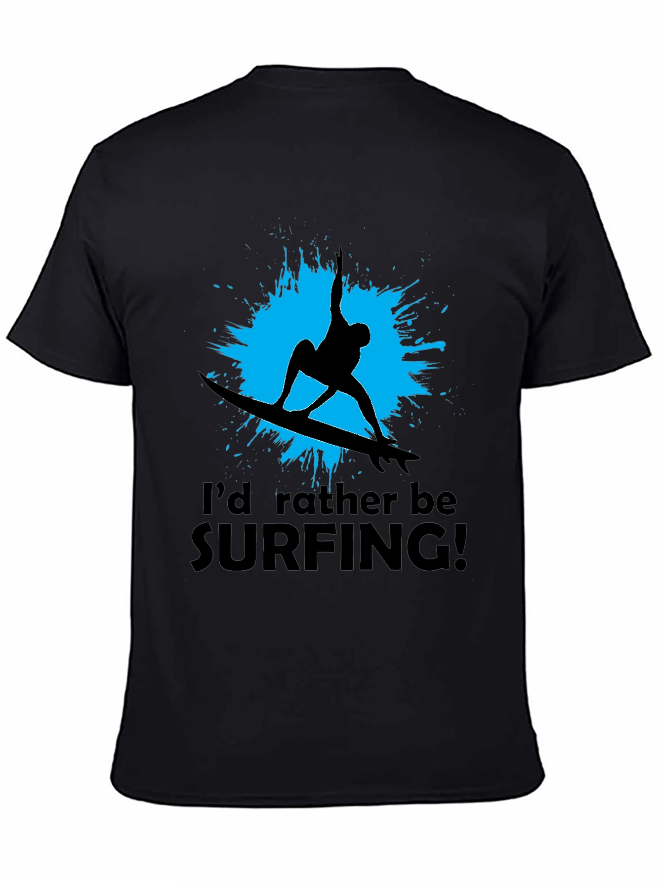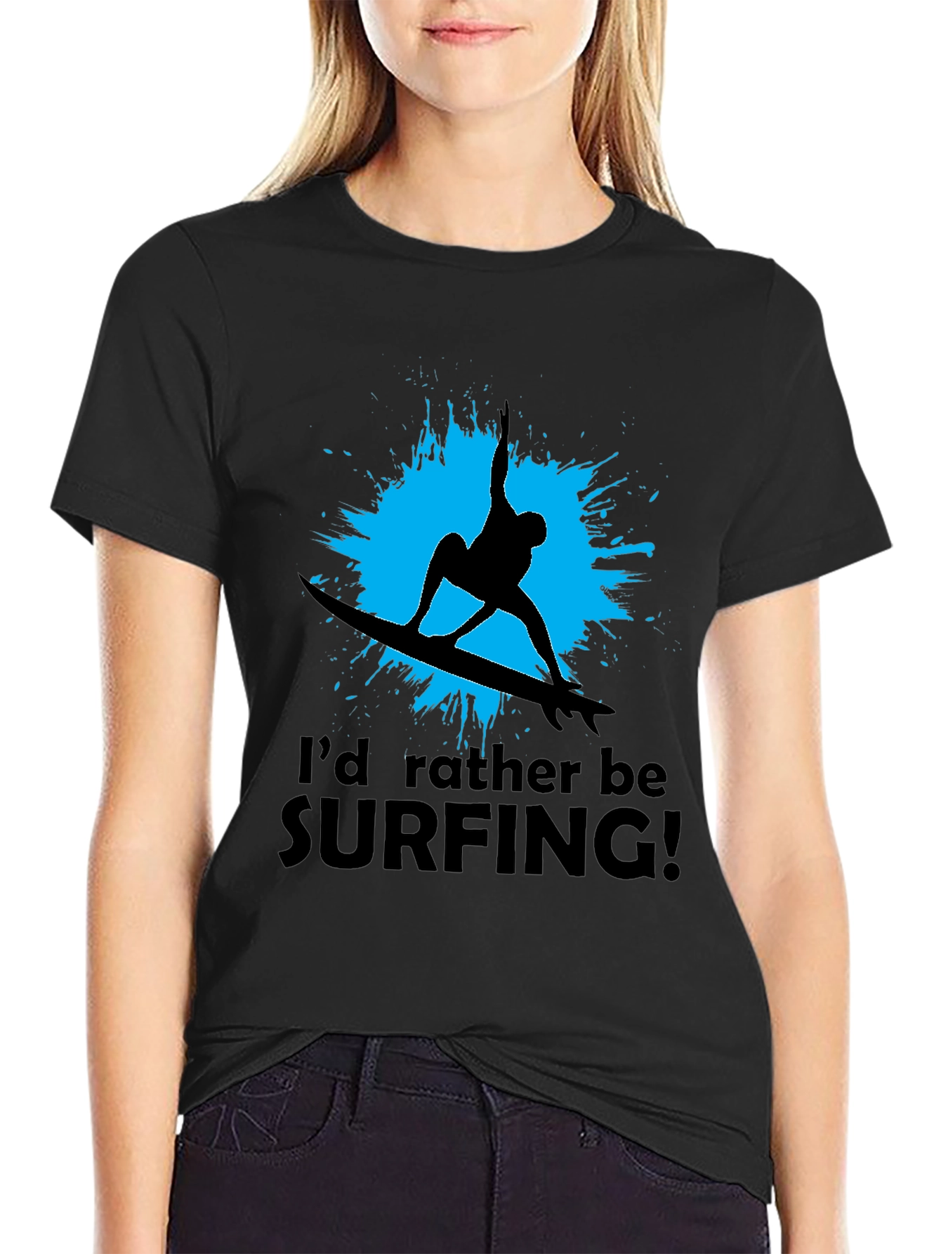 Catch the wave with this cool black t-shirt featuring a surfer silhouette against a vibrant blue splash design. The bold statement "I'd rather be SURFING!" captures the spirit of adventure and love for the ocean. Made from comfortable fabric, this tee is perfect for casual outings, beach days, or simply expressing your passion for surfing. The eye-catching graphic print adds a unique touch, making it a great conversation starter. Ideal for surfers, beach lovers, and anyone who enjoys a relaxed, stylish look. Get yours today and let everyone know where you'd rather be!